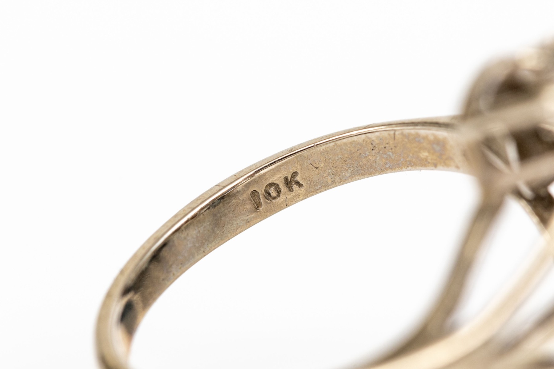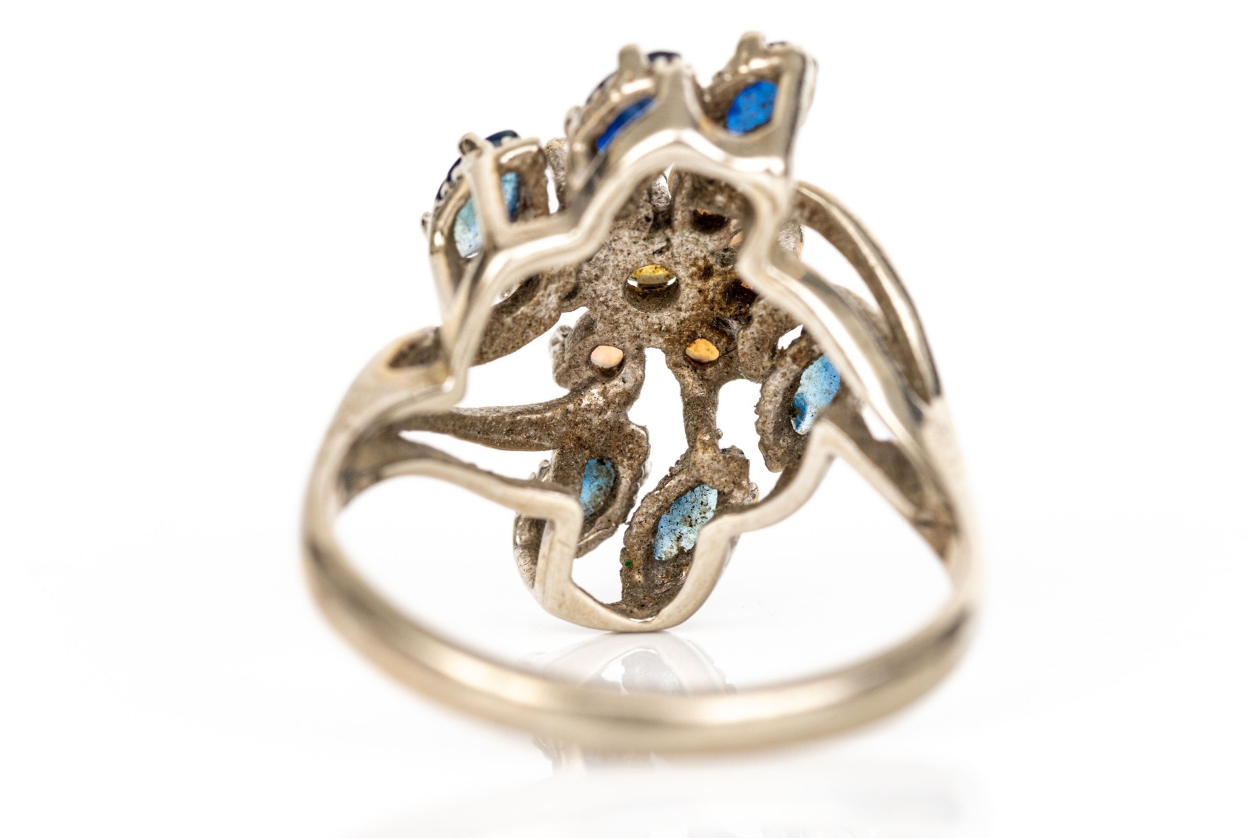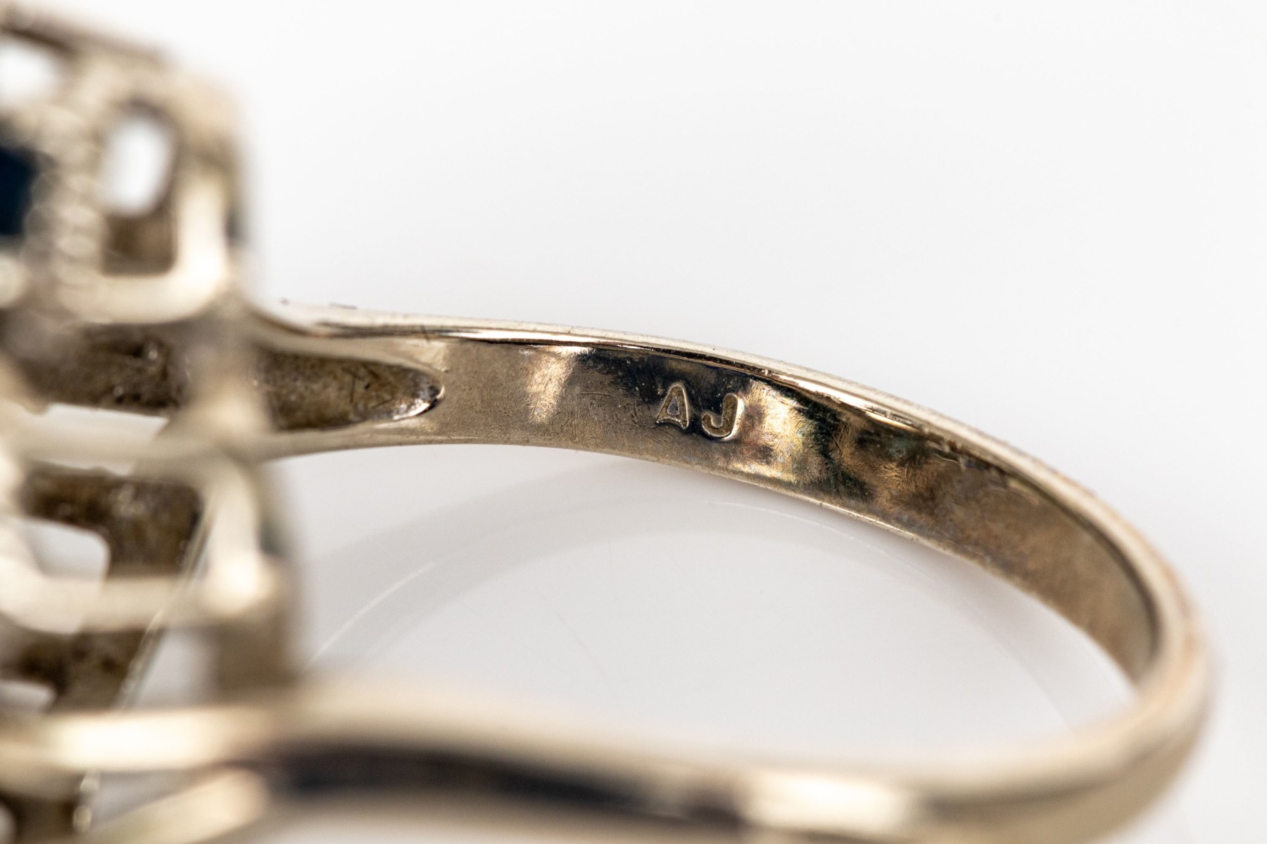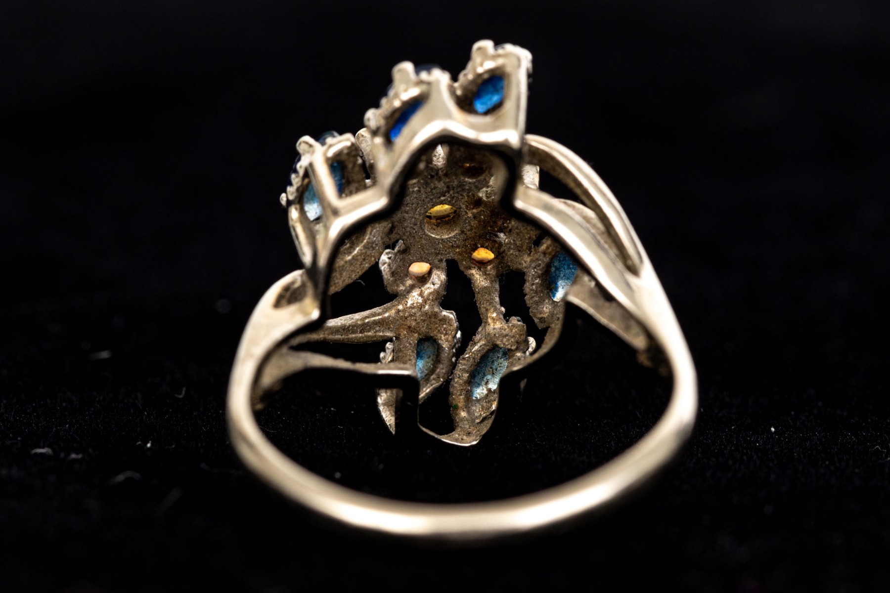 10k white gold vintage opal and blue sapphire cluster ring, size 6.75. This striking ring features a center cluster of round white opals, decorated with a border of marquise shaped blue sapphires, app. 0.24 TCW, prong set