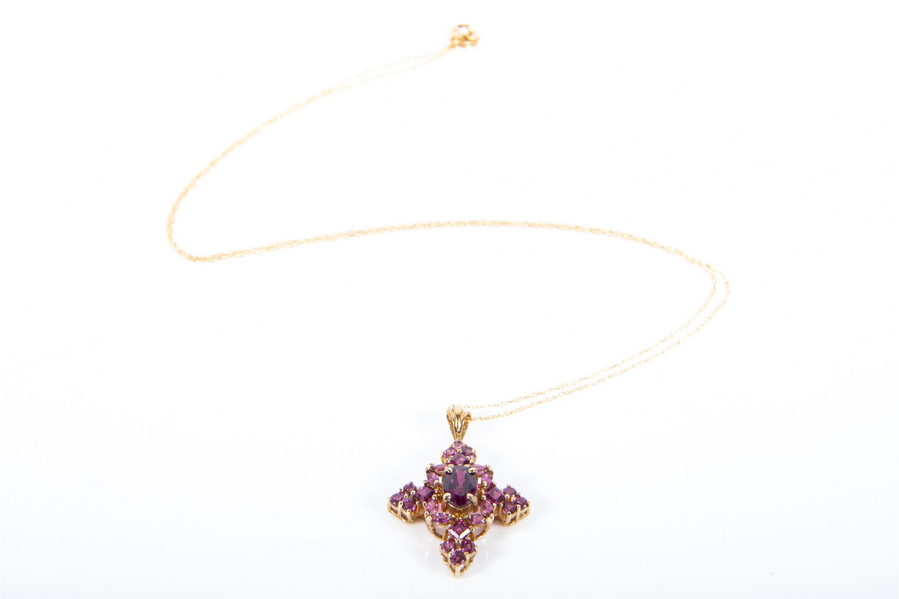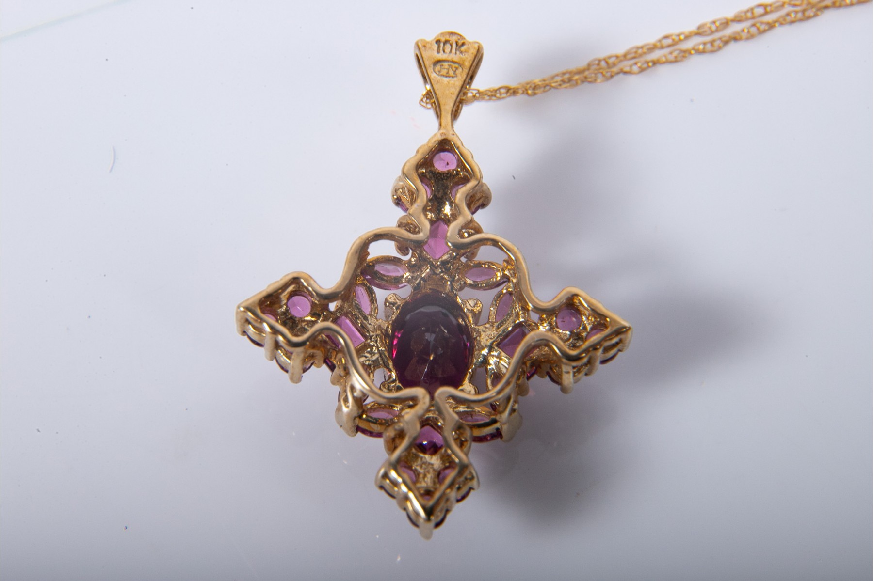 Beautiful necklace displaying a starburst or cross-shaped pendant with clusters of round, square, and marquise amethysts around a central oval amethyst in pretty berry purple hues. The pendant is topped with an elegantly ribbed triangular bail, hanging from a fine double-link cable chain.