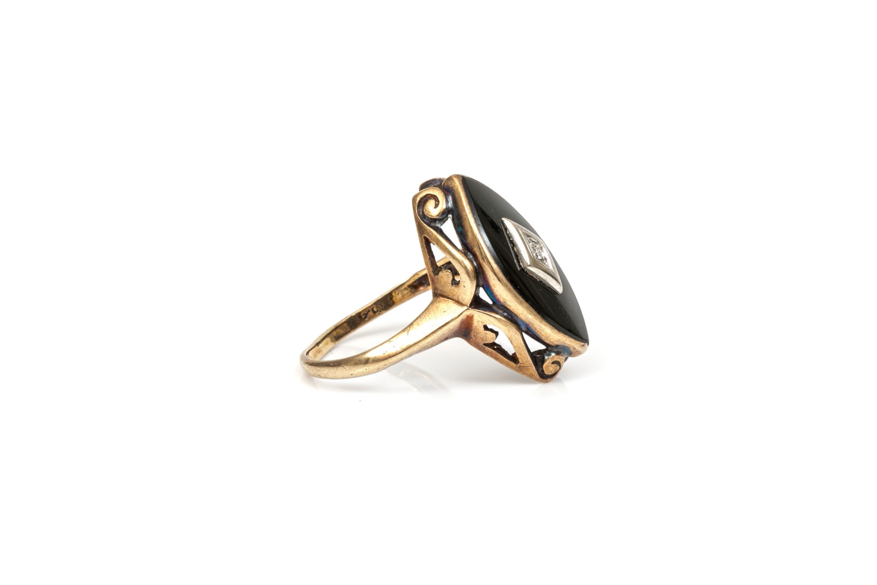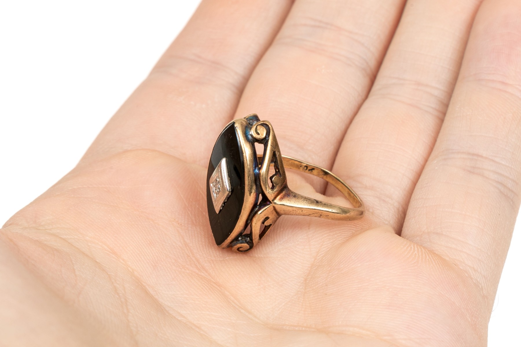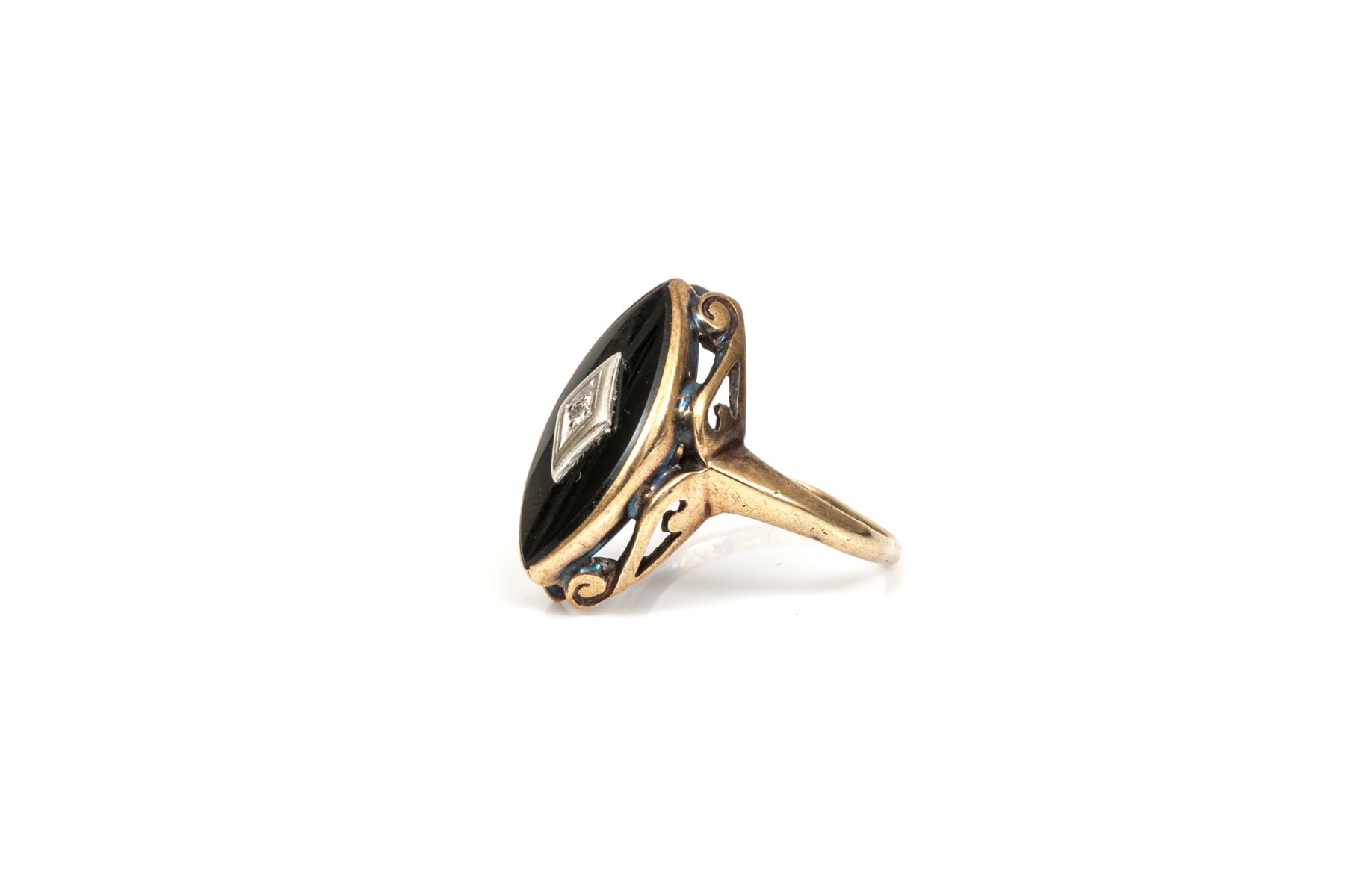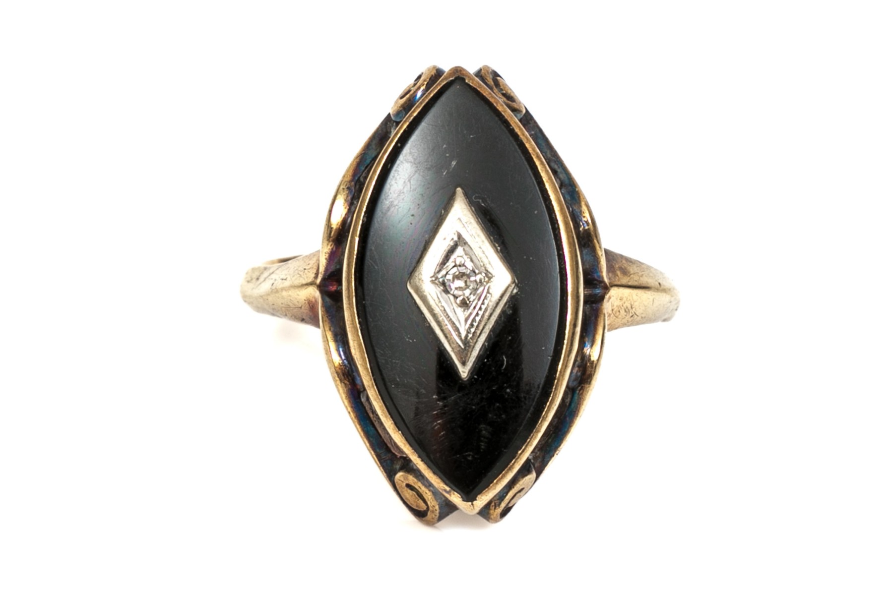 10k yellow gold antique navette profile black onyx ring, size 7.25, diamond center, app. 0.01 CTS