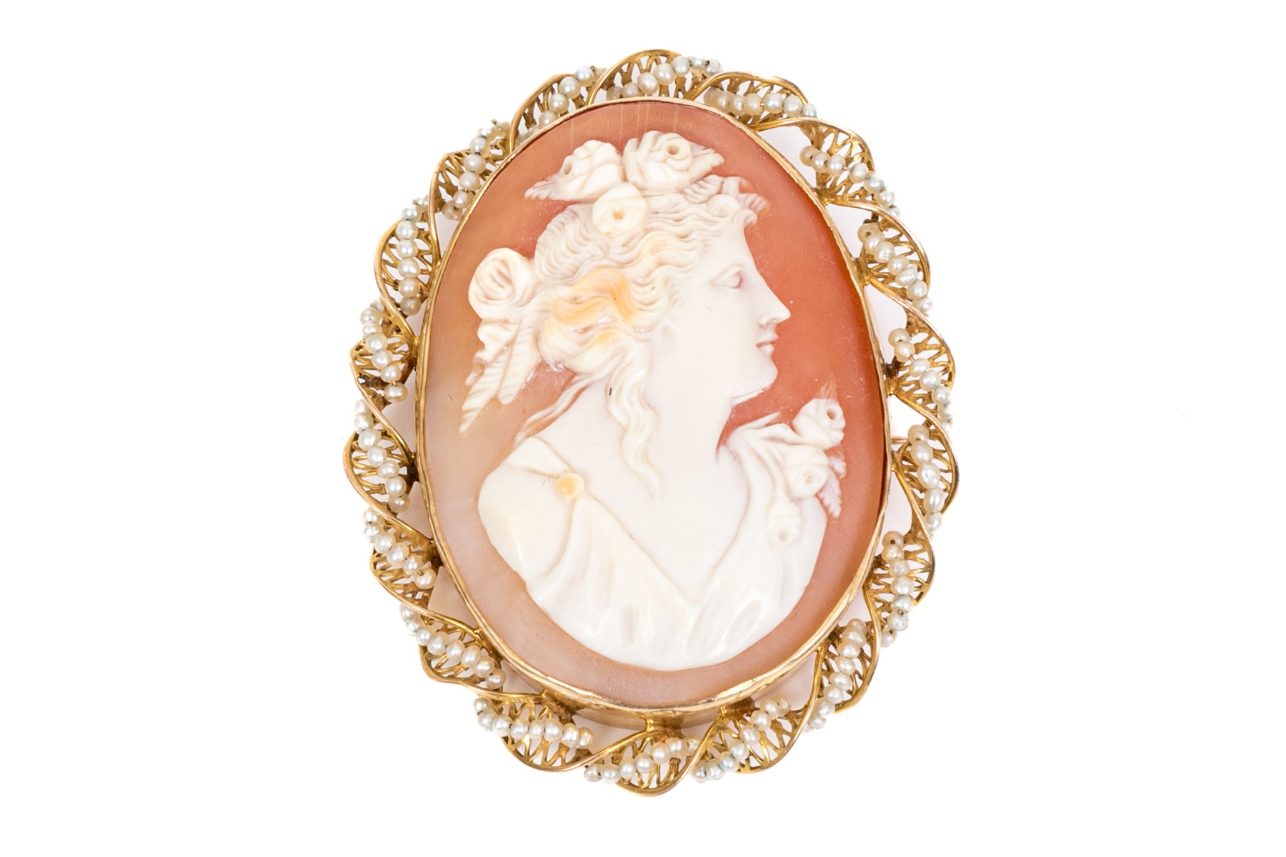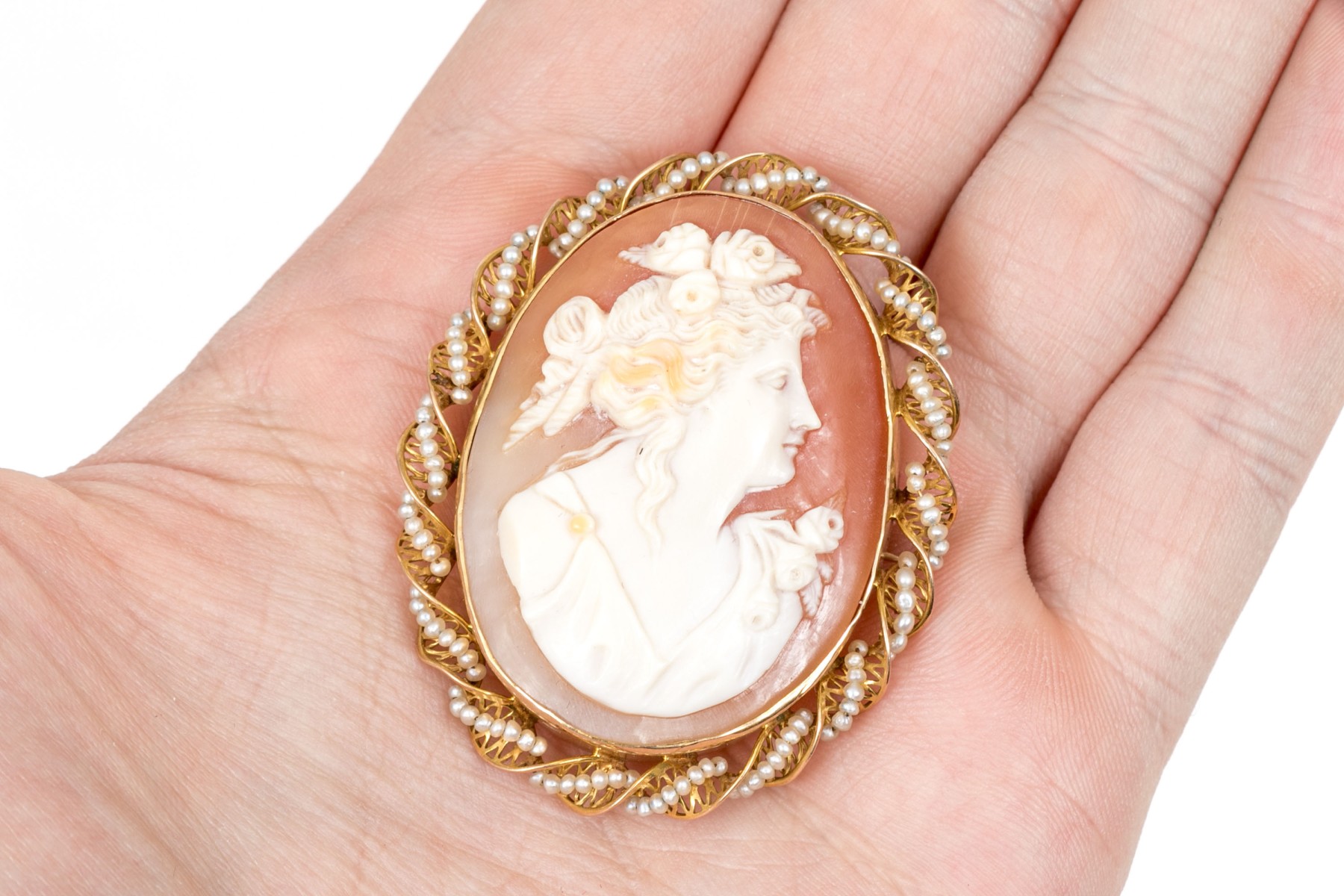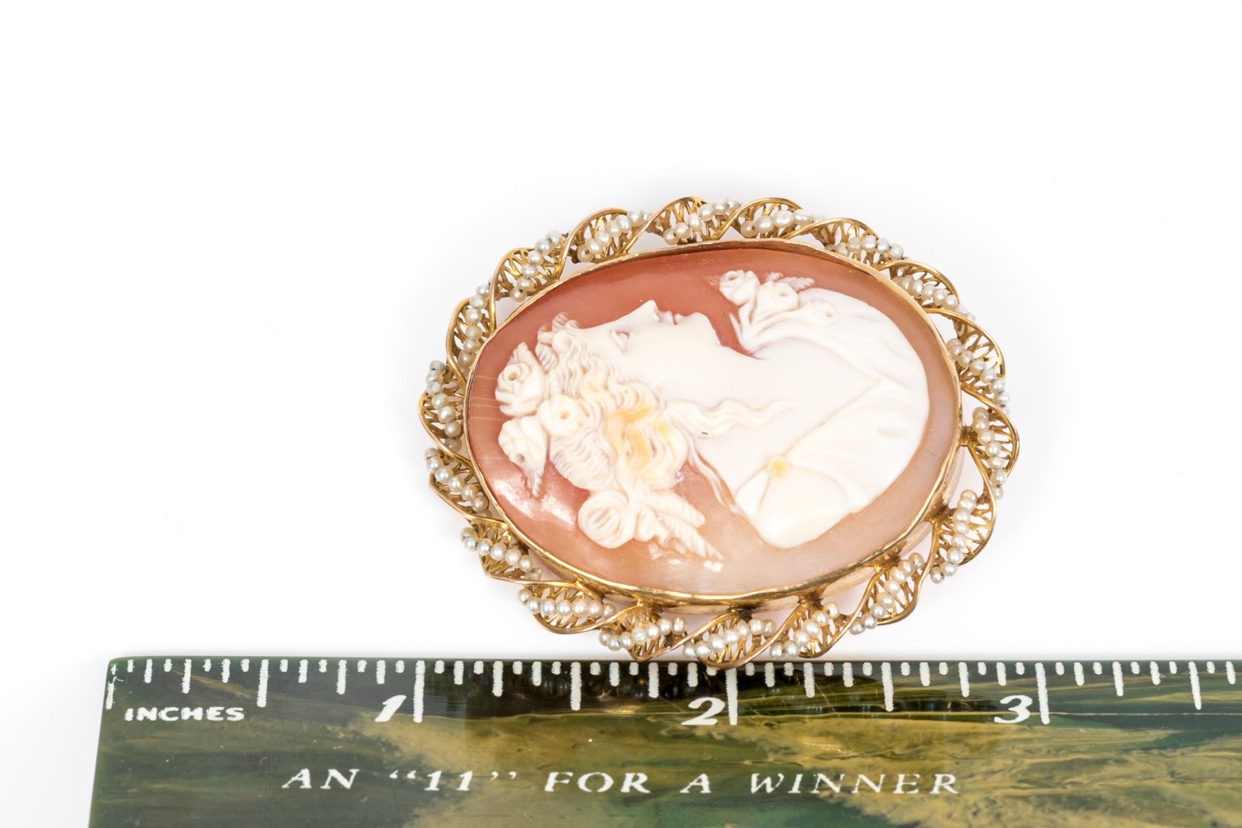 10k yellow gold beautiful vintage seed pearl and spiral framed cameo brooch