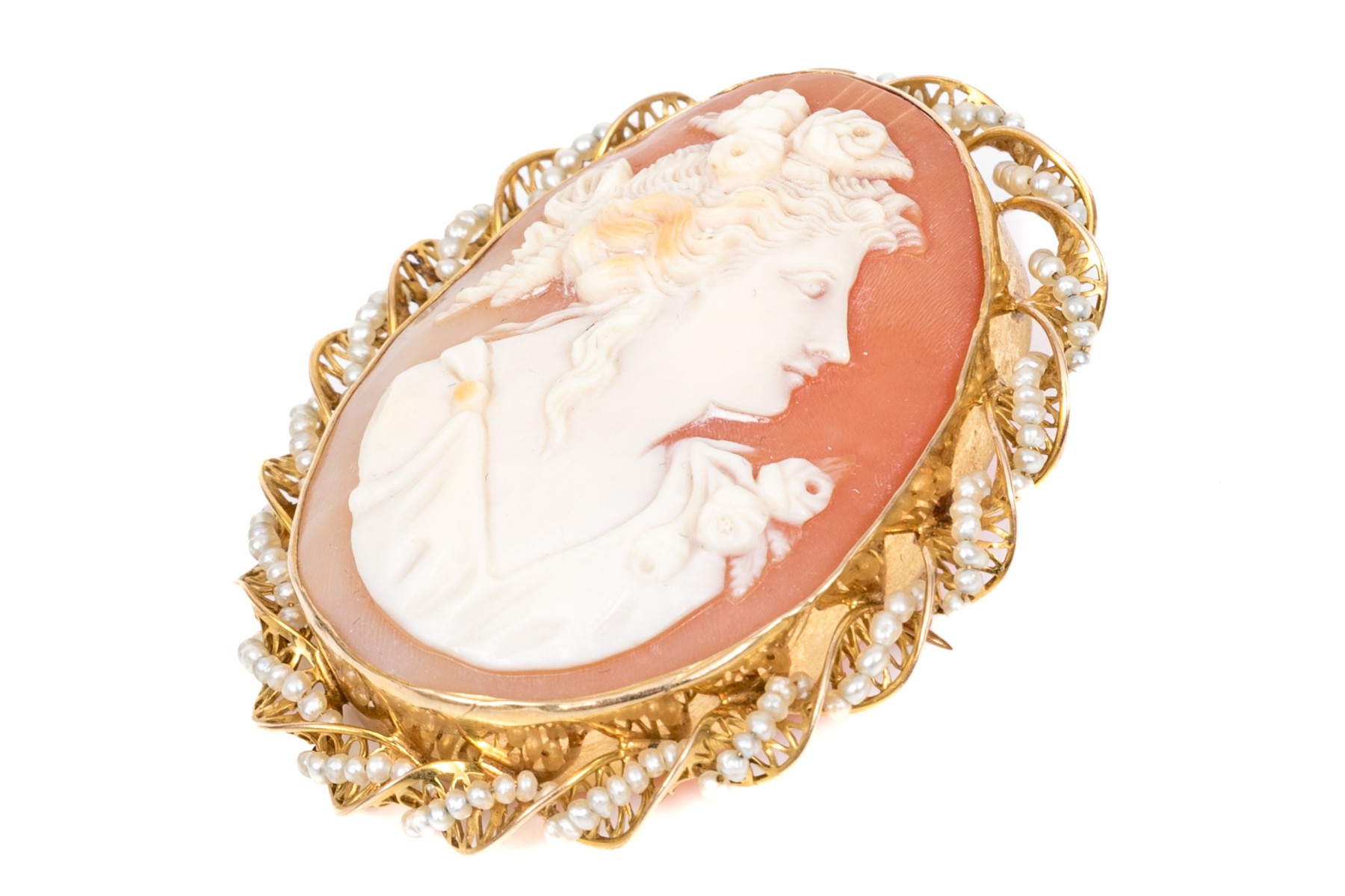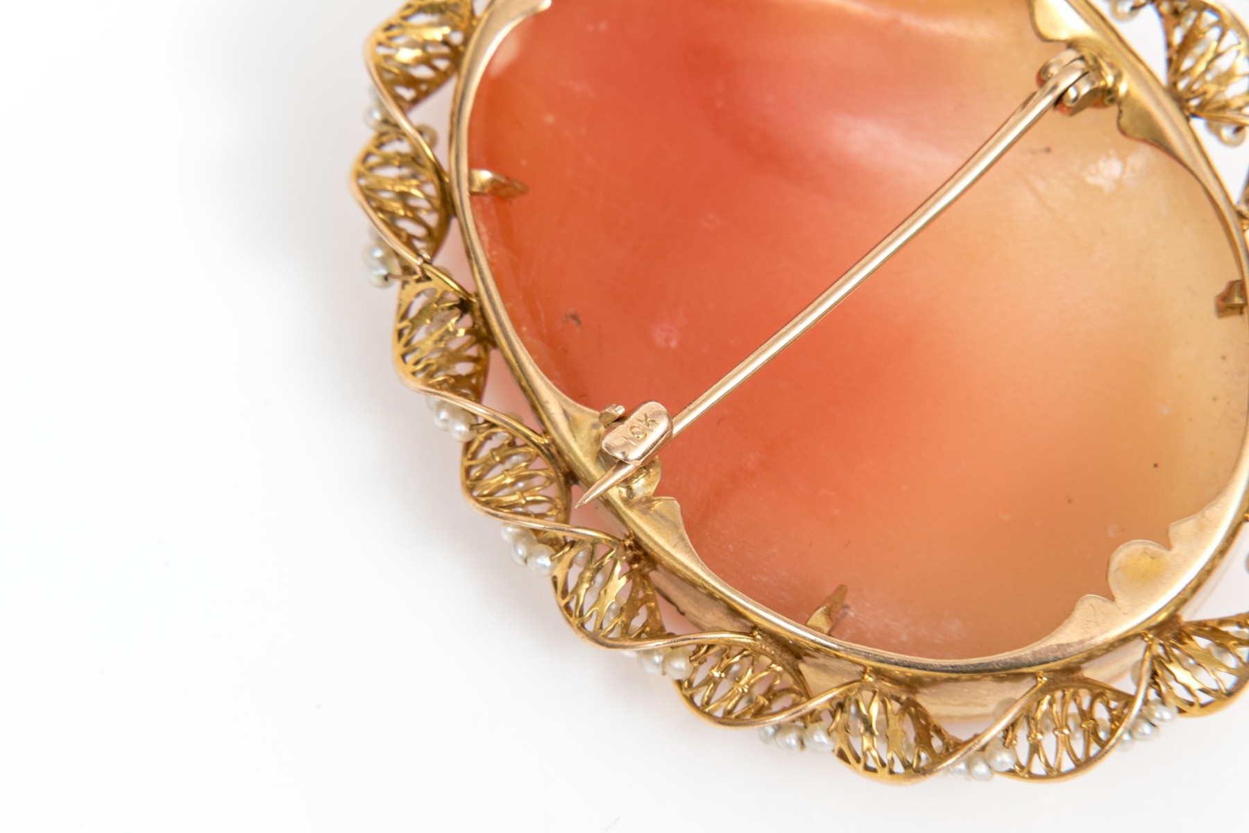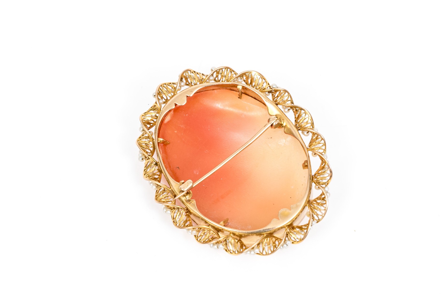 10k yellow gold beautiful vintage seed pearl and spiral framed cameo brooch
