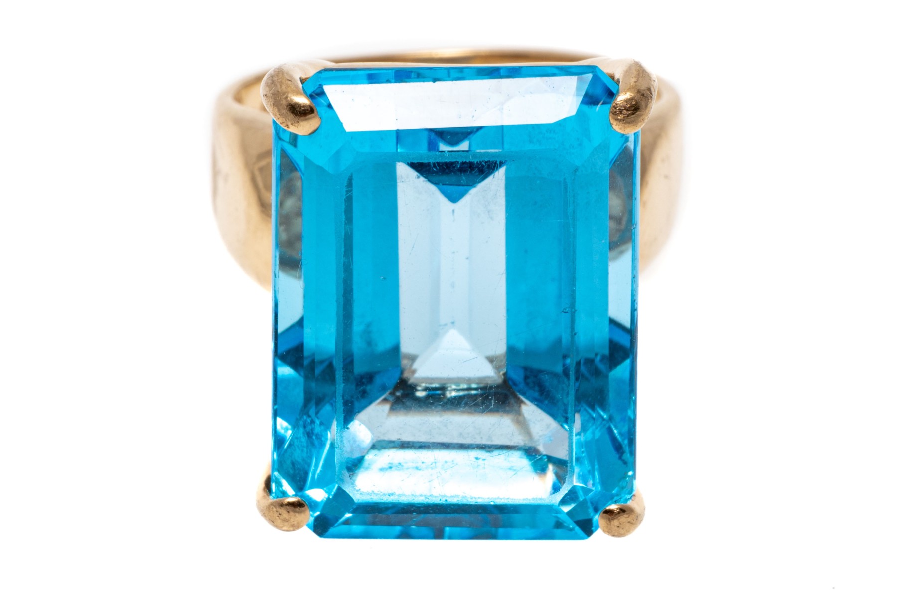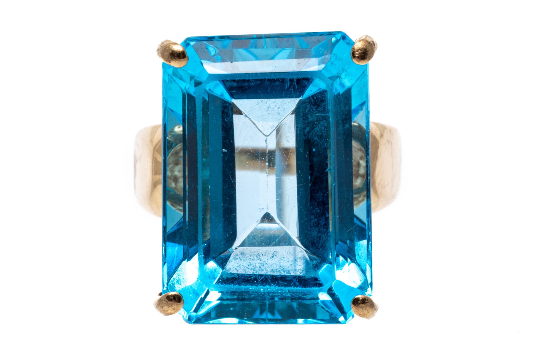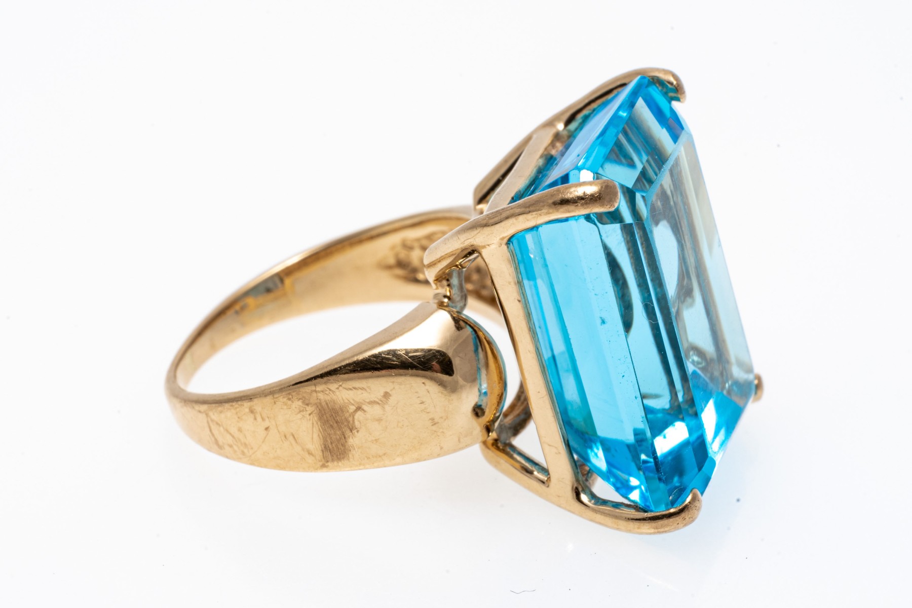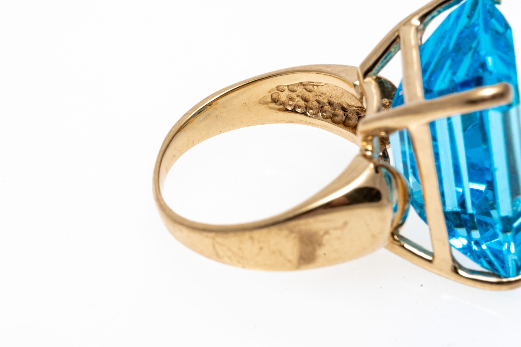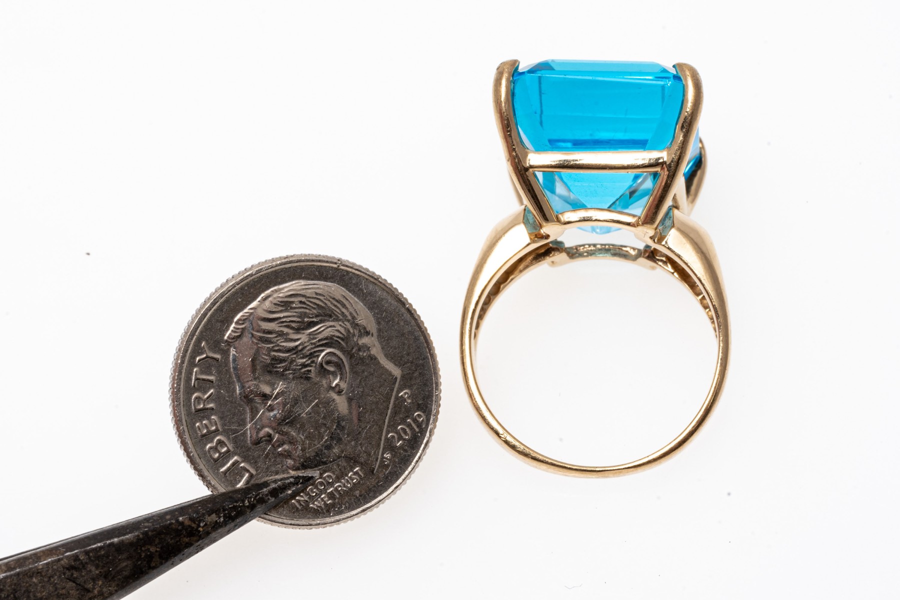 A stunning yellow gold ring showcasing a large, vibrant blue rectangular cut topaz, approximately 38.7 cts, over stylish, angular shoulders that taper dramatically to the shank.