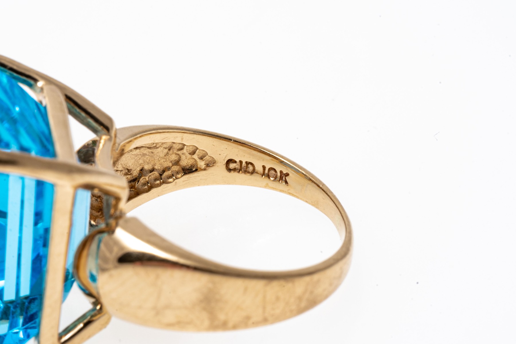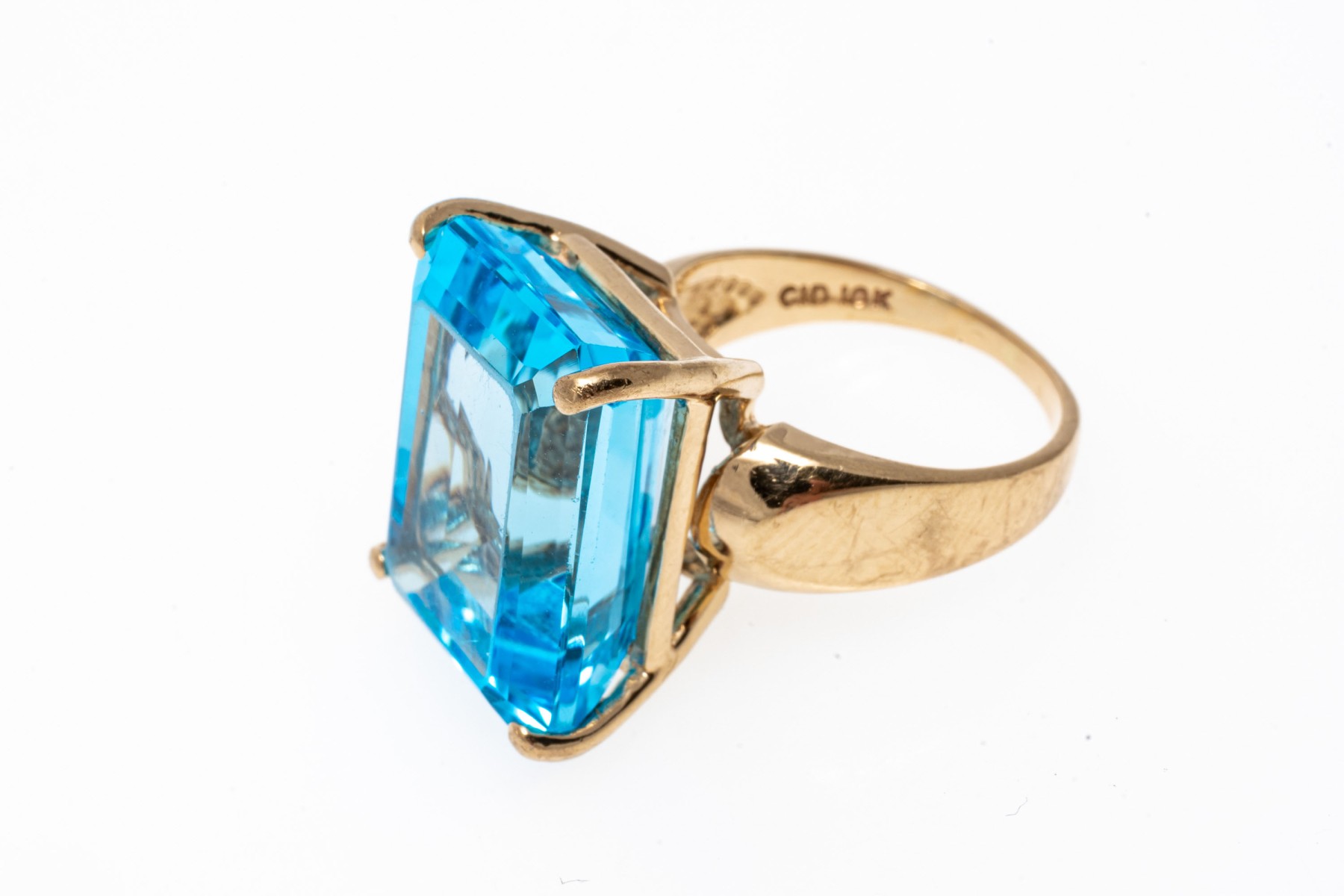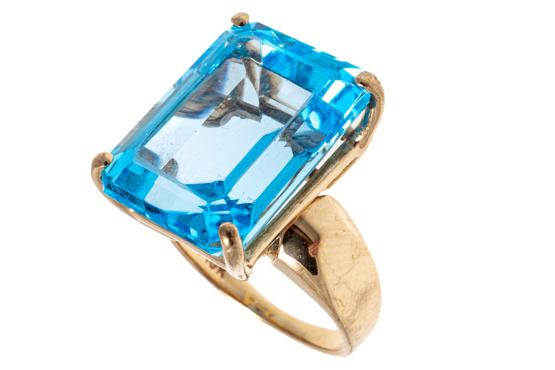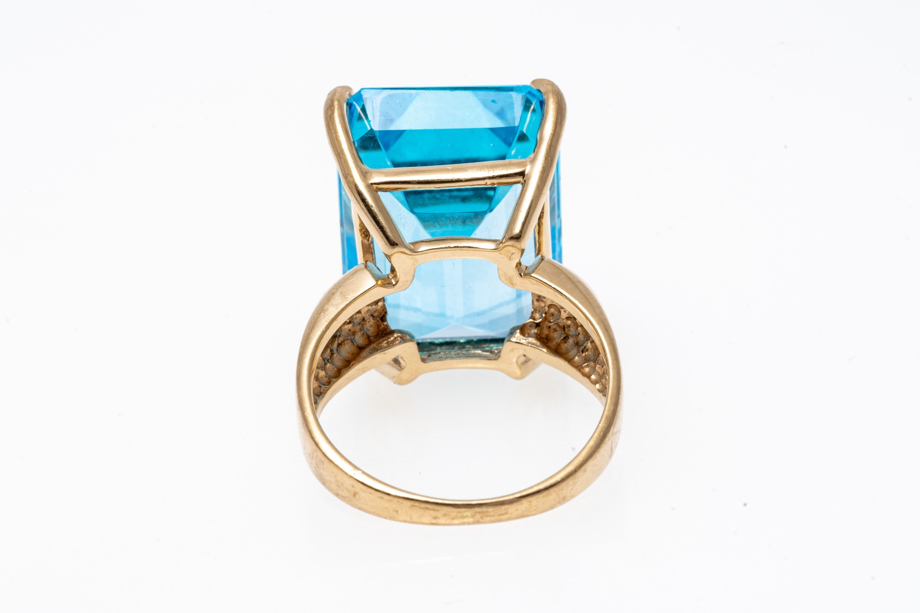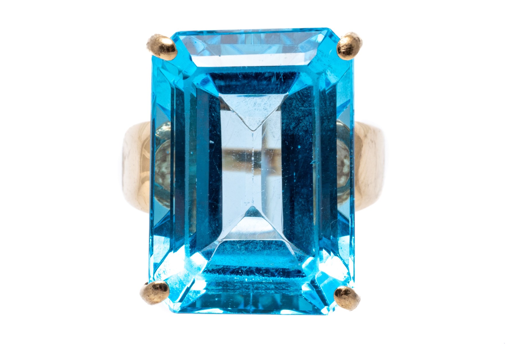 A stunning yellow gold ring showcasing a large, vibrant blue rectangular cut topaz, approximately 38.7 cts, over stylish, angular shoulders that taper dramatically to the shank.