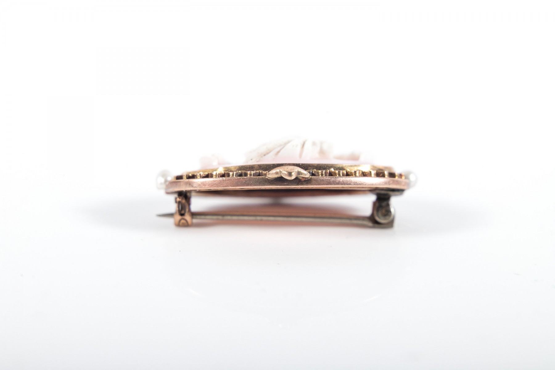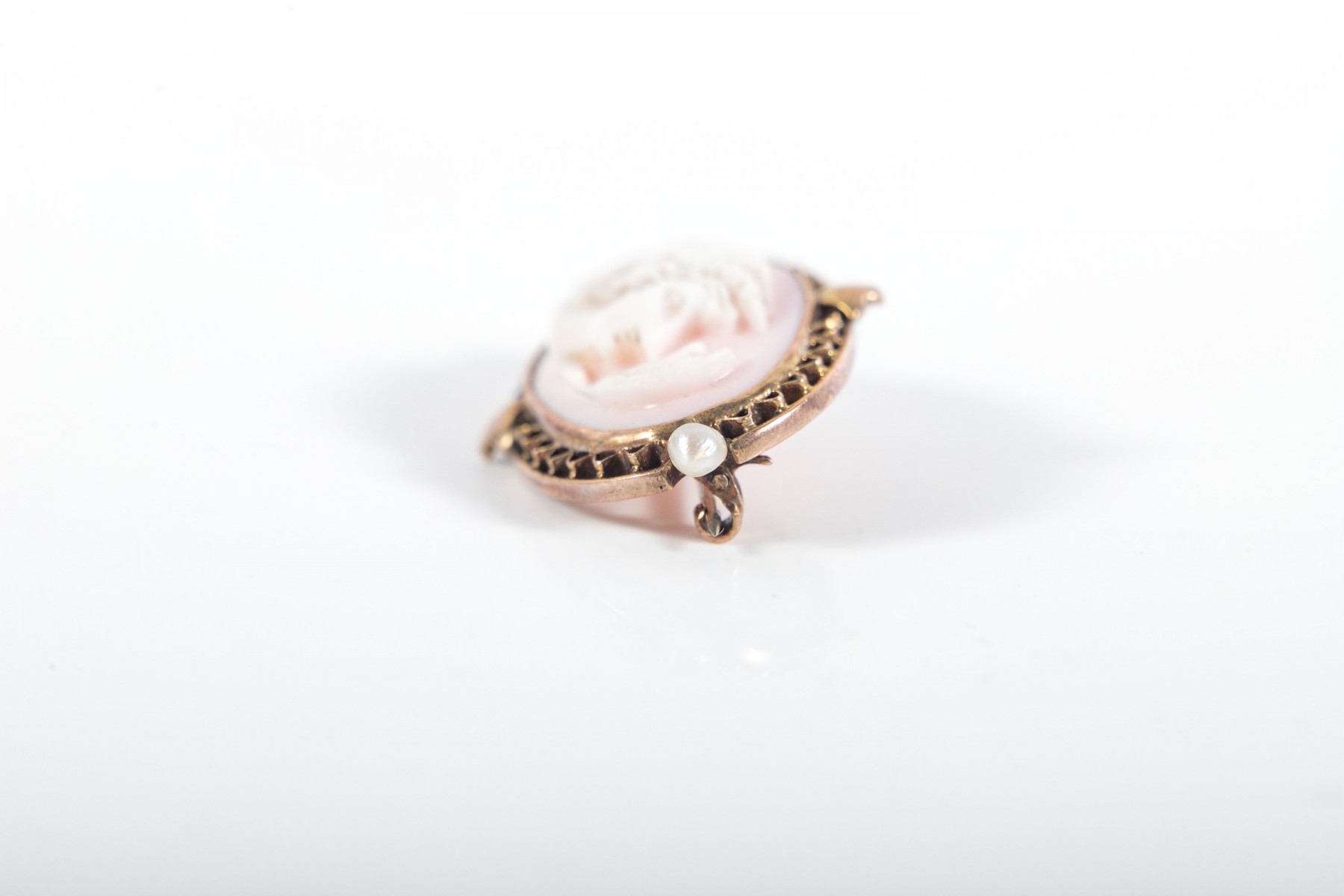 A dainty yellow gold brooch displaying a pretty white-to-pink cameo with the head of a woman in profile facing the right, flanked by foliage sprays. The cameo is bezel set with an openwork border of triangular patterns, flanked by white cultured button pearls at the sides.