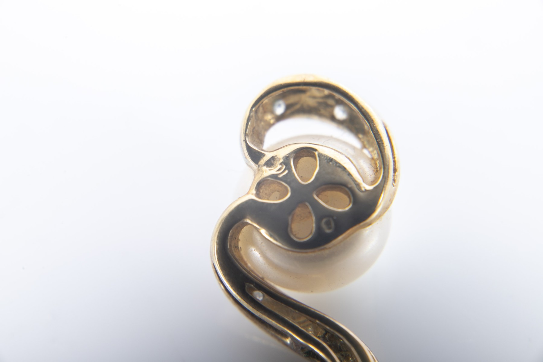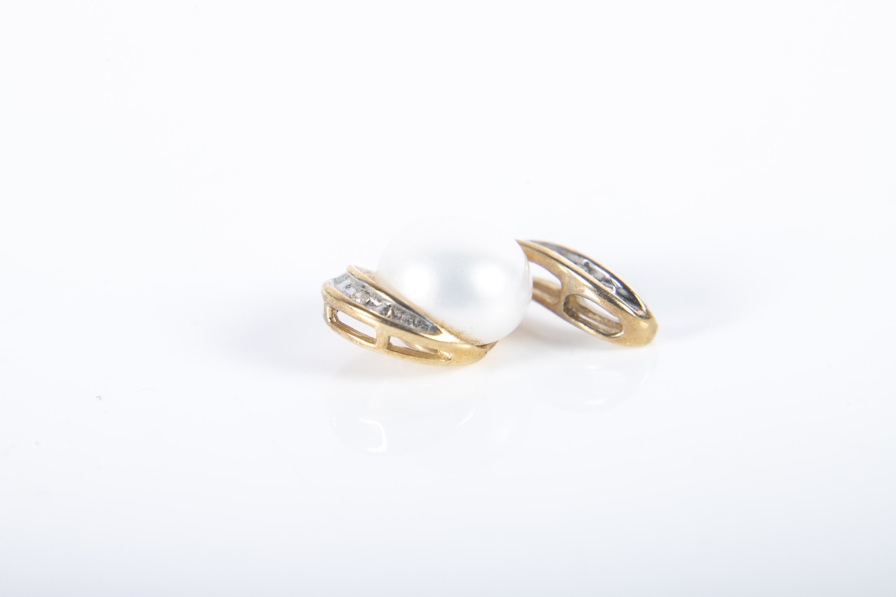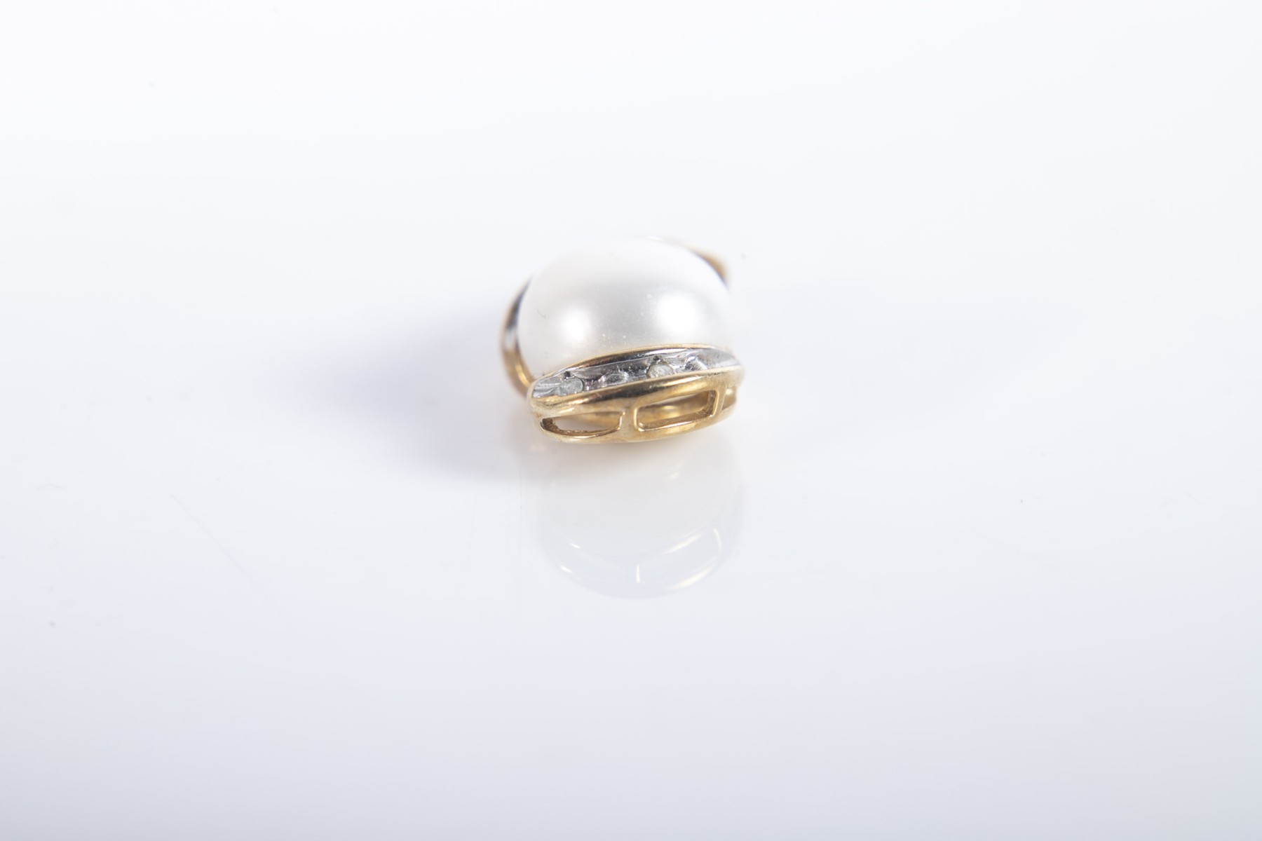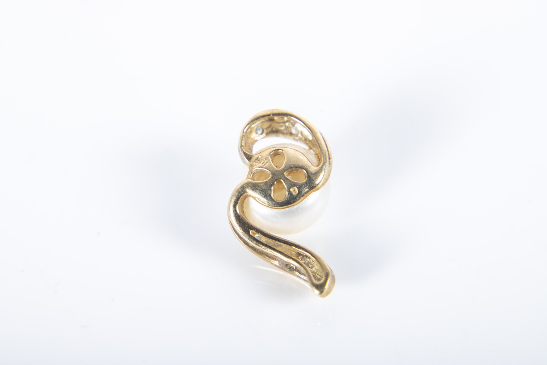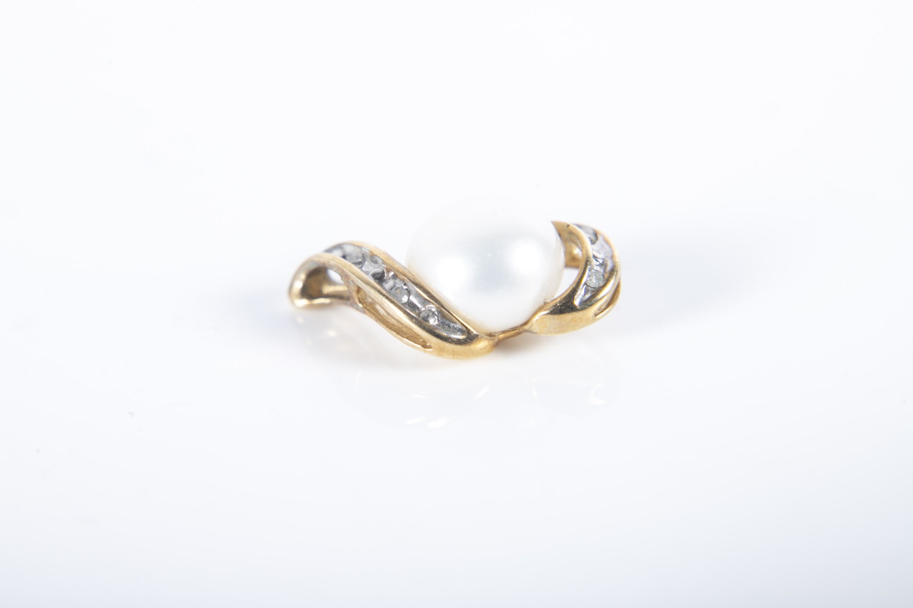 A beautiful yellow gold pendant displaying a bright white cultured button pearl surrounded by elegantly swooping channels of round diamonds.