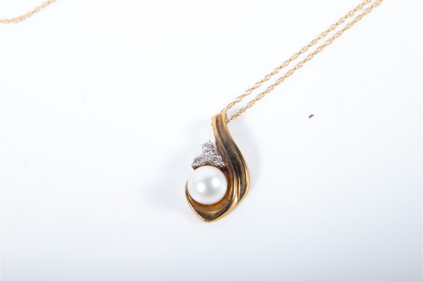 An elegant yellow gold double-link cable necklace with a pendant displaying a white cultured pearl topped with a triangular cluster of diamonds with a beautiful asymmetrical swoop leading to an integrated bail. Accompanied by a gray pleather display box.