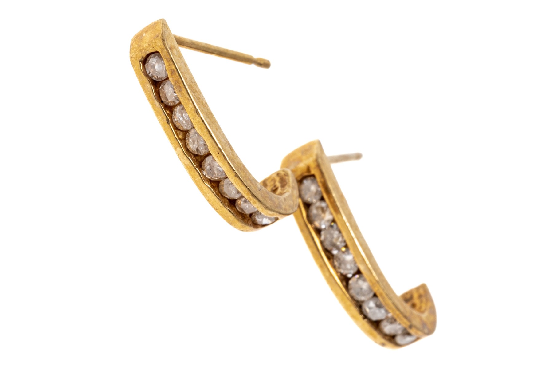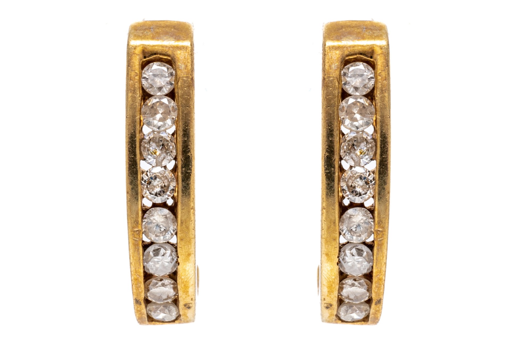 10k yellow gold delicate round faceted diamond channel set hoop "J" hoop earrings, app. 0.16 TCW. The earrings have posts and missing clutch style backs