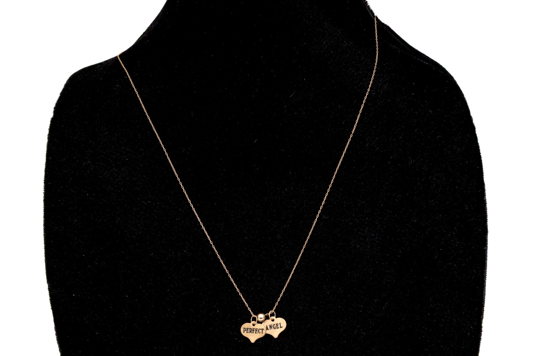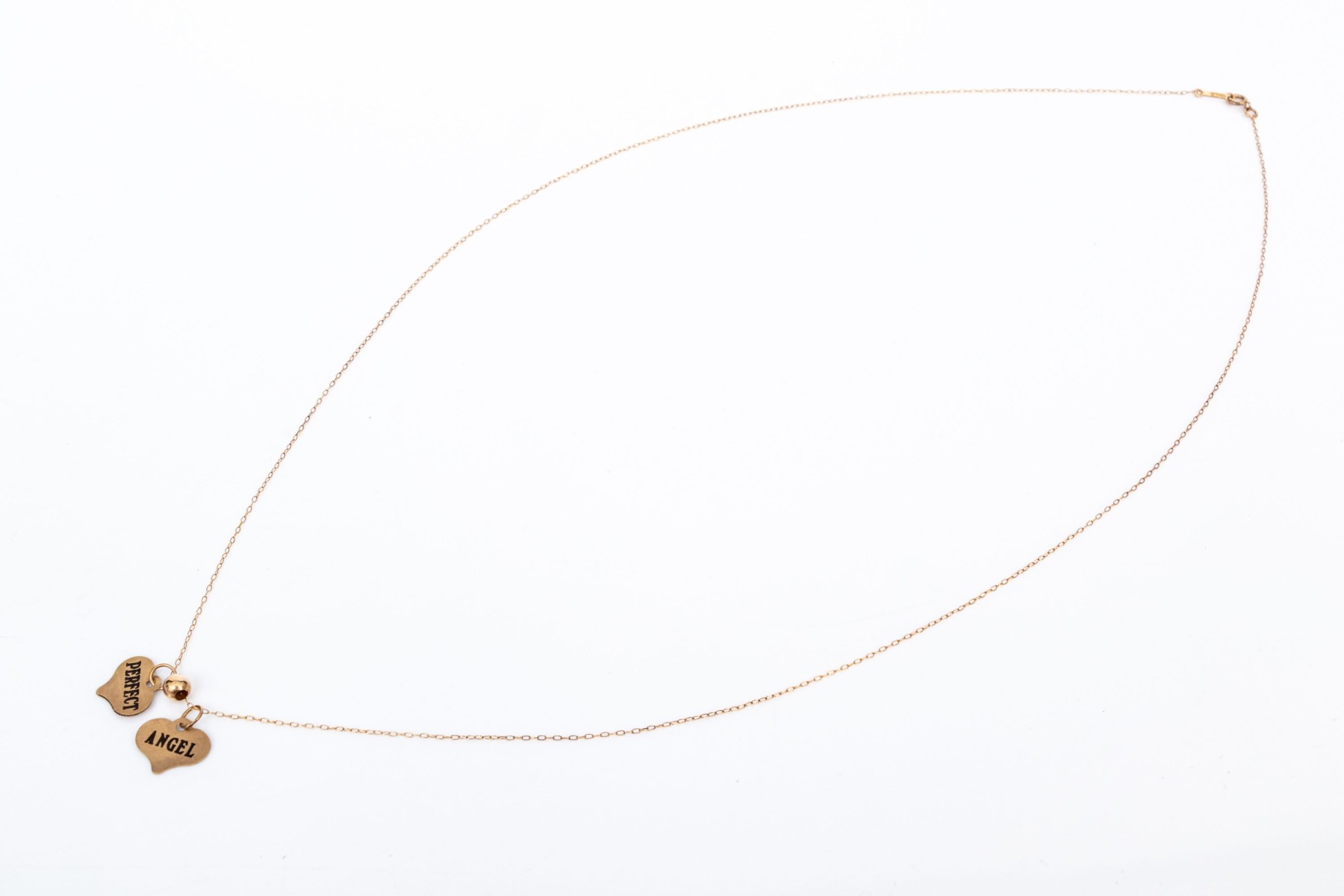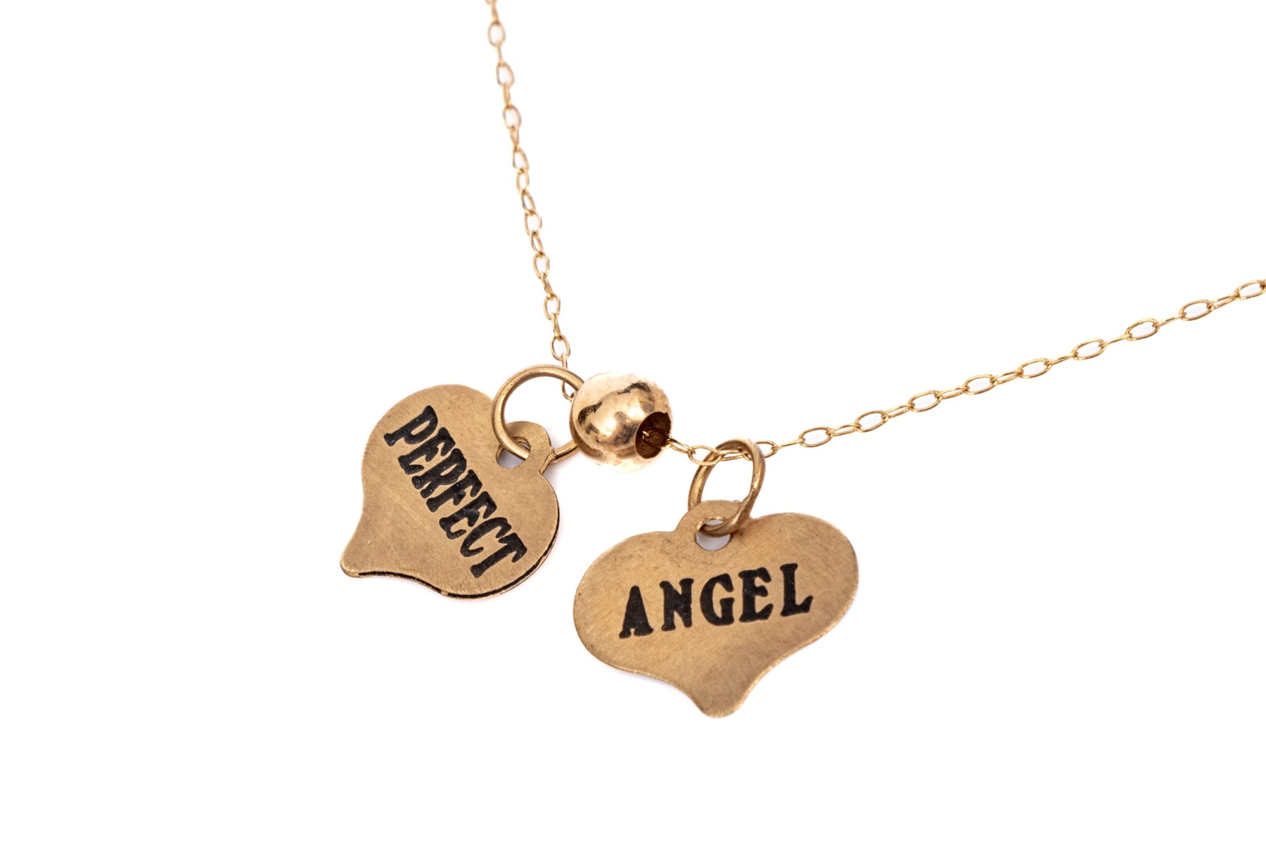 10k yellow gold delicate heart motif inspirational charm necklace, "Perfect", "Angel". This lovely necklace features two ultra thin heart charms, one "Perfect", one "Angel", displayed on a fine curb chain and finished with a spring ring style clasp