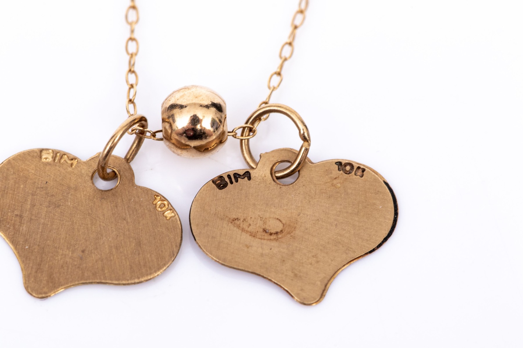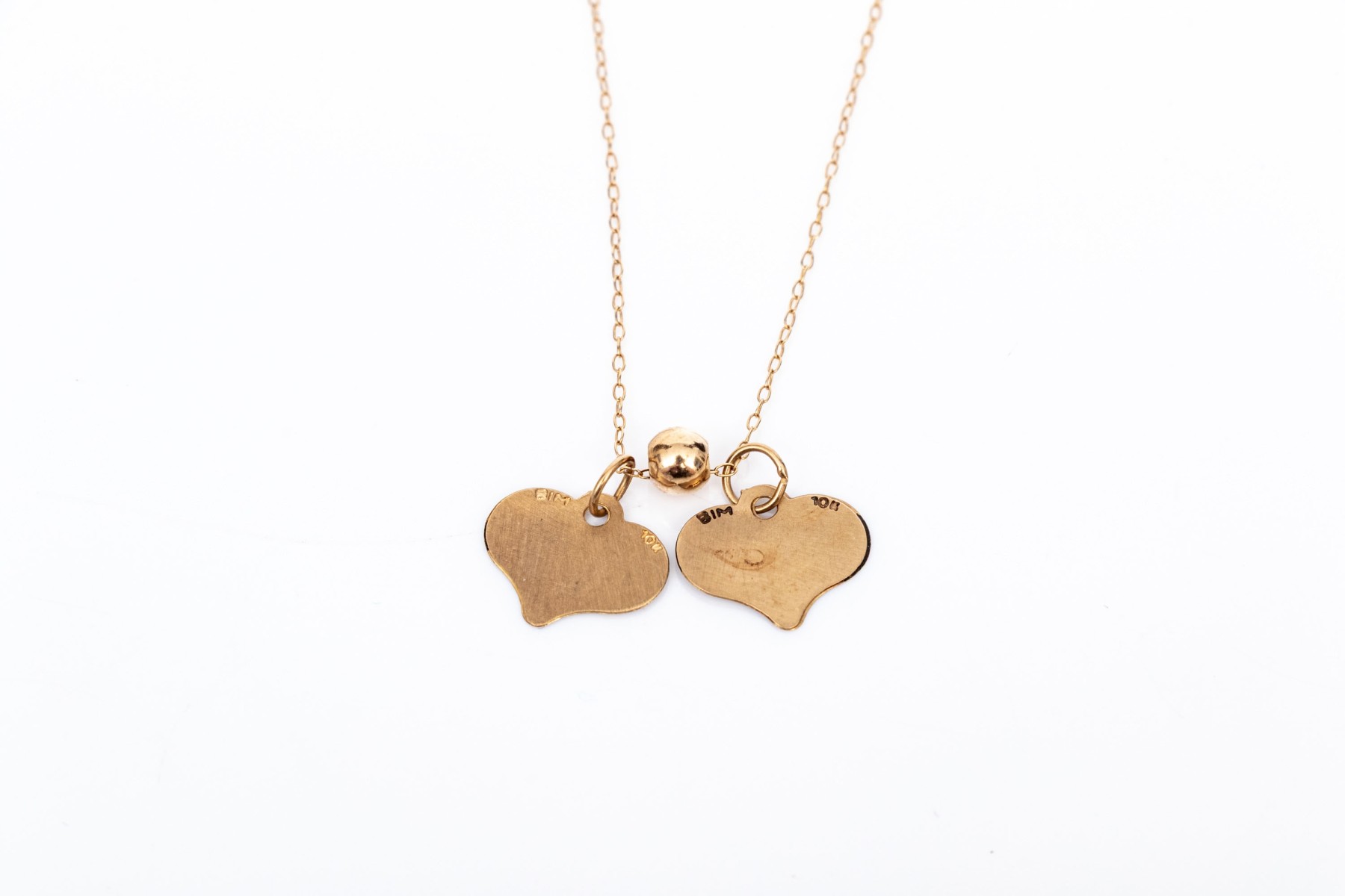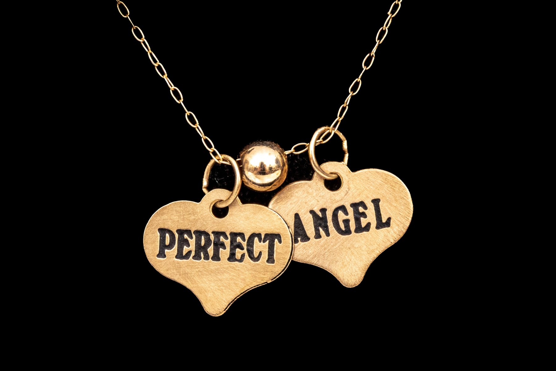 10k yellow gold delicate heart motif inspirational charm necklace, "Perfect", "Angel". This lovely necklace features two ultra thin heart charms, one "Perfect", one "Angel", displayed on a fine curb chain and finished with a spring ring style clasp