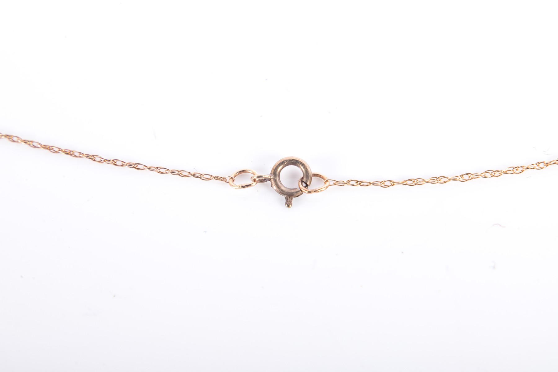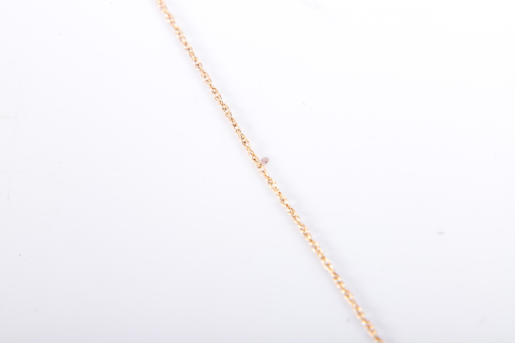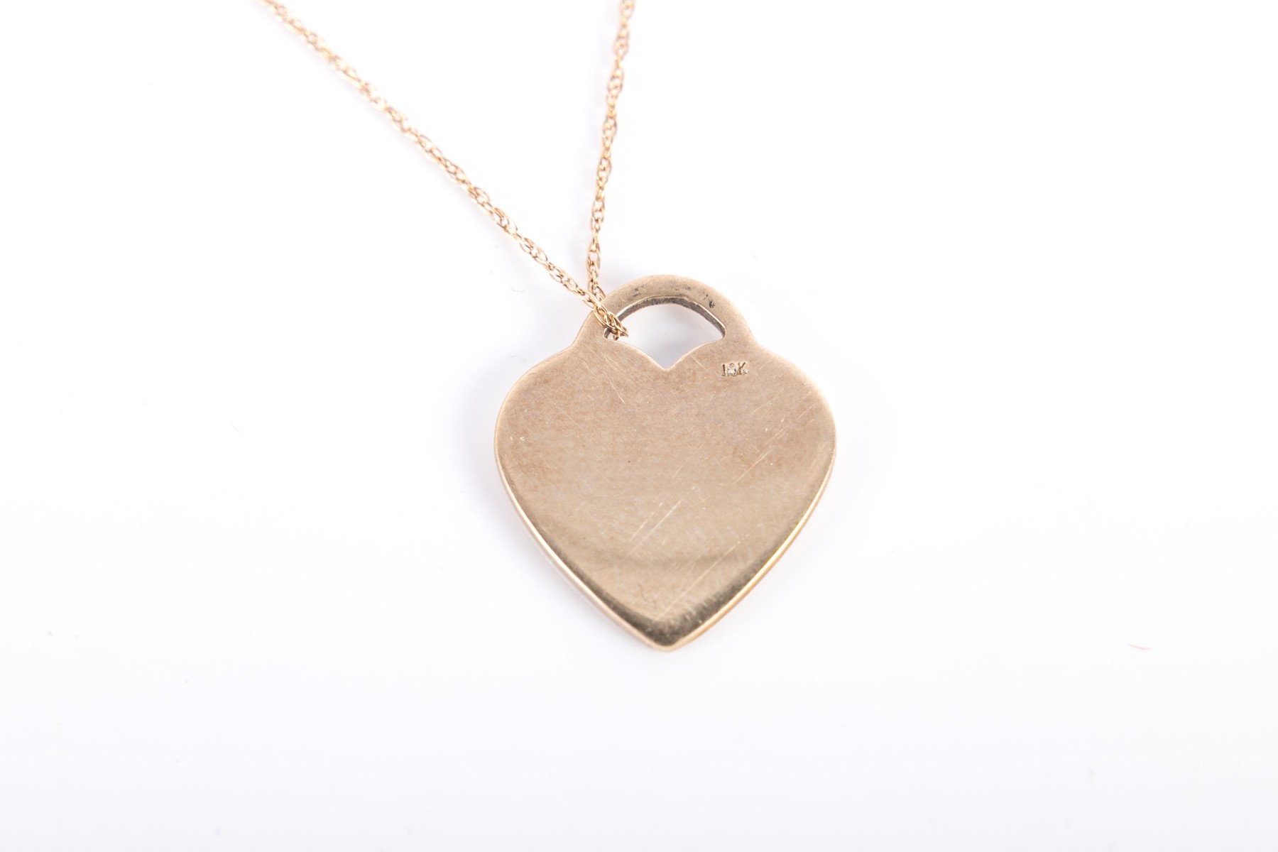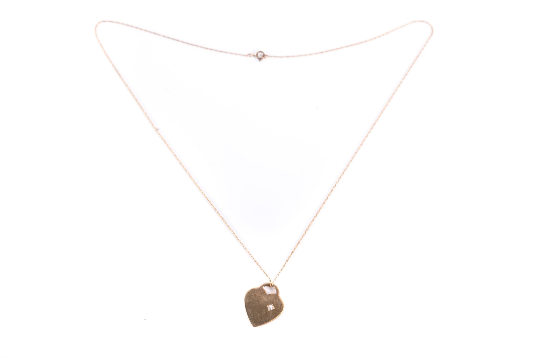 A lovely yellow gold necklace displaying a simple heart-shaped pendant with a thick, arched bail creating a nice padlock-styled appearance. The heart is accented with a single off-center round diamond. The pendant hangs from a fine rope chain.