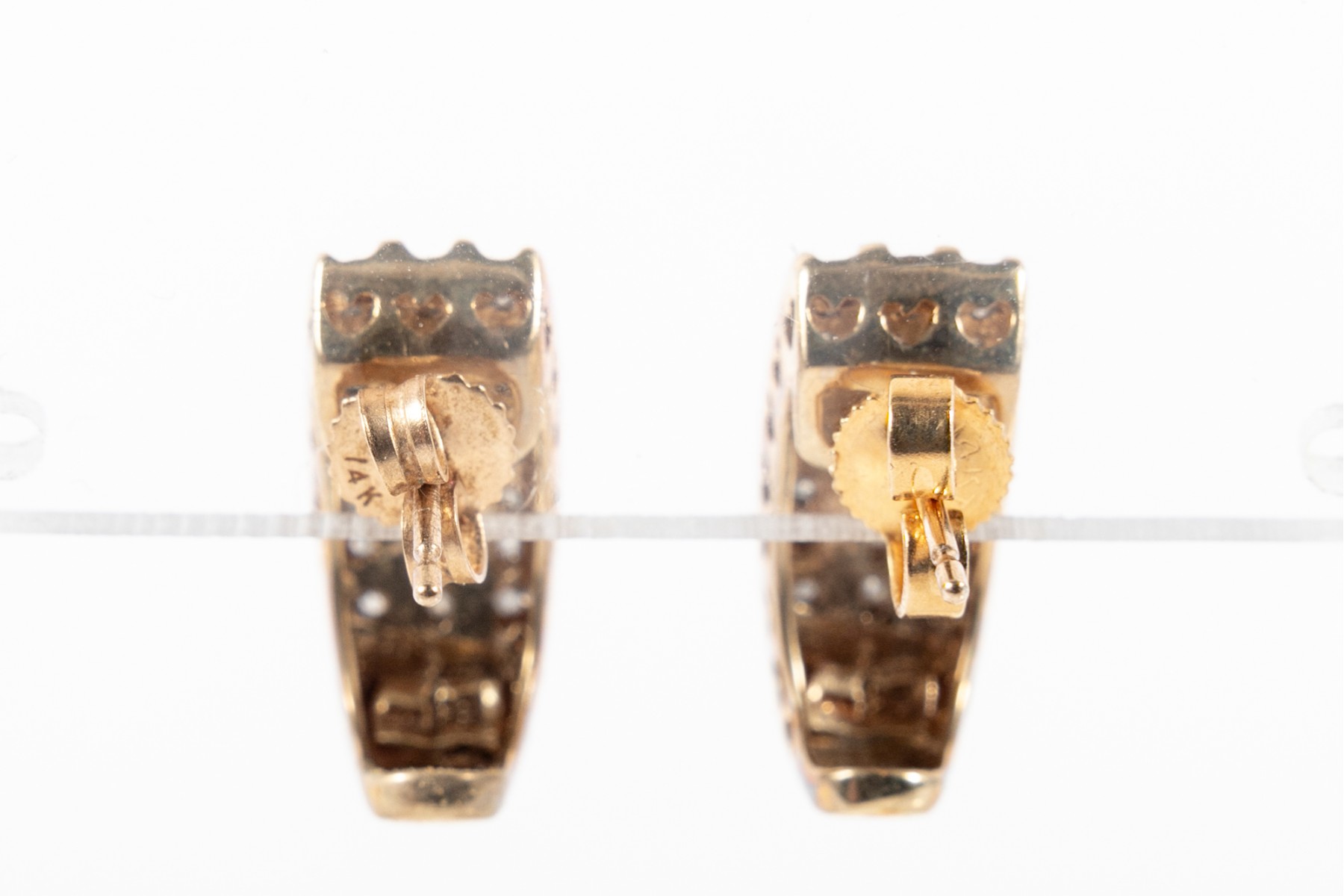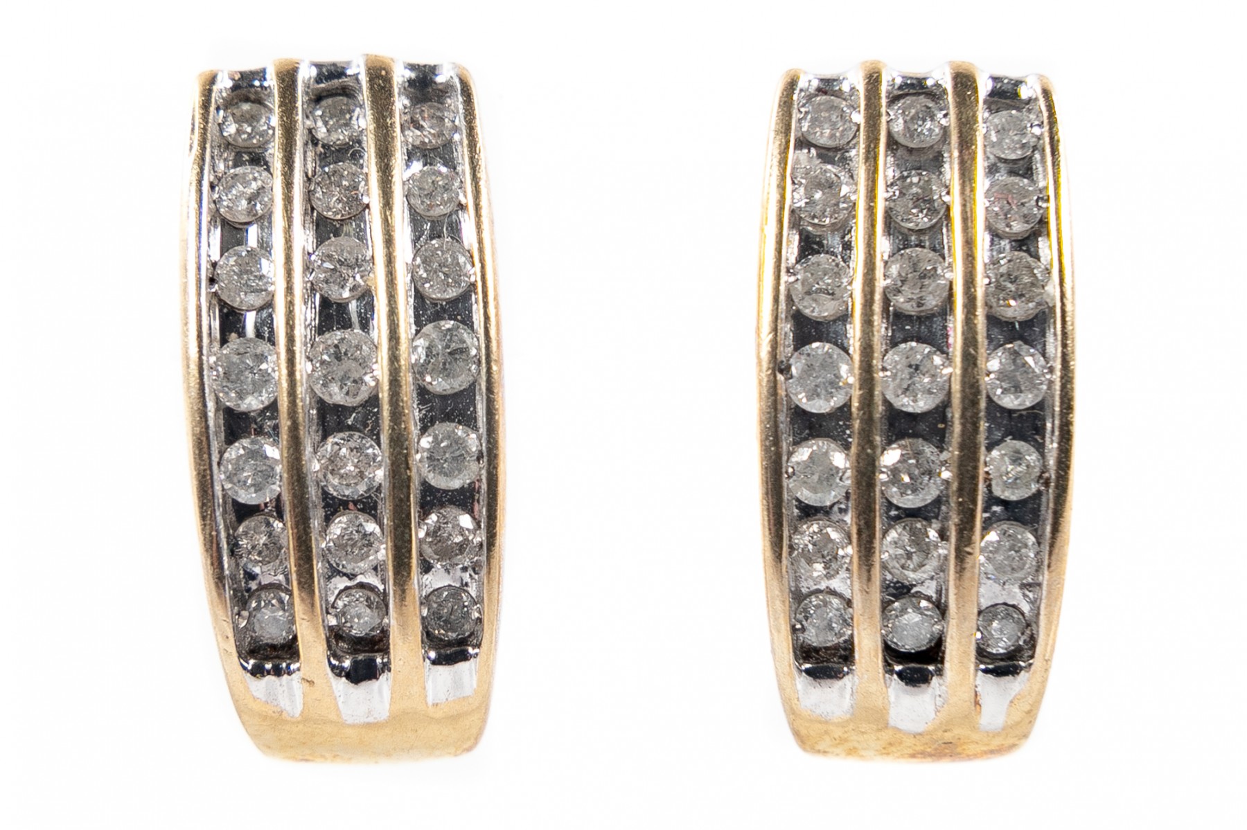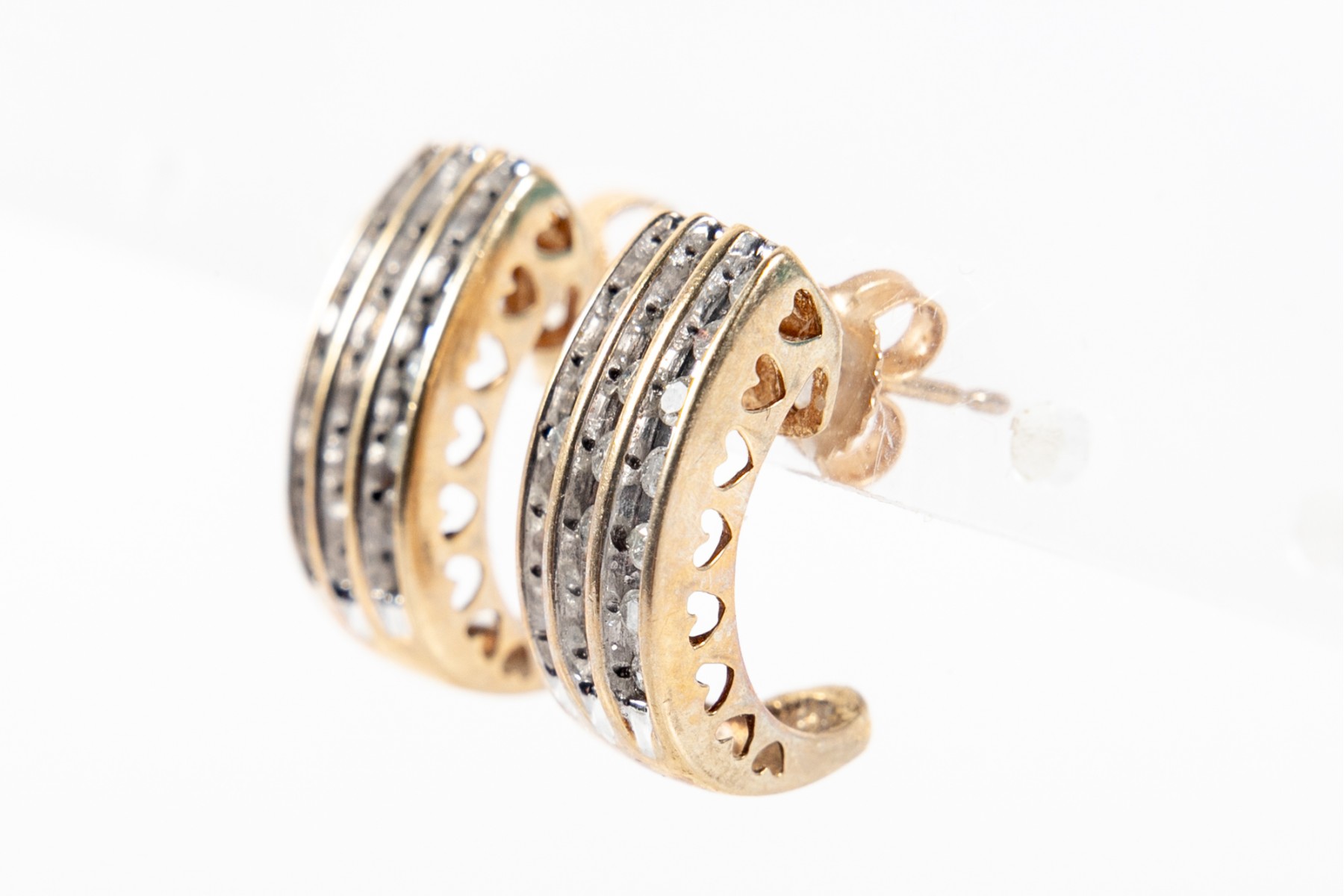 A pair of classy yellow gold J-curve earrings displaying three white gold channels of round diamonds, accented with pierced heart motifs along the edges.