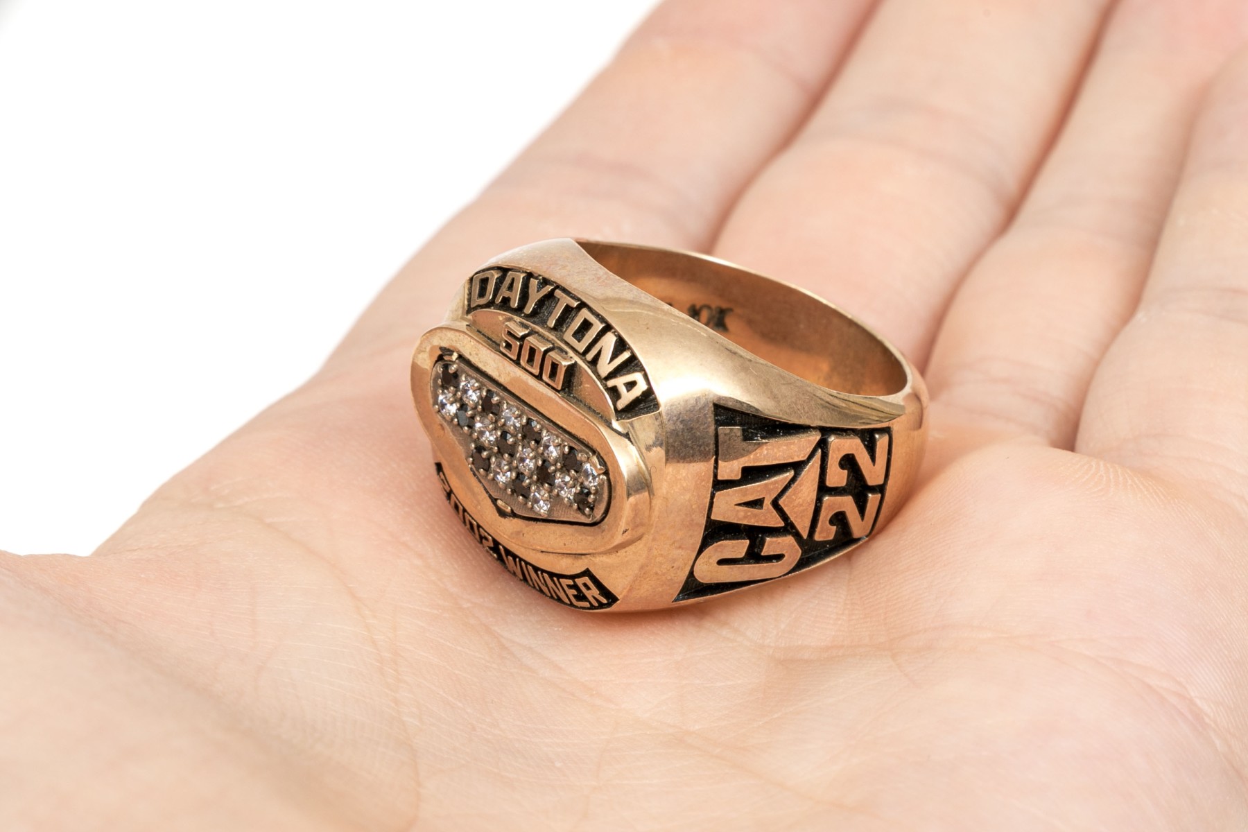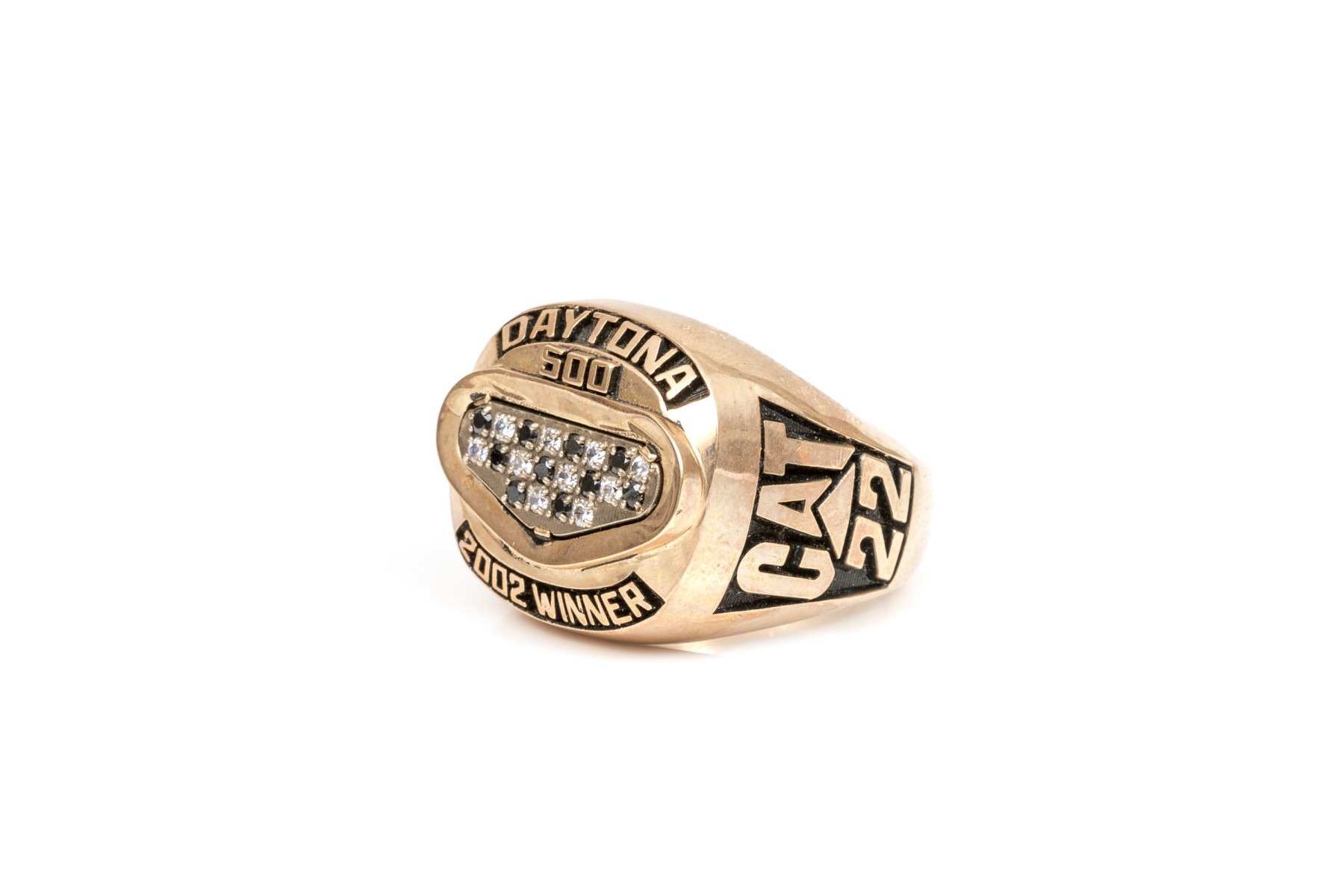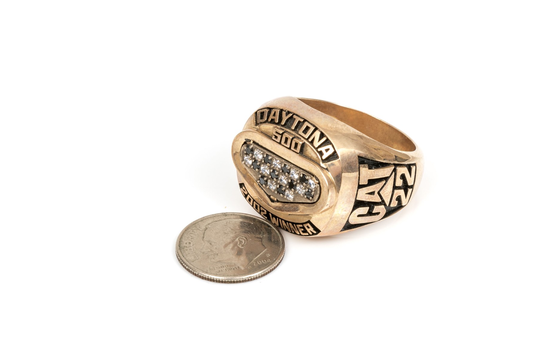10k yellow gold fabulous Daytona 500 2002 black and white diamond winners ring, size 12.5, for Bill Davis Racing, app. 0.20 TCW, prong set