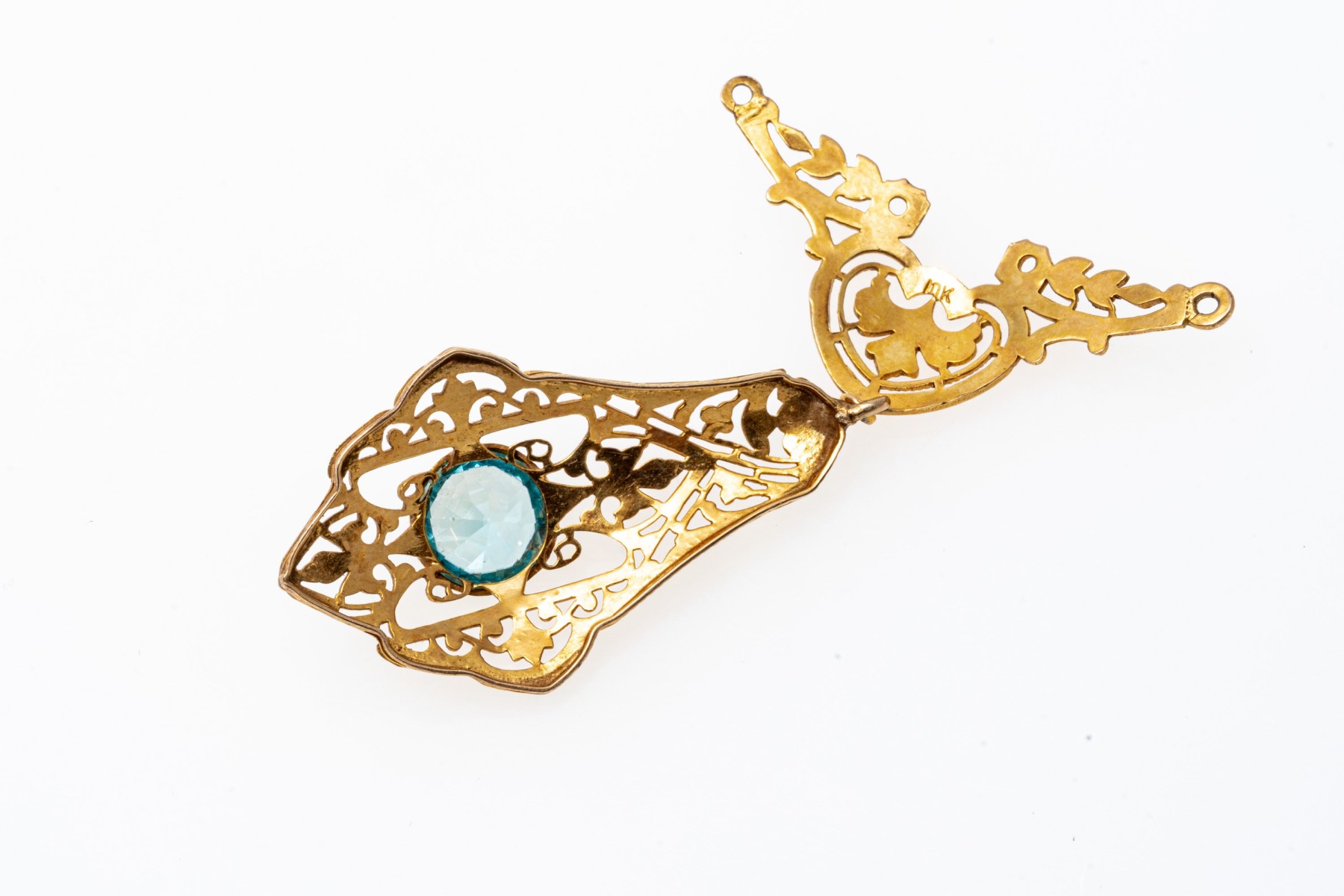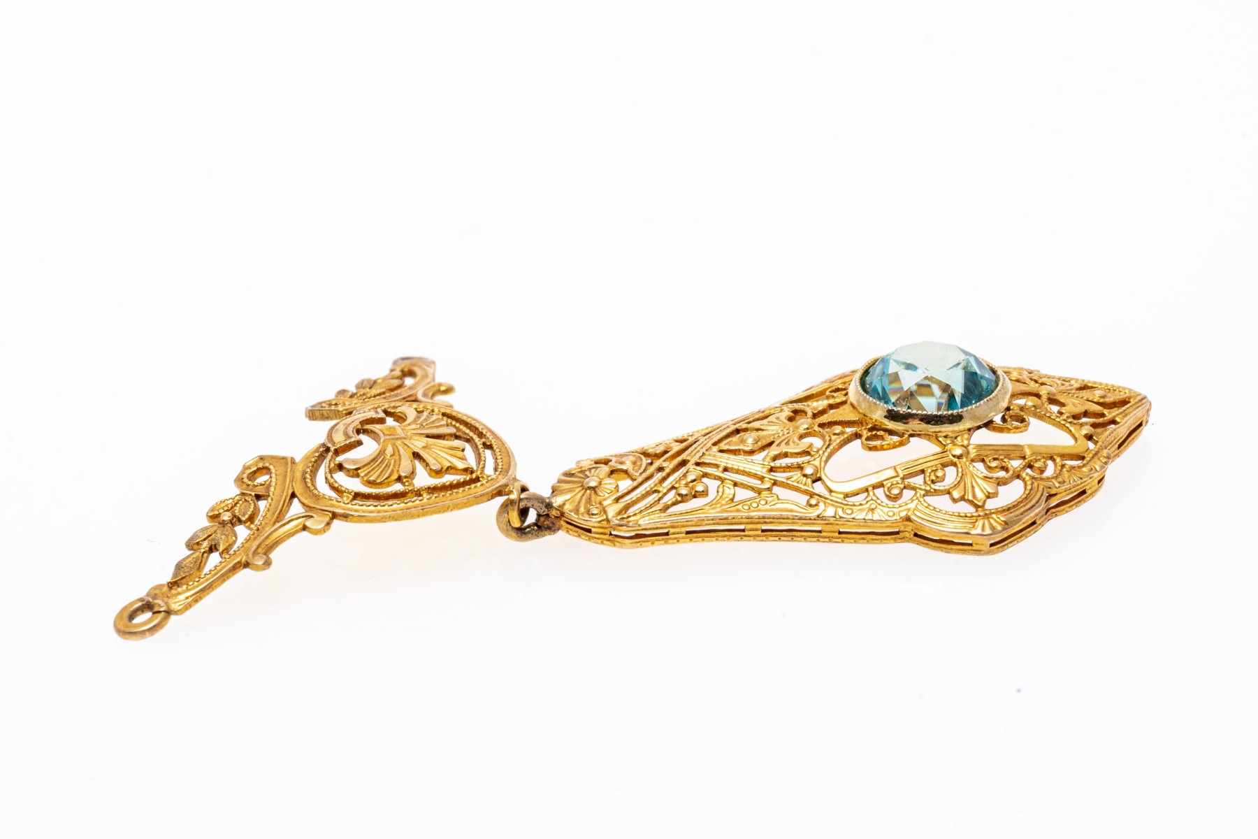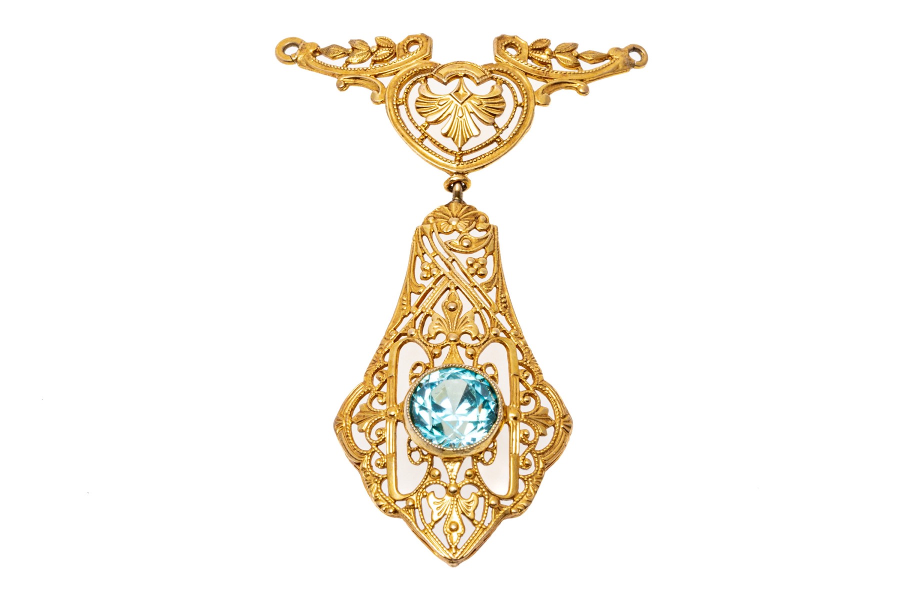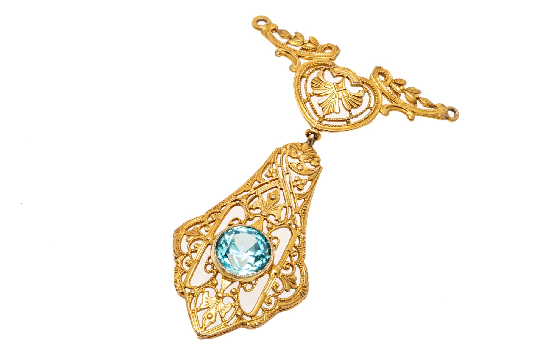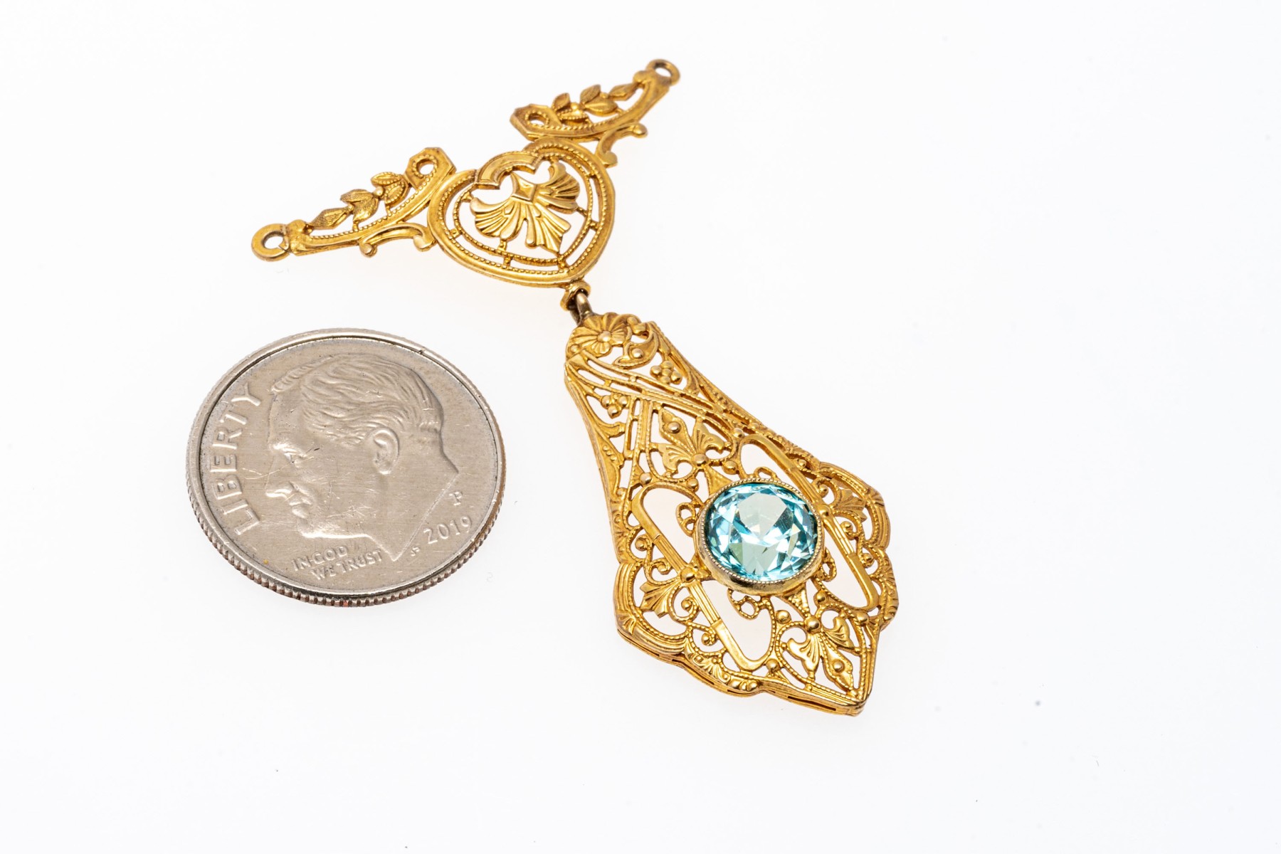 10k yellow gold filigree necklace center, no chain, set with synthetic blue zircon