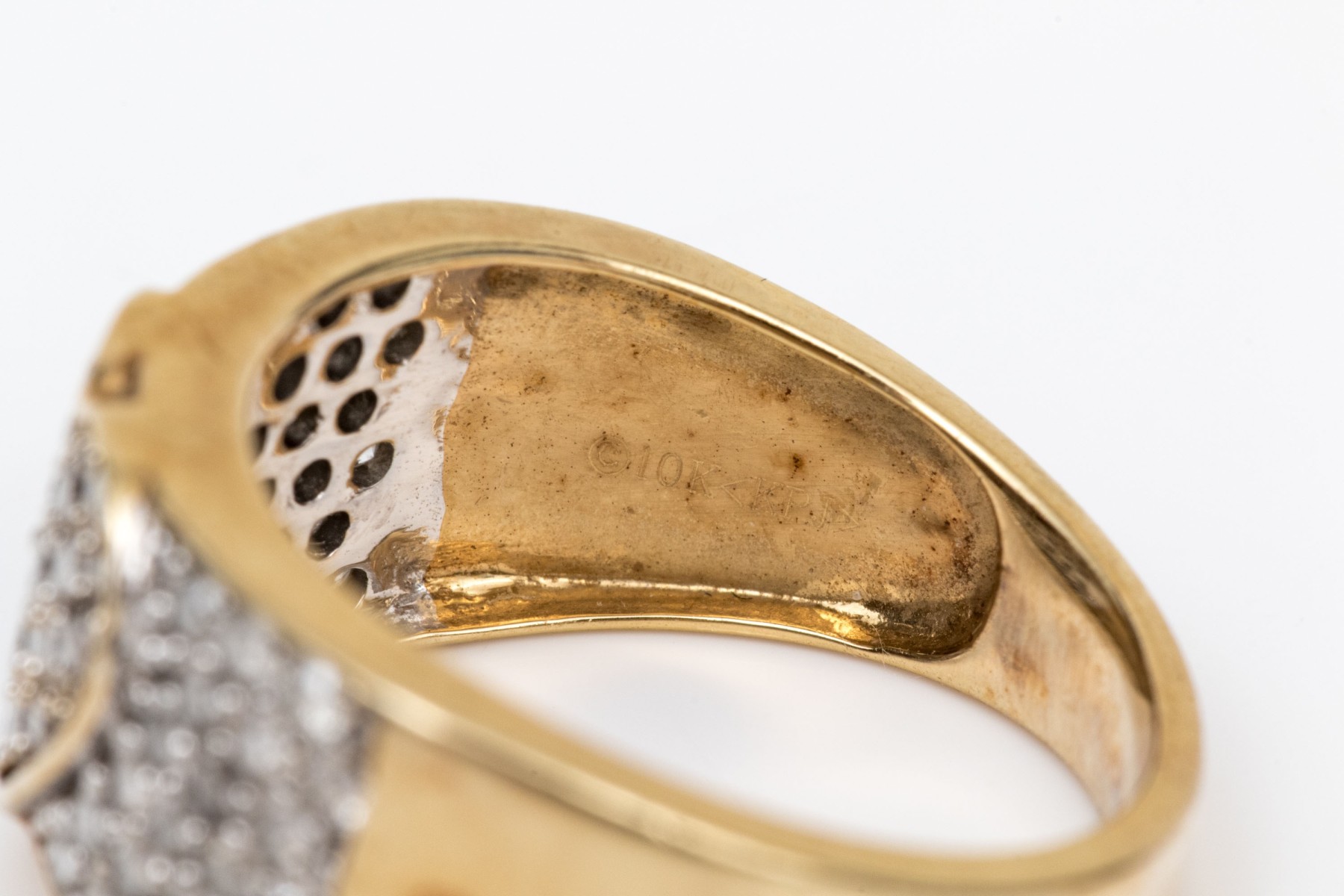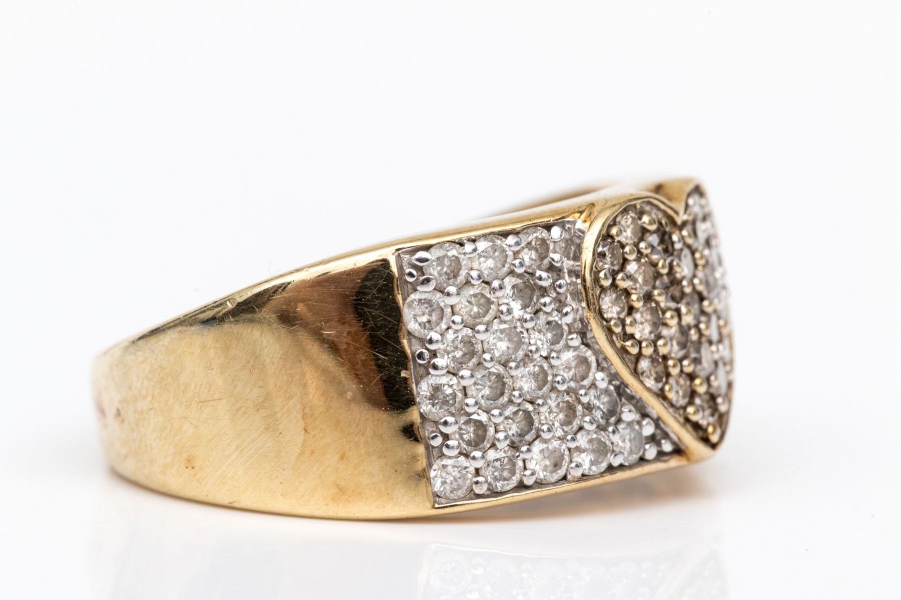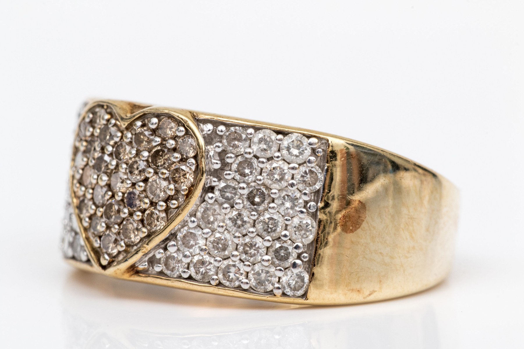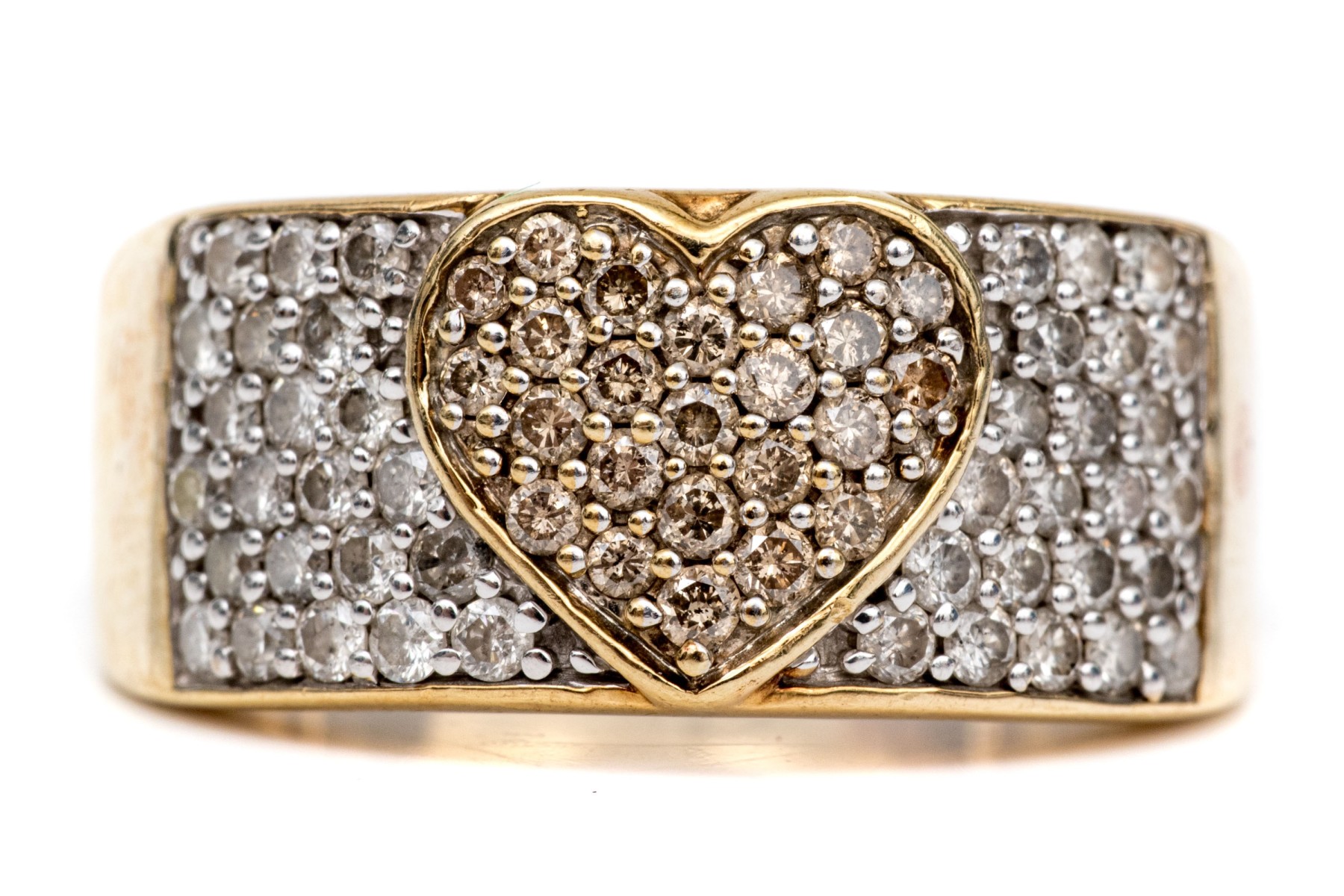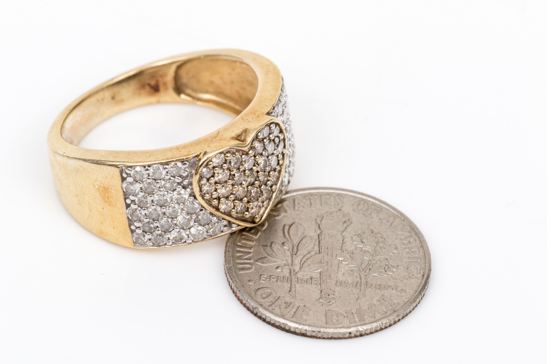10k yellow gold fun brown and white pave diamond heart motif ring, app. 0.98 TCW, size 6.75+
