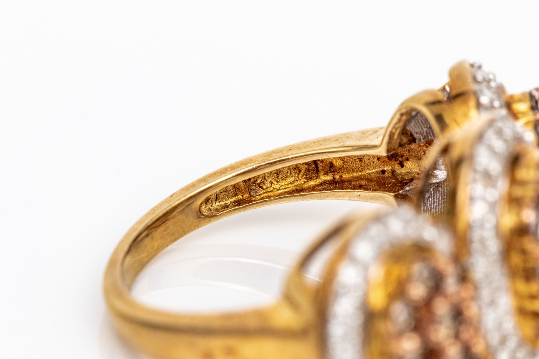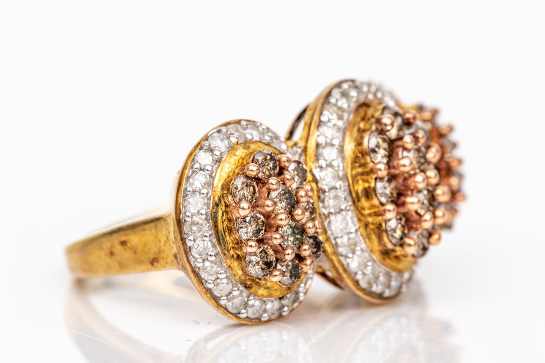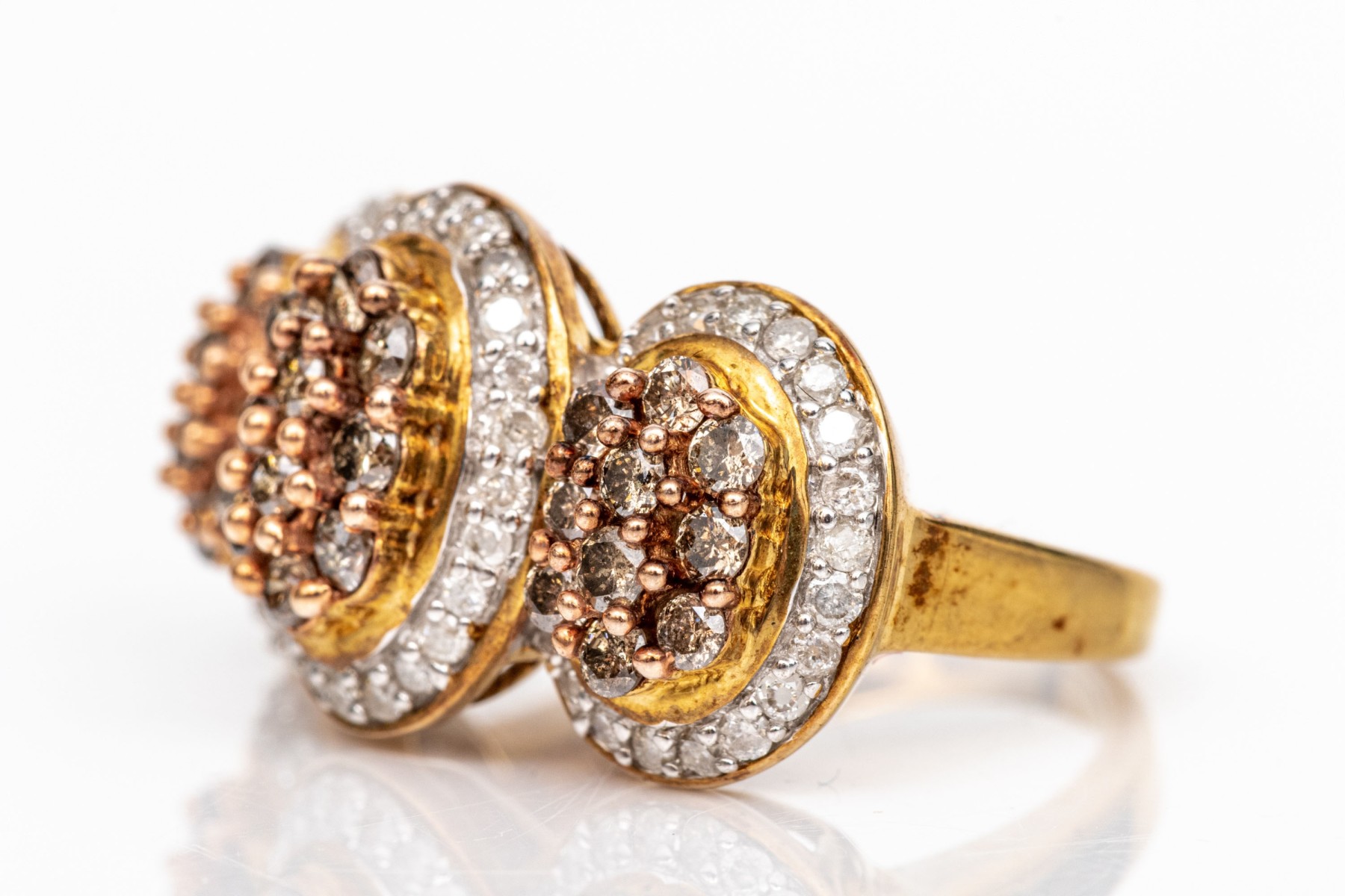 10k yellow gold impactful brown and white diamond cluster dome ring, app. 0.76 TCW, size 6
