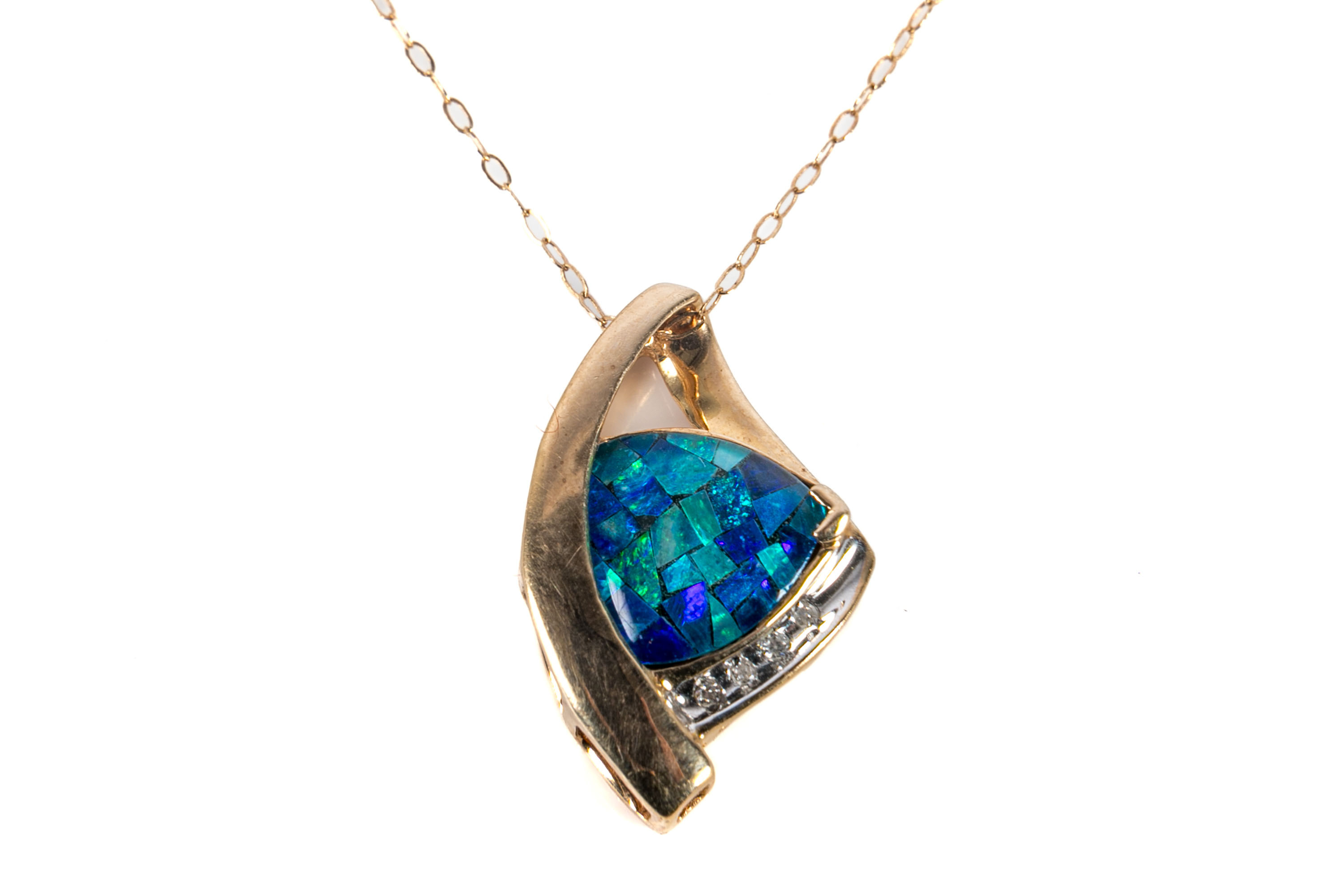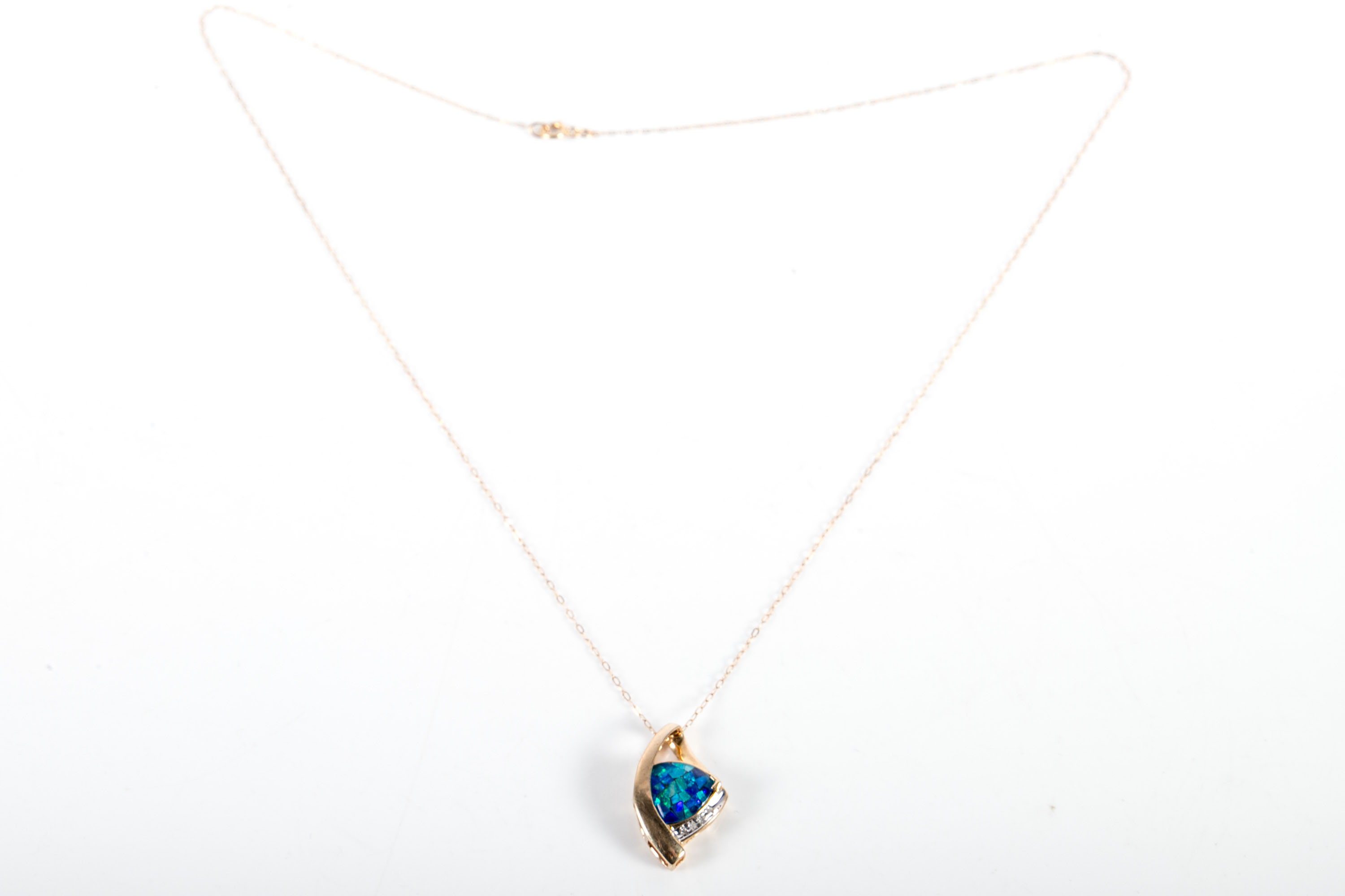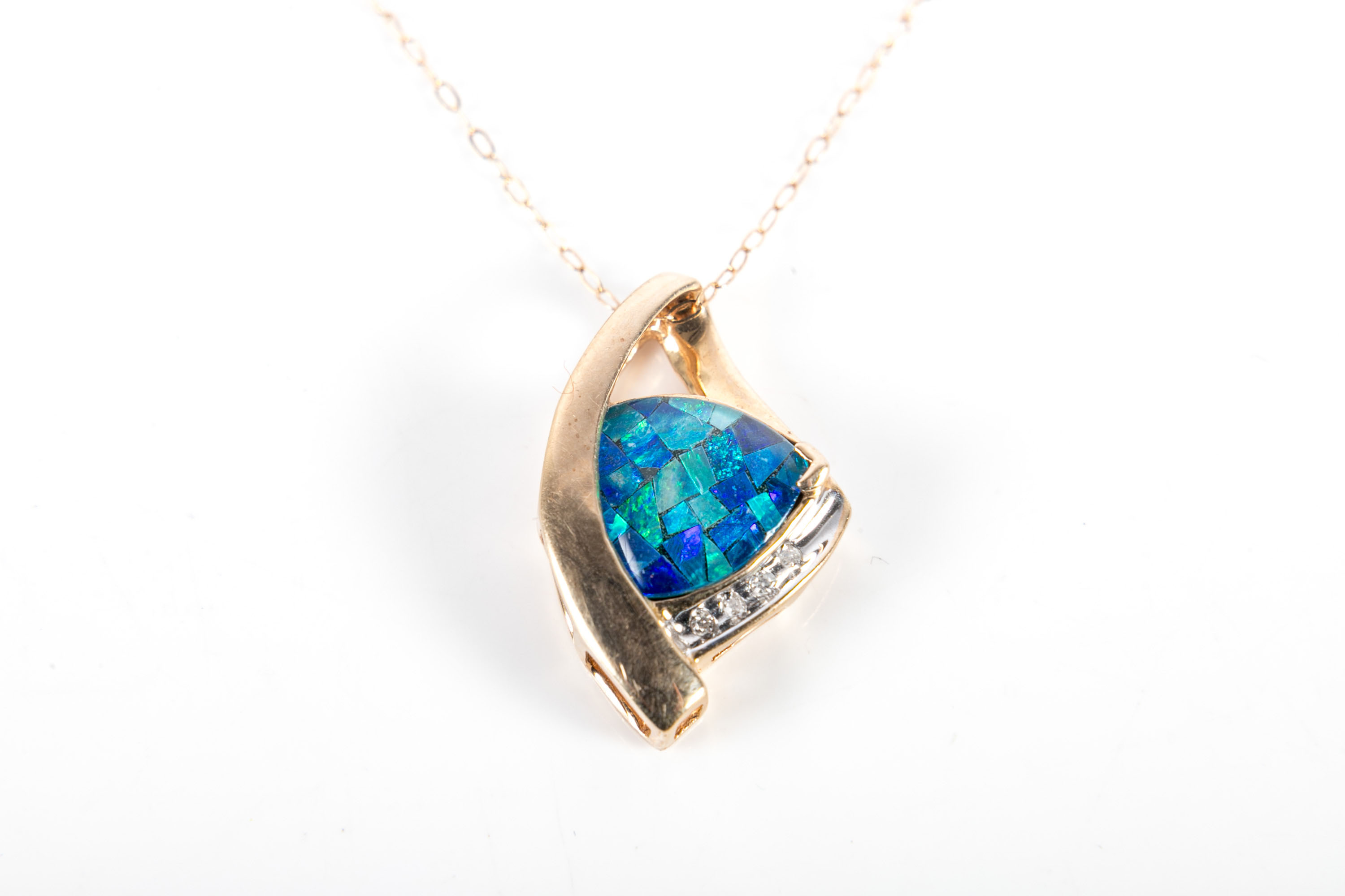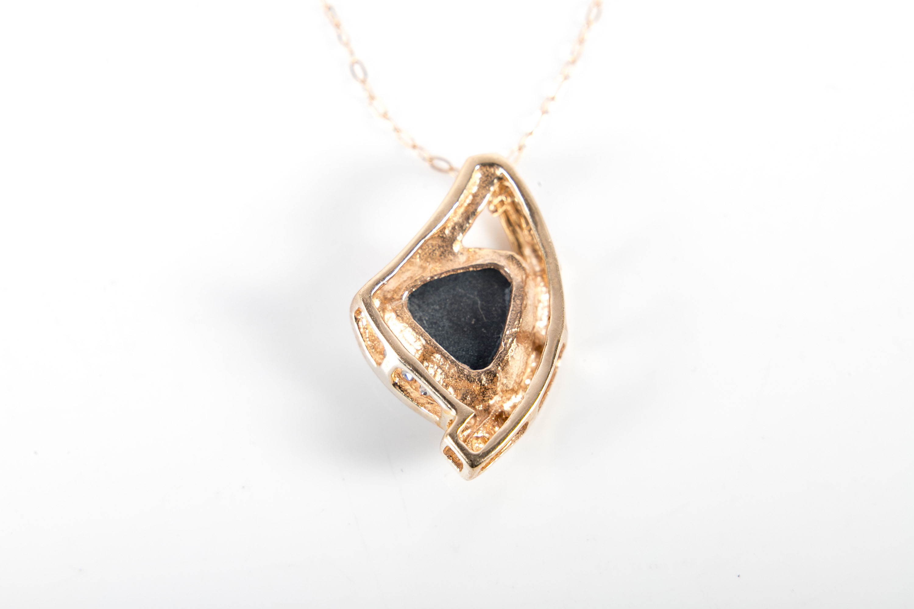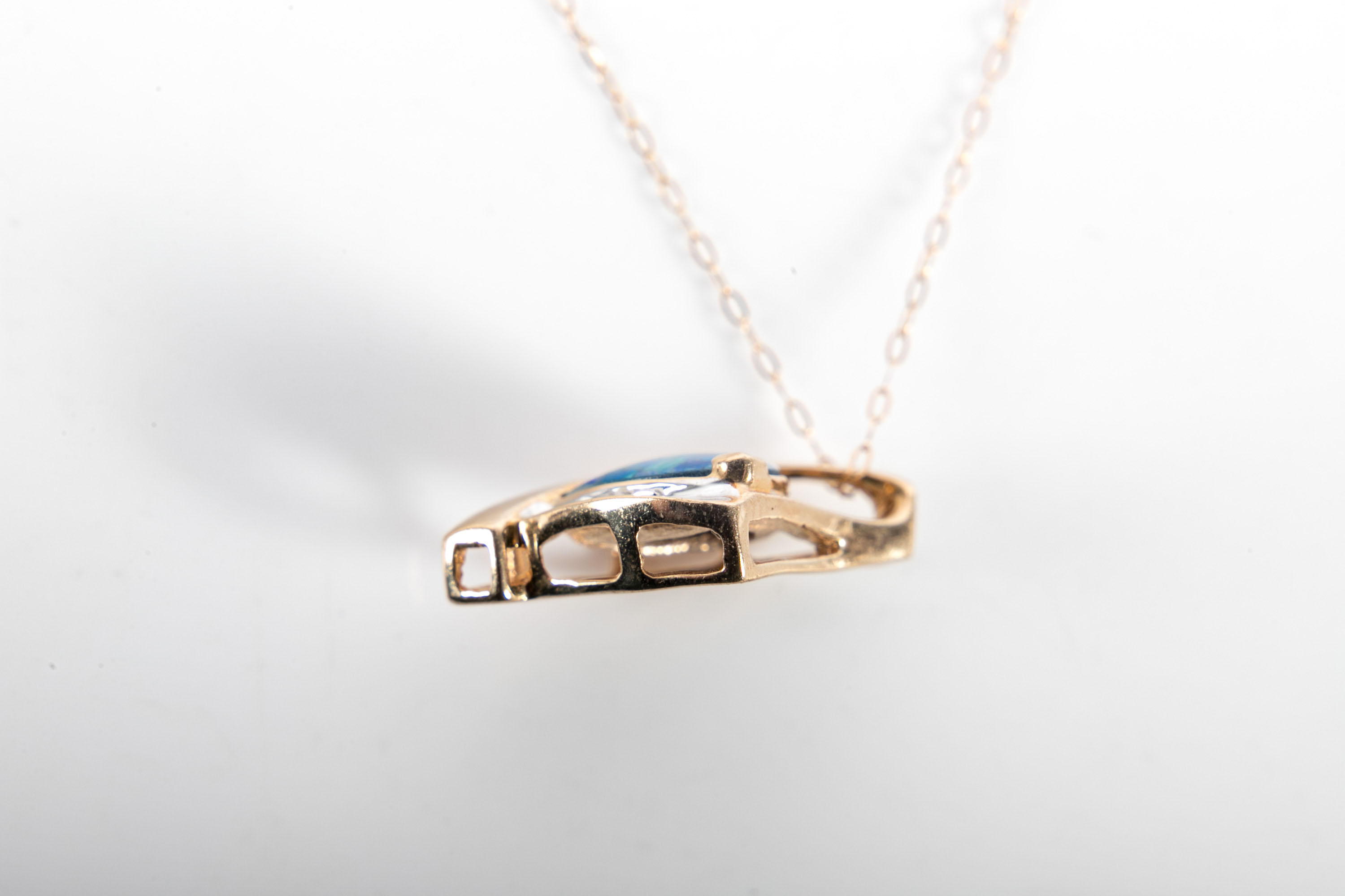 A beautiful reuleaux triangle cut opal complimented by four moissanite stones. The gems are housed in an elegant marked 10K yellow gold charm setting with chain.