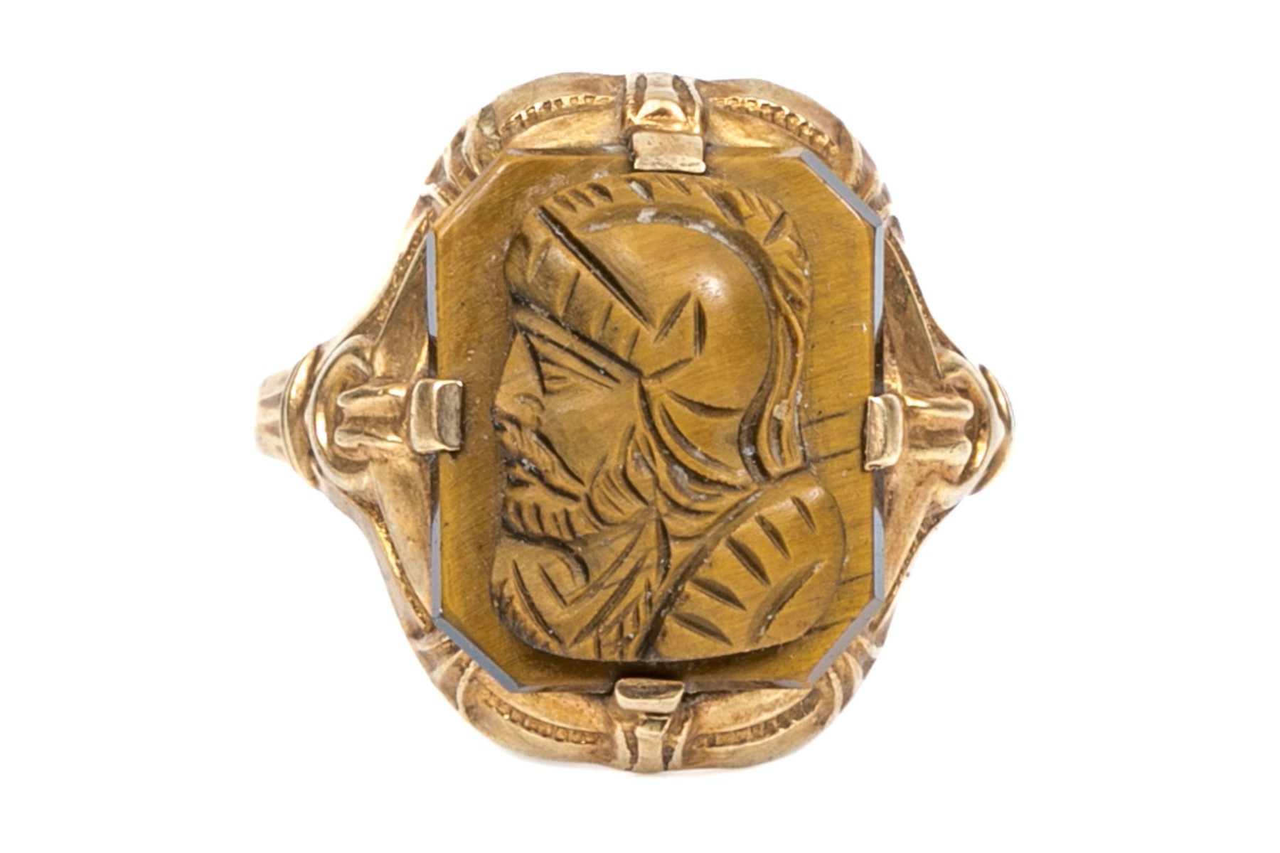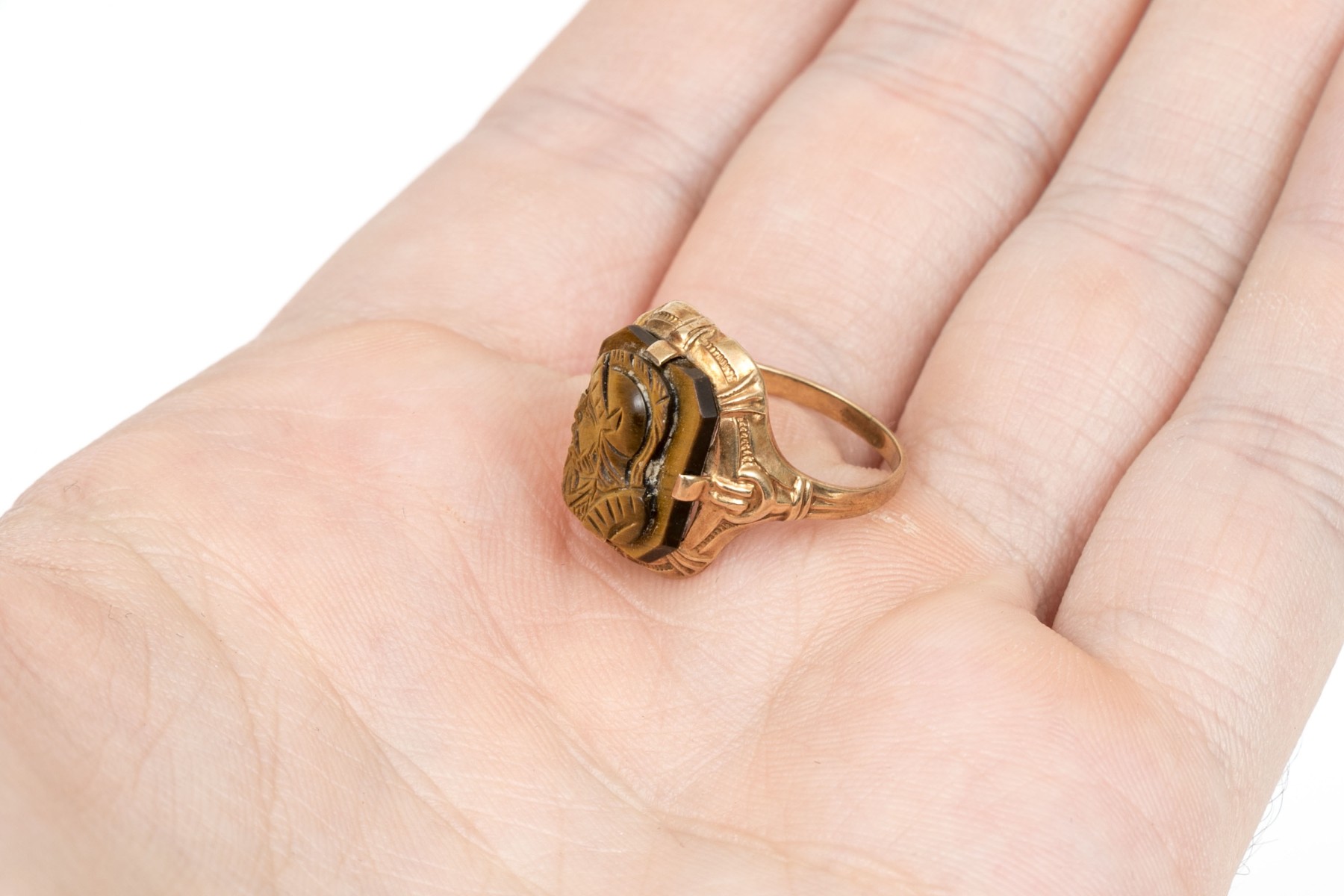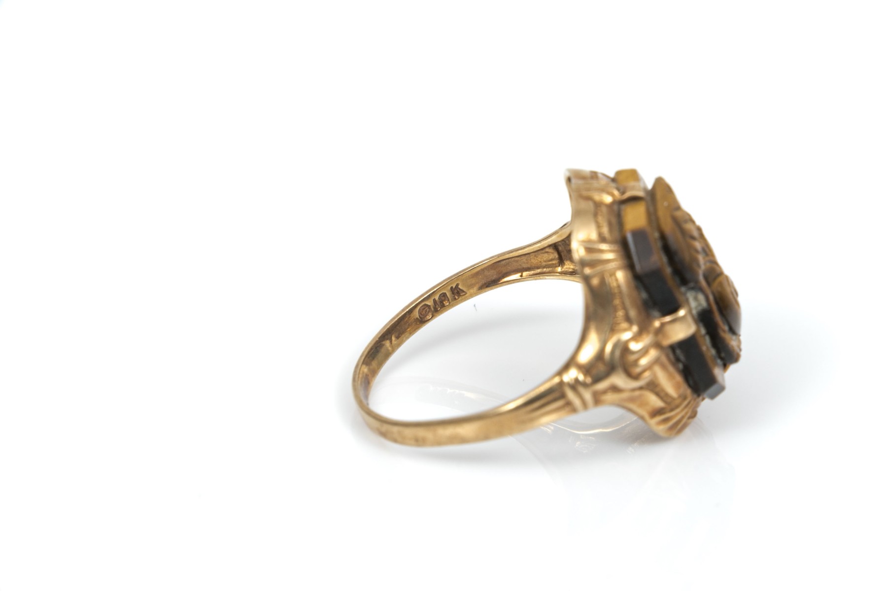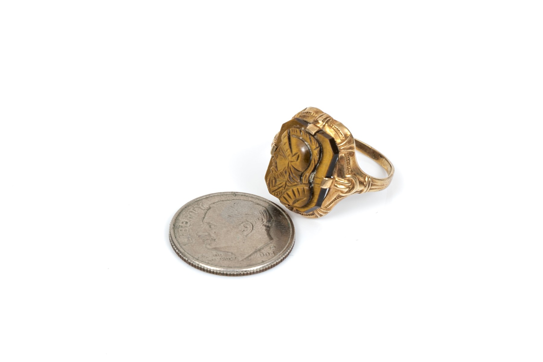10k yellow gold ornate vintage silhouette tigers eye cameo ring, size 5