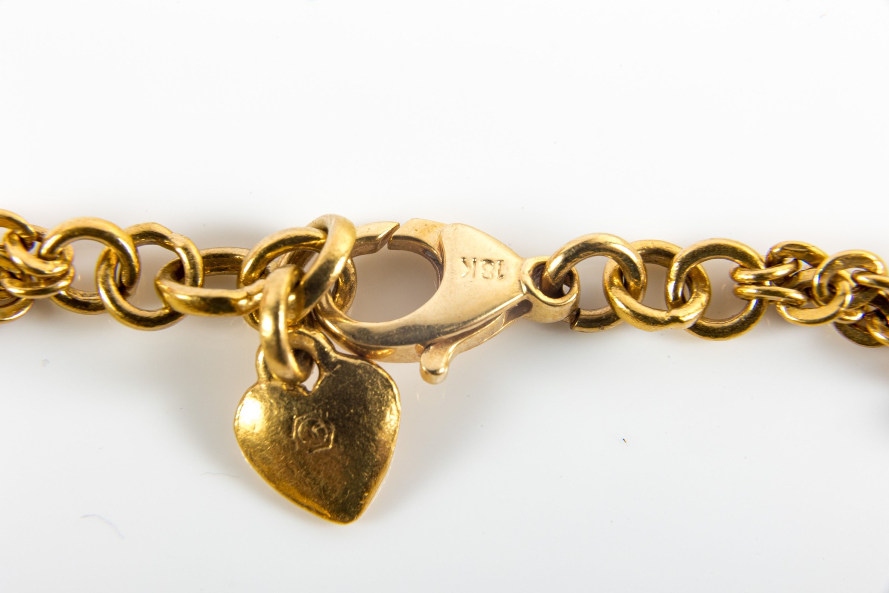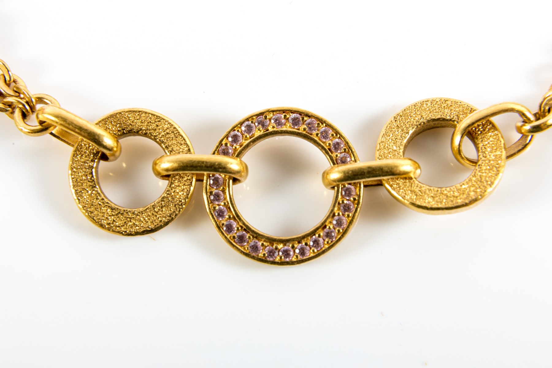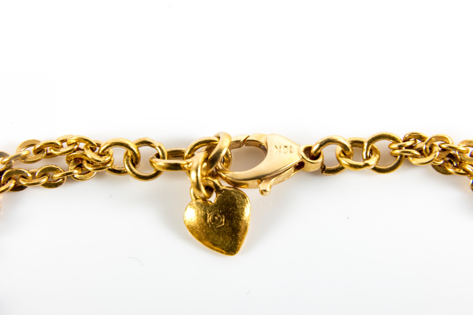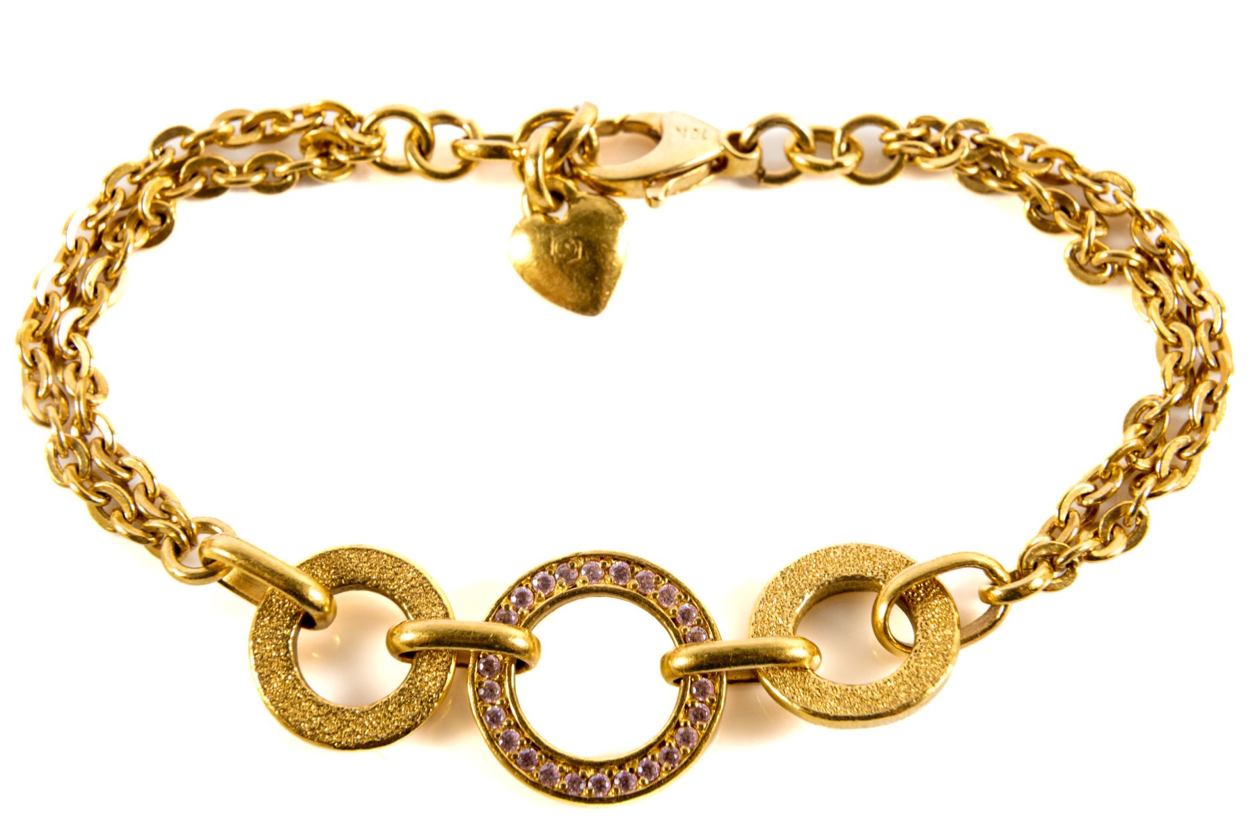 A double chain marked 10K yellow gold bracelet with three ring charms, the largest of which features an array pink moissanite stones.