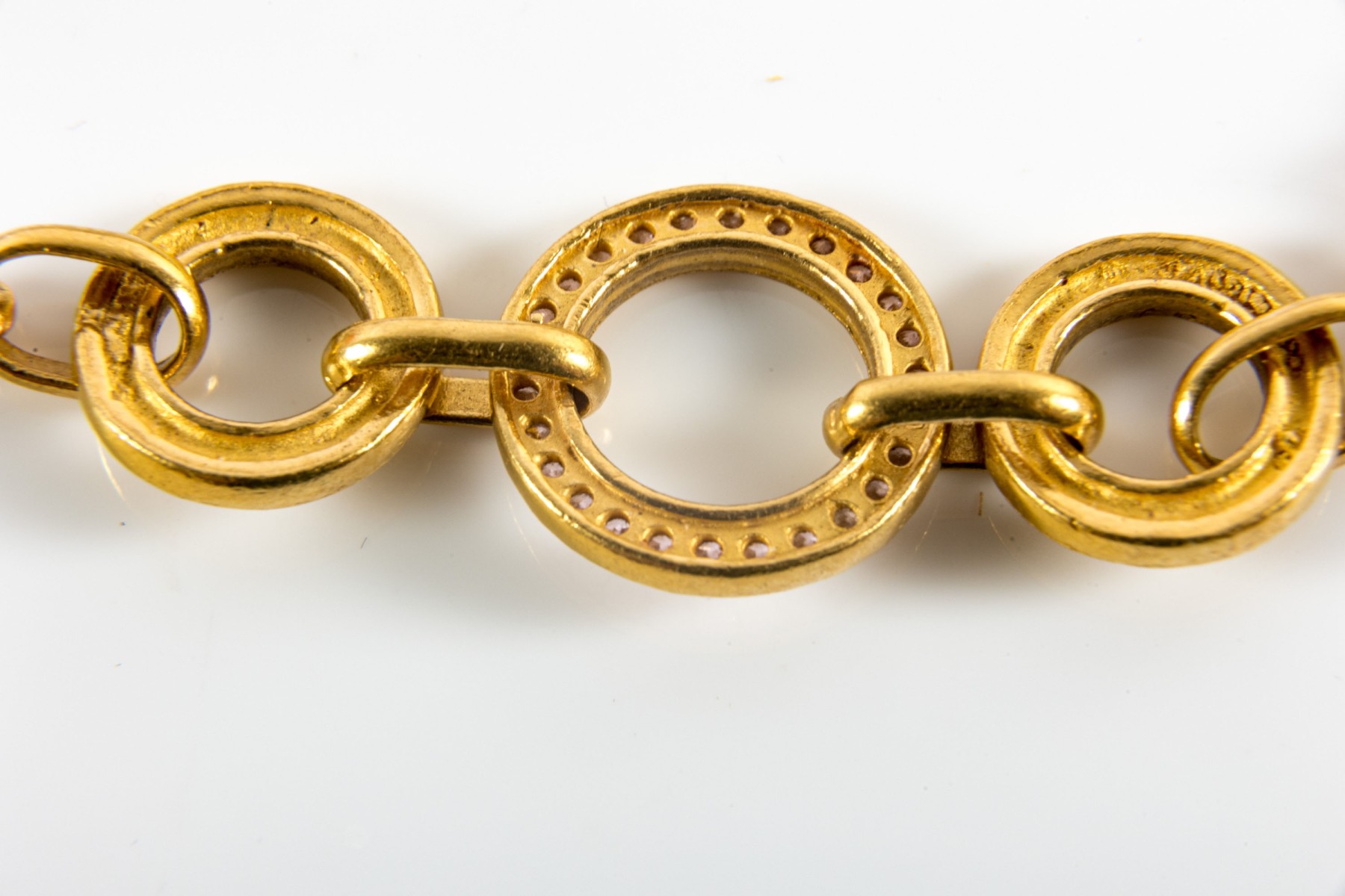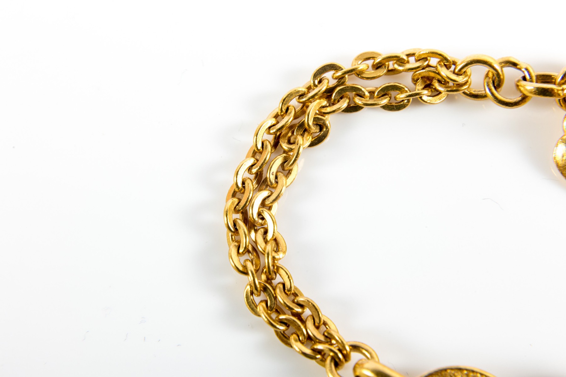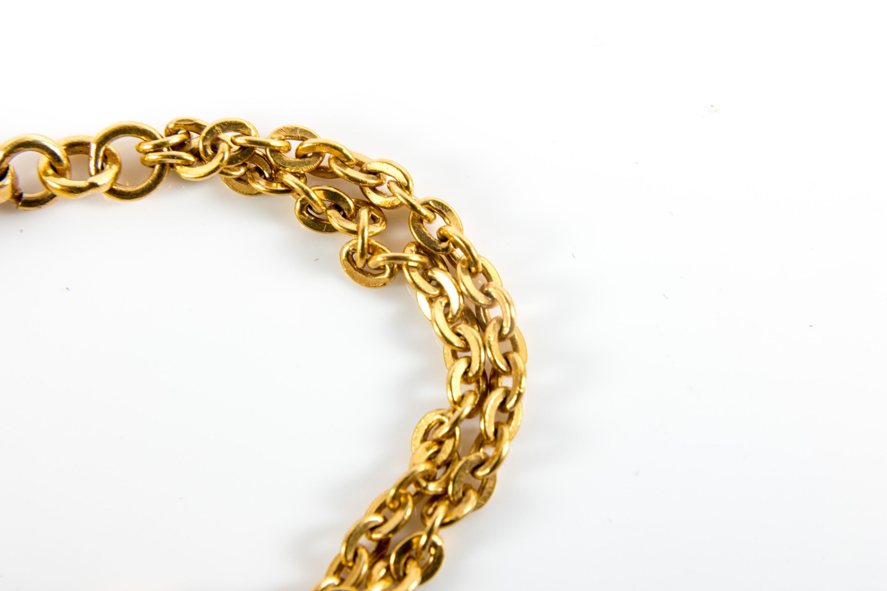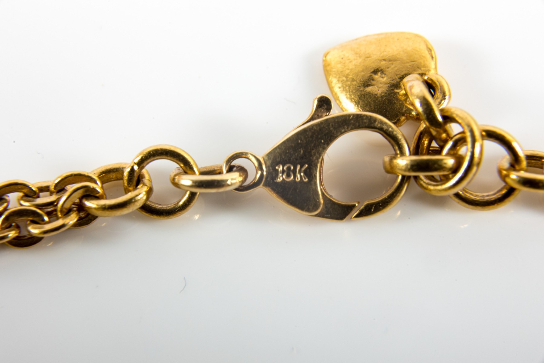 A double chain marked 10K yellow gold bracelet with three ring charms, the largest of which features an array pink moissanite stones.