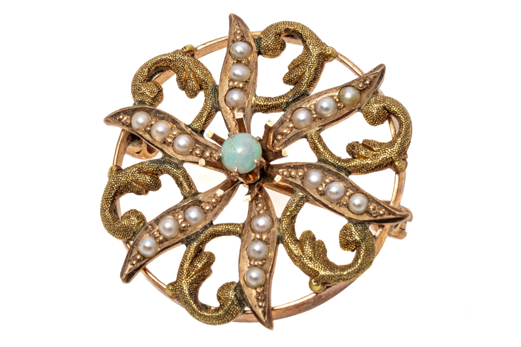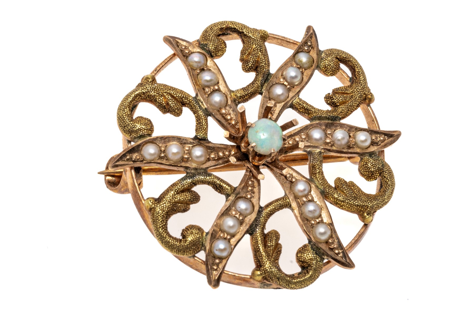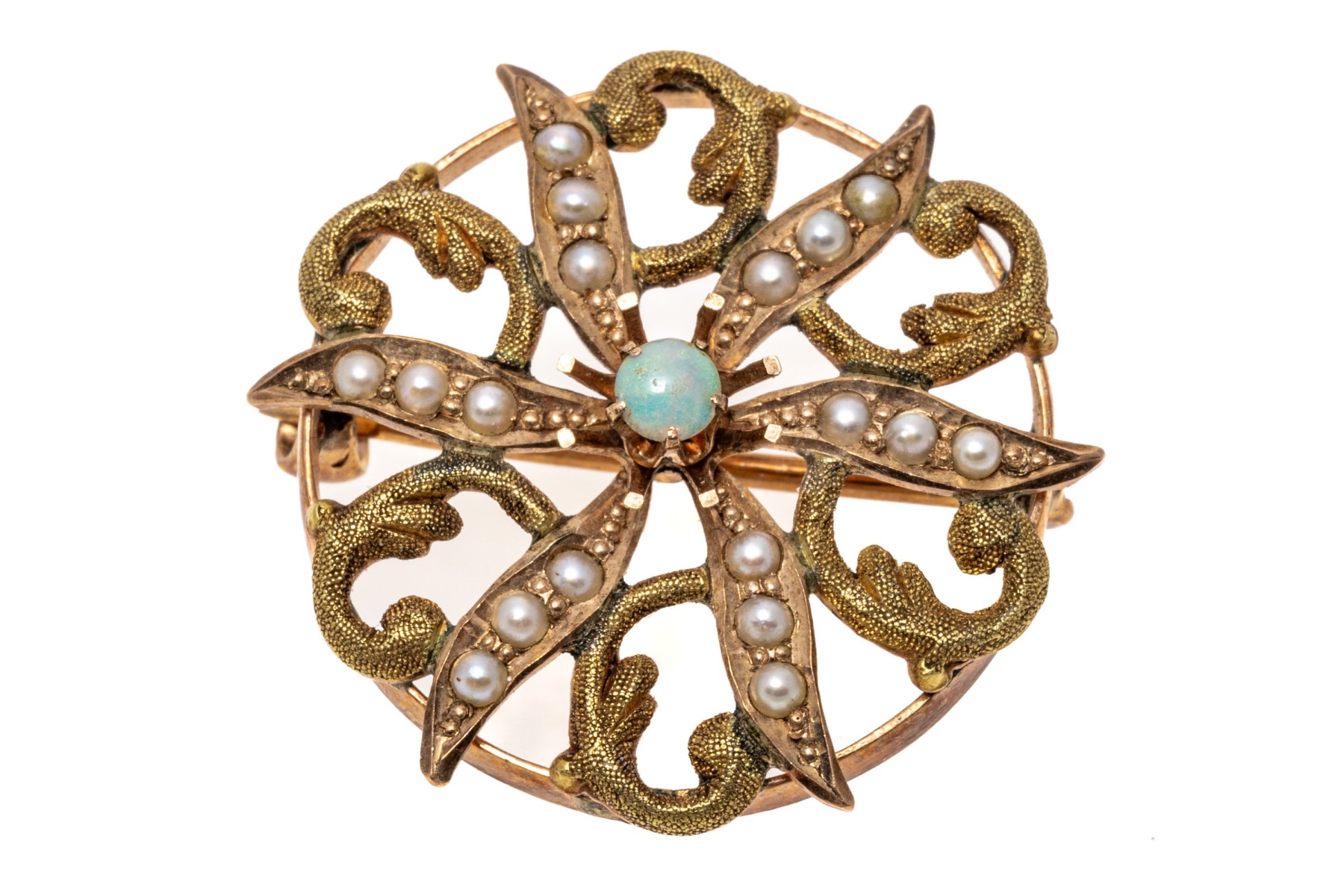 10k yellow gold pretty antique seed pearl and white opal circle brooch