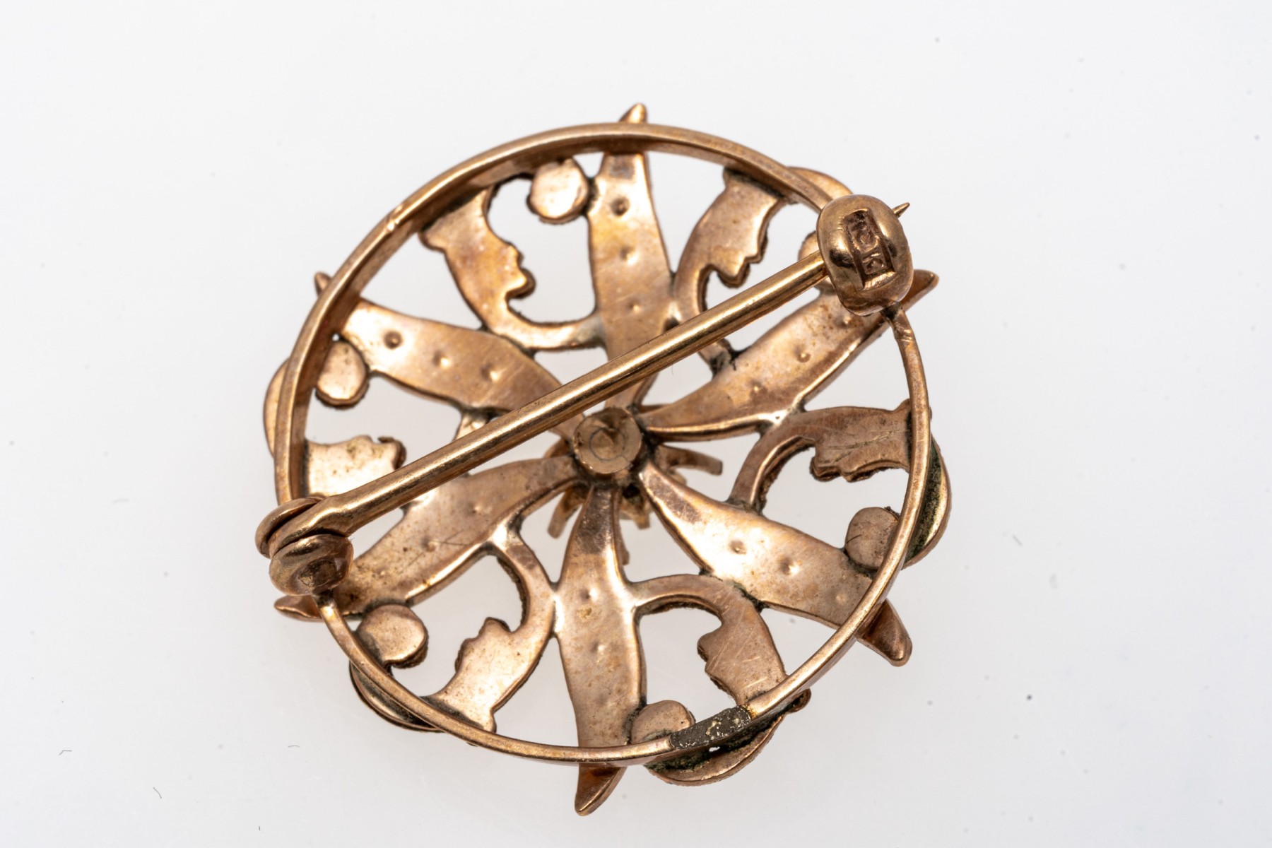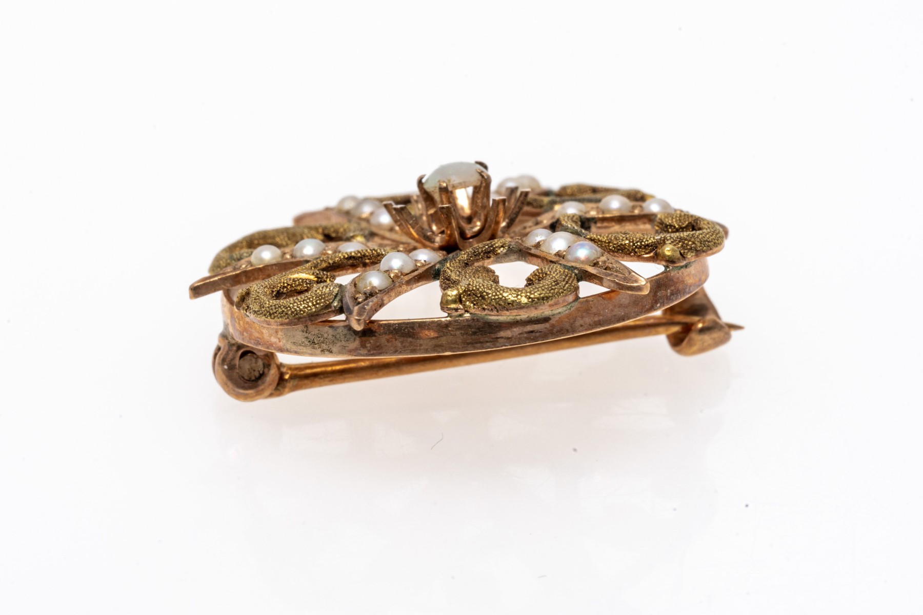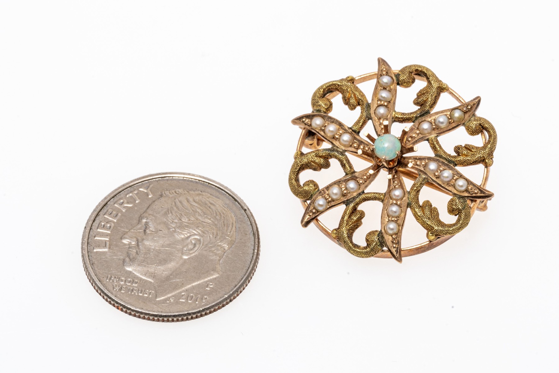 10k yellow gold pretty antique seed pearl and white opal circle brooch