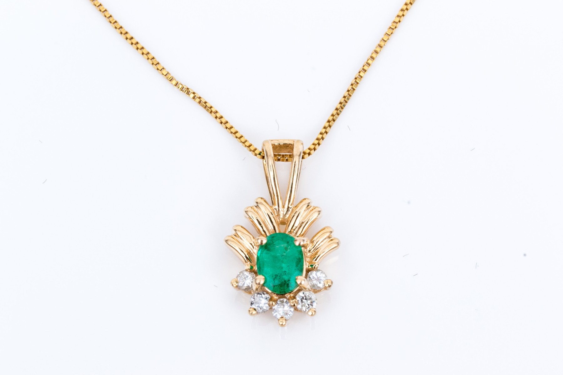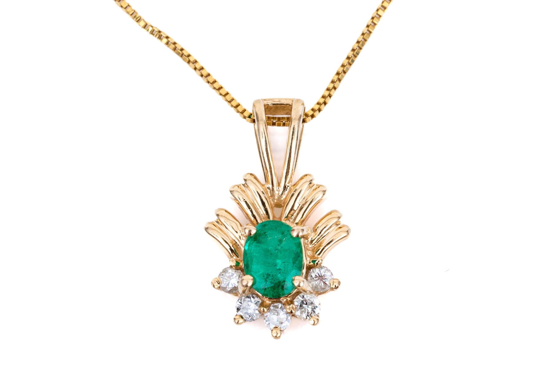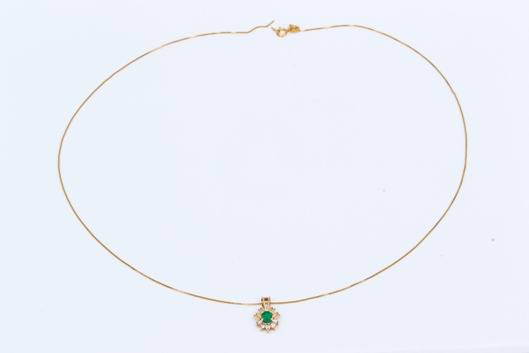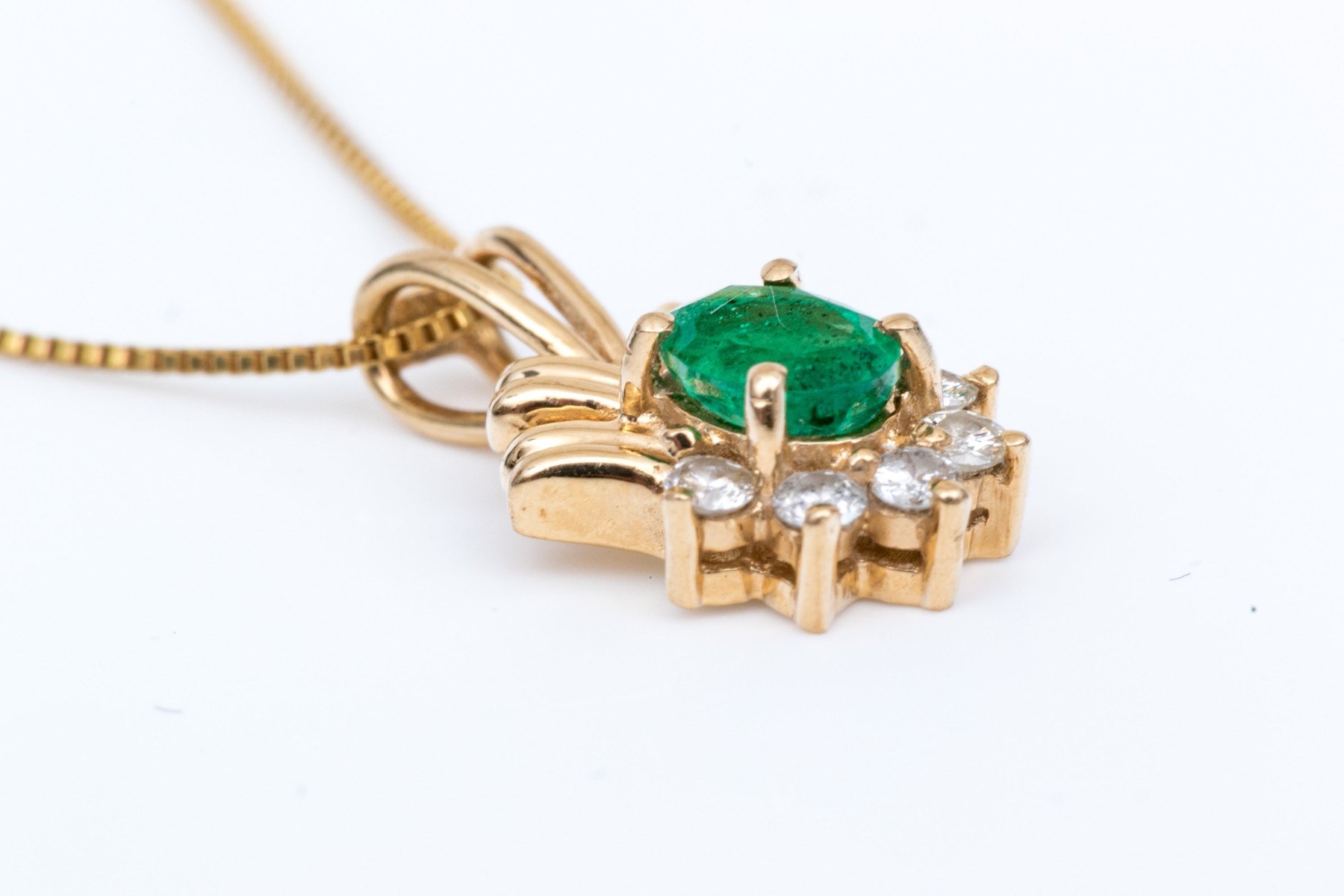 10k yellow gold pretty emerald, 0.27 CTS, and diamond pendant, app. 0.04 TCW, prong set, finished with a box link style chain, broken