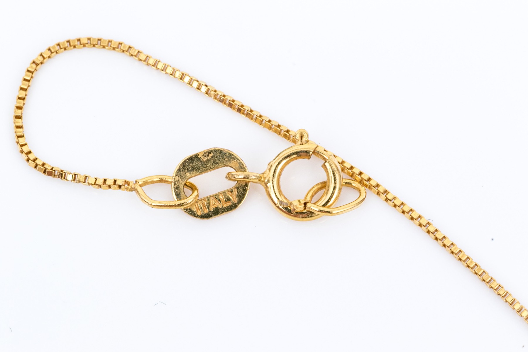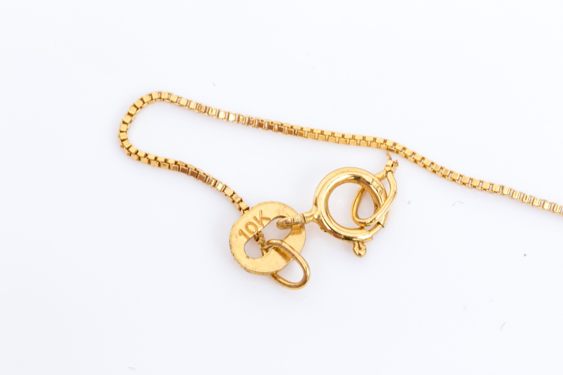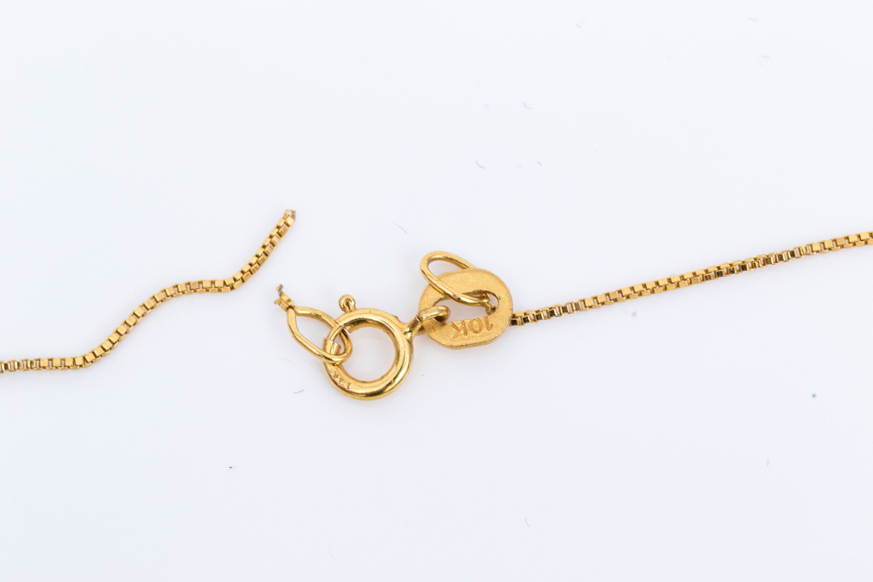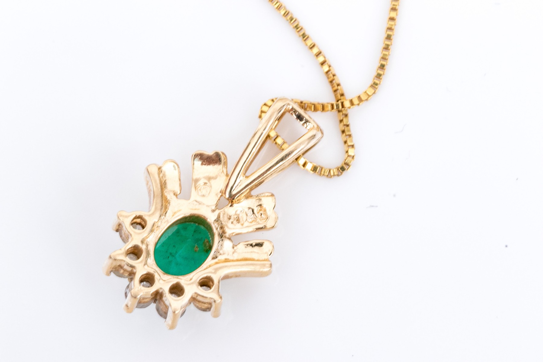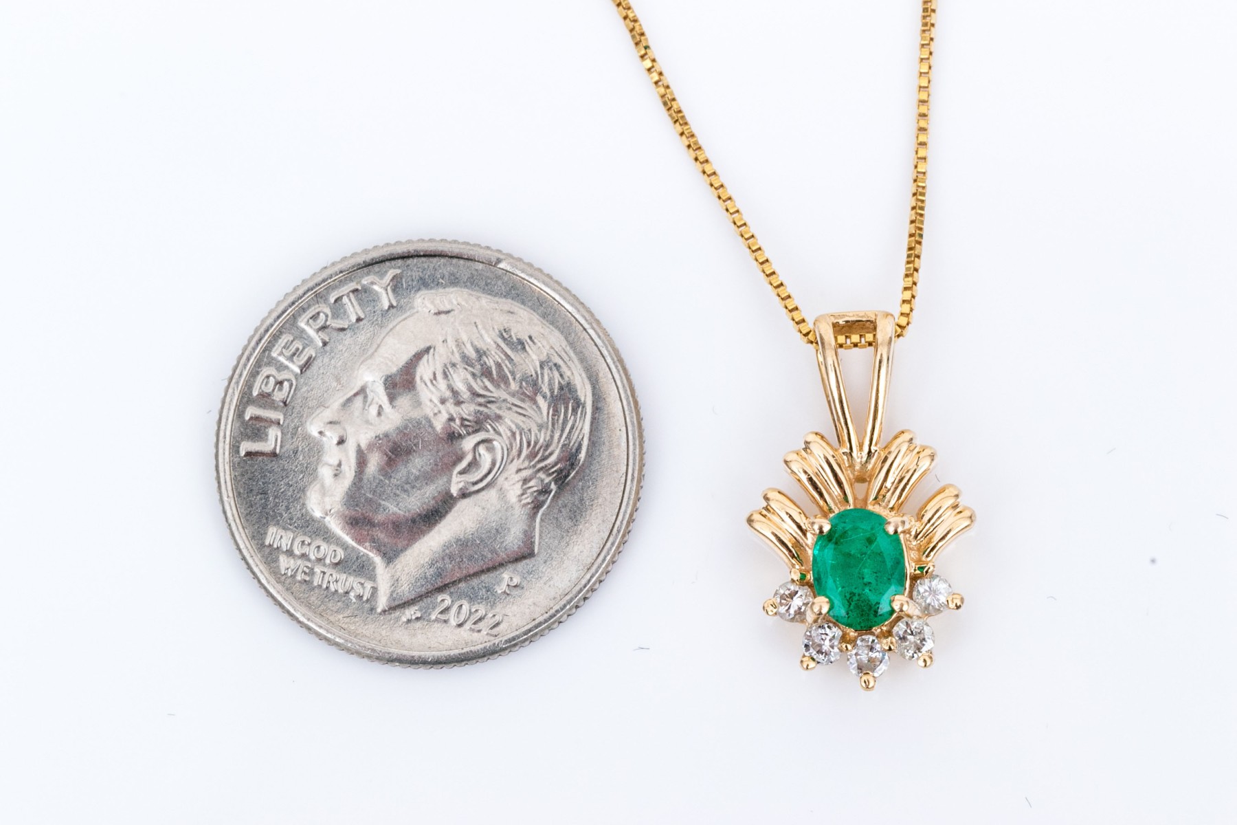 10k yellow gold pretty emerald, 0.27 CTS, and diamond pendant, app. 0.04 TCW, prong set, finished with a box link style chain, broken