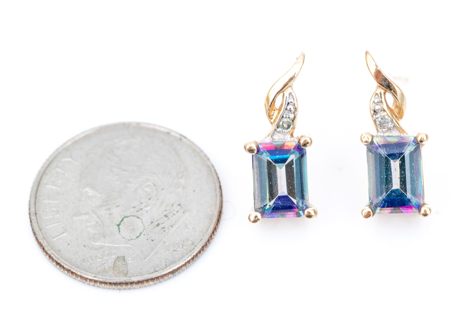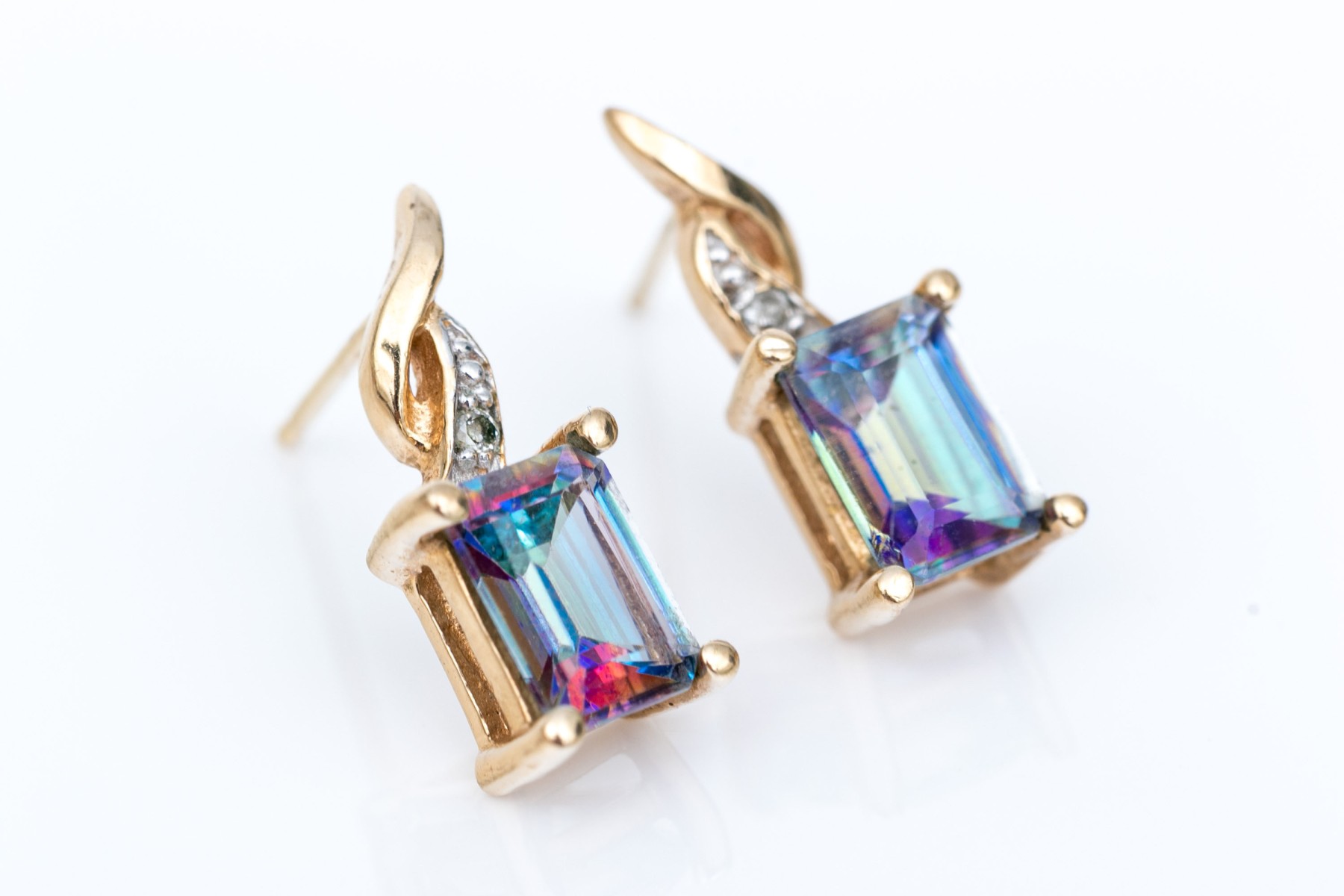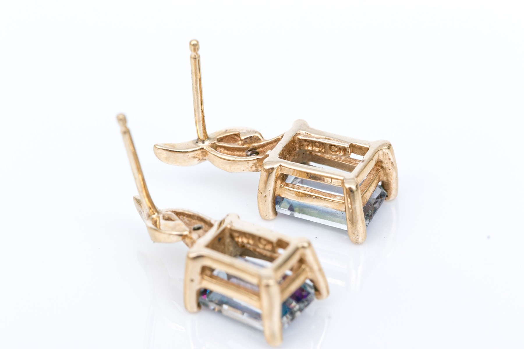 10k yellow gold pretty mystic topaz slight drop earrings, finished with posts and missing clutches