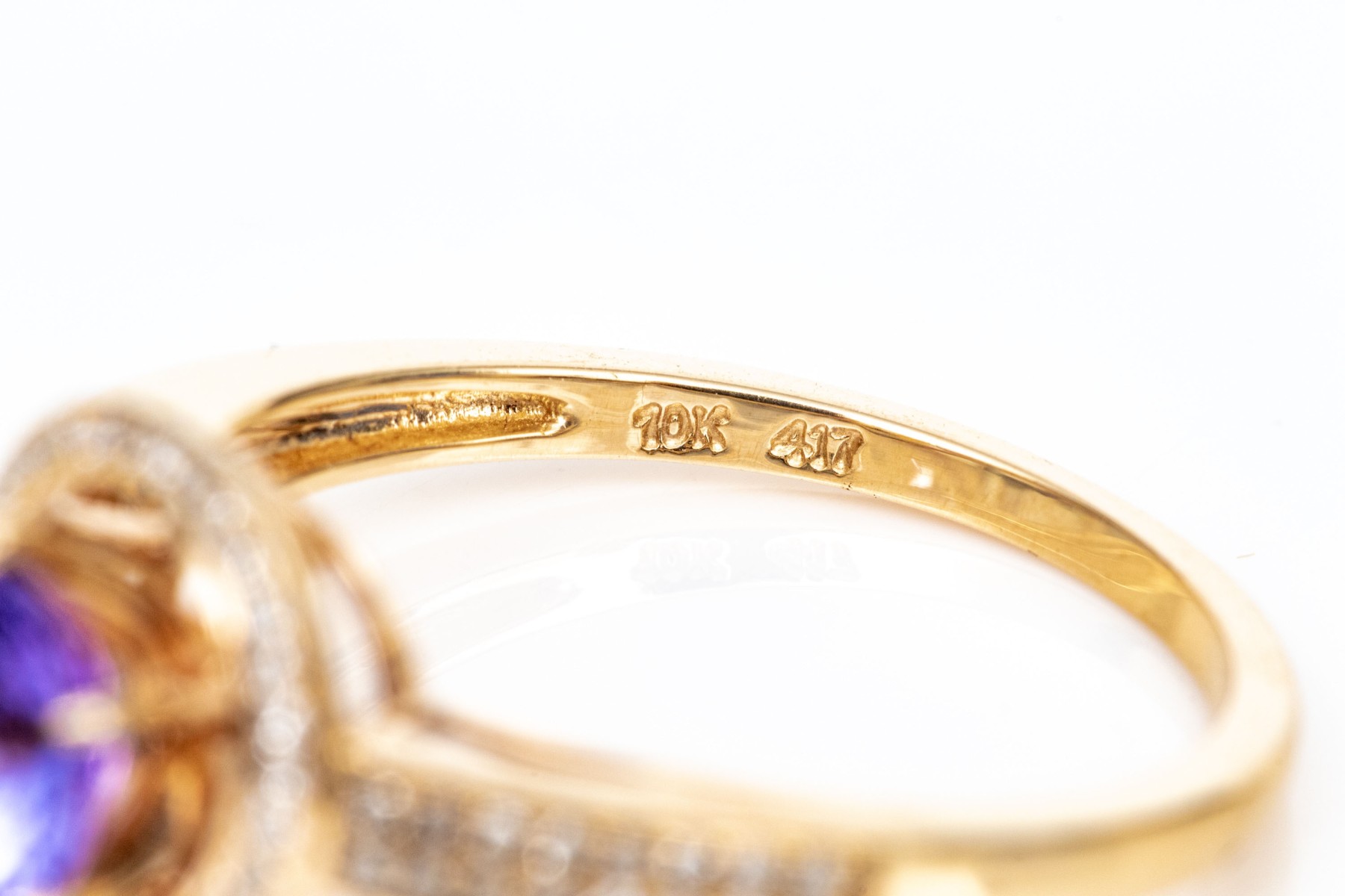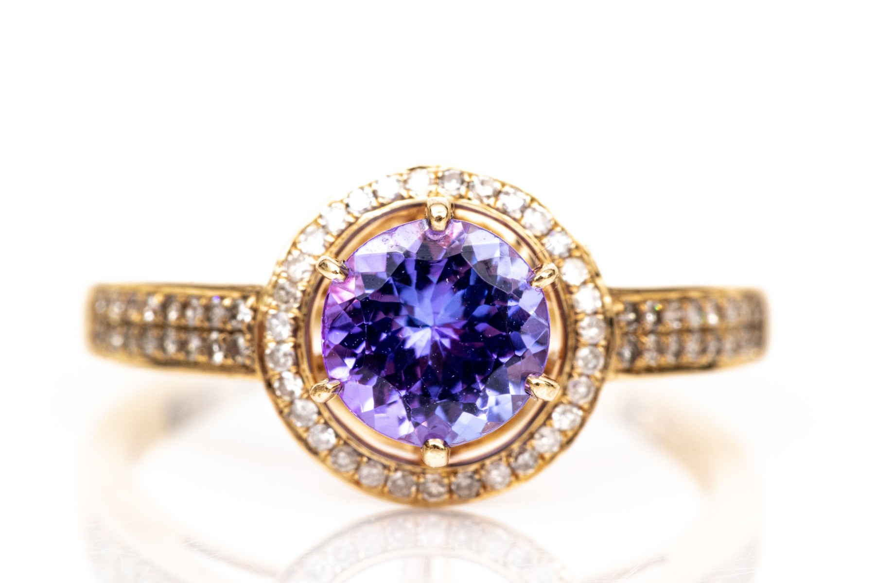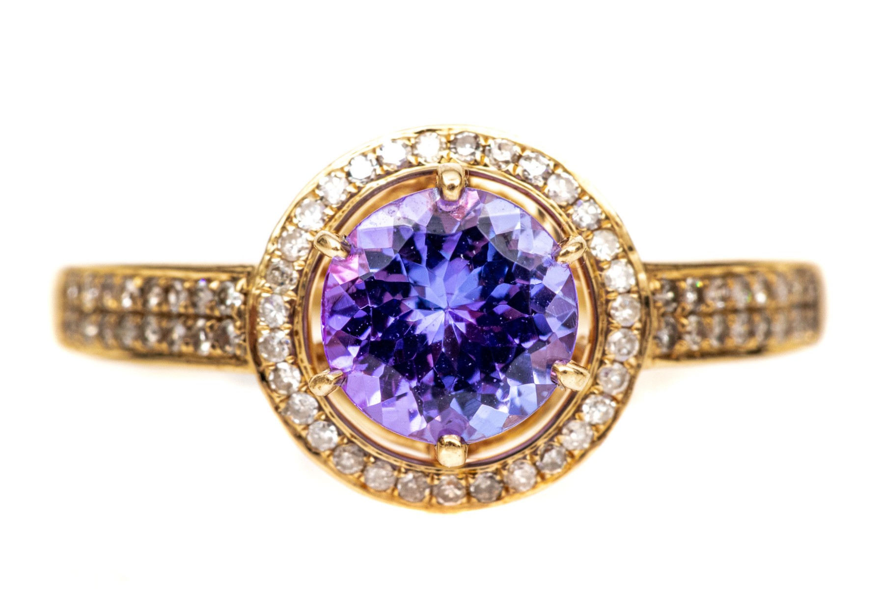 10k yellow gold pretty tanzaite and diamond halo ring, size 6.5. This lovely ring features a round faceted center tanzaite, app. 0.76 CTS, framed by a halo of round faceted diamonds which extend down into the shoulders, app. 0.15 TCW, I1 clarity, J to K color.