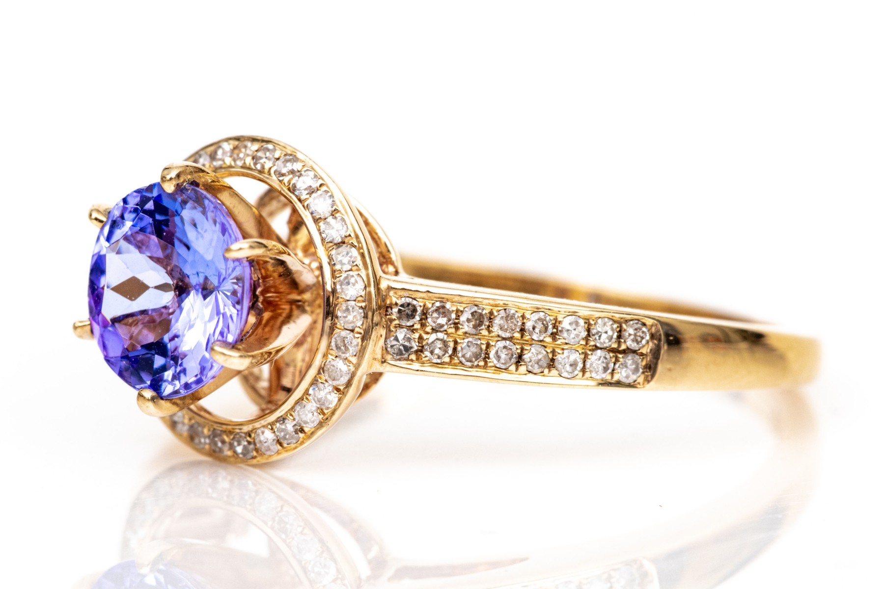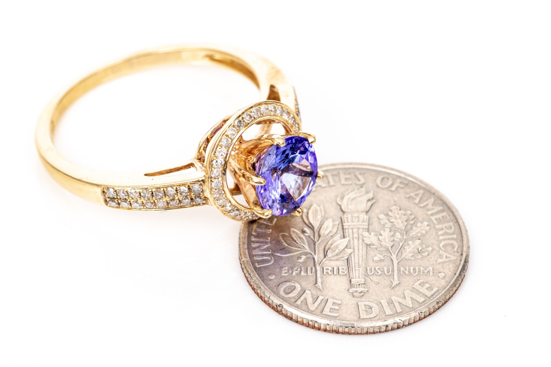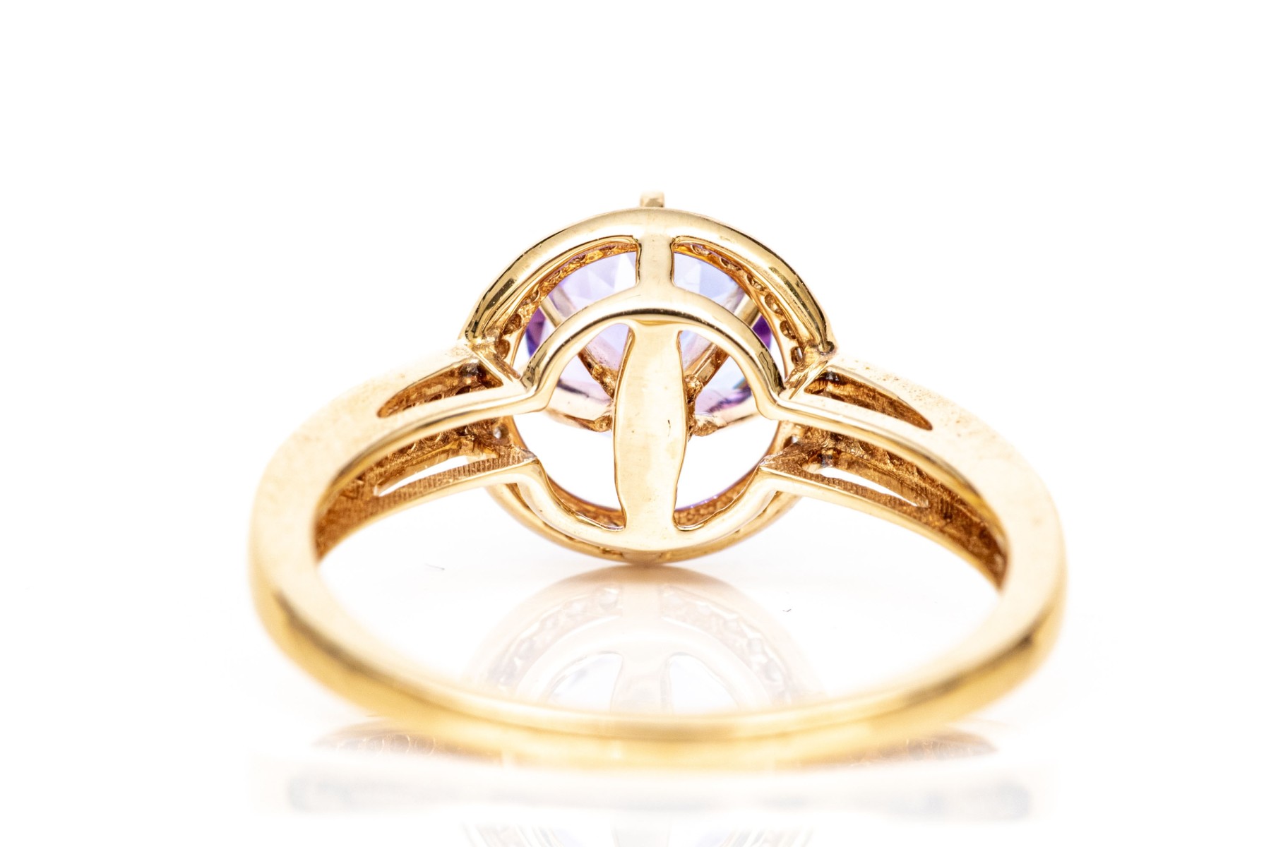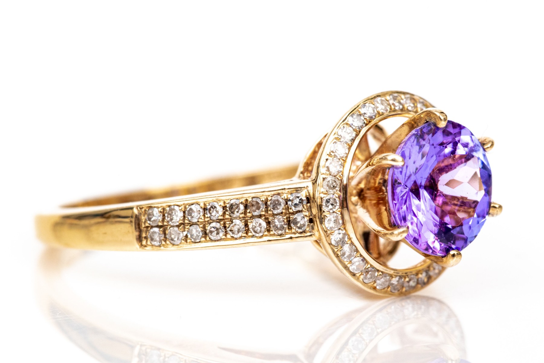 10k yellow gold pretty tanzaite and diamond halo ring, size 6.5. This lovely ring features a round faceted center tanzaite, app. 0.76 CTS, framed by a halo of round faceted diamonds which extend down into the shoulders, app. 0.15 TCW, I1 clarity, J to K color.