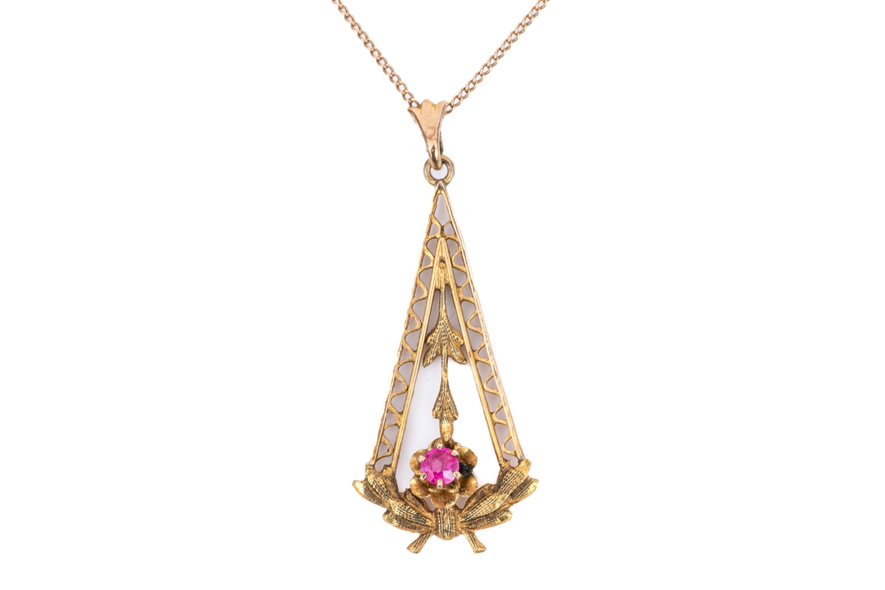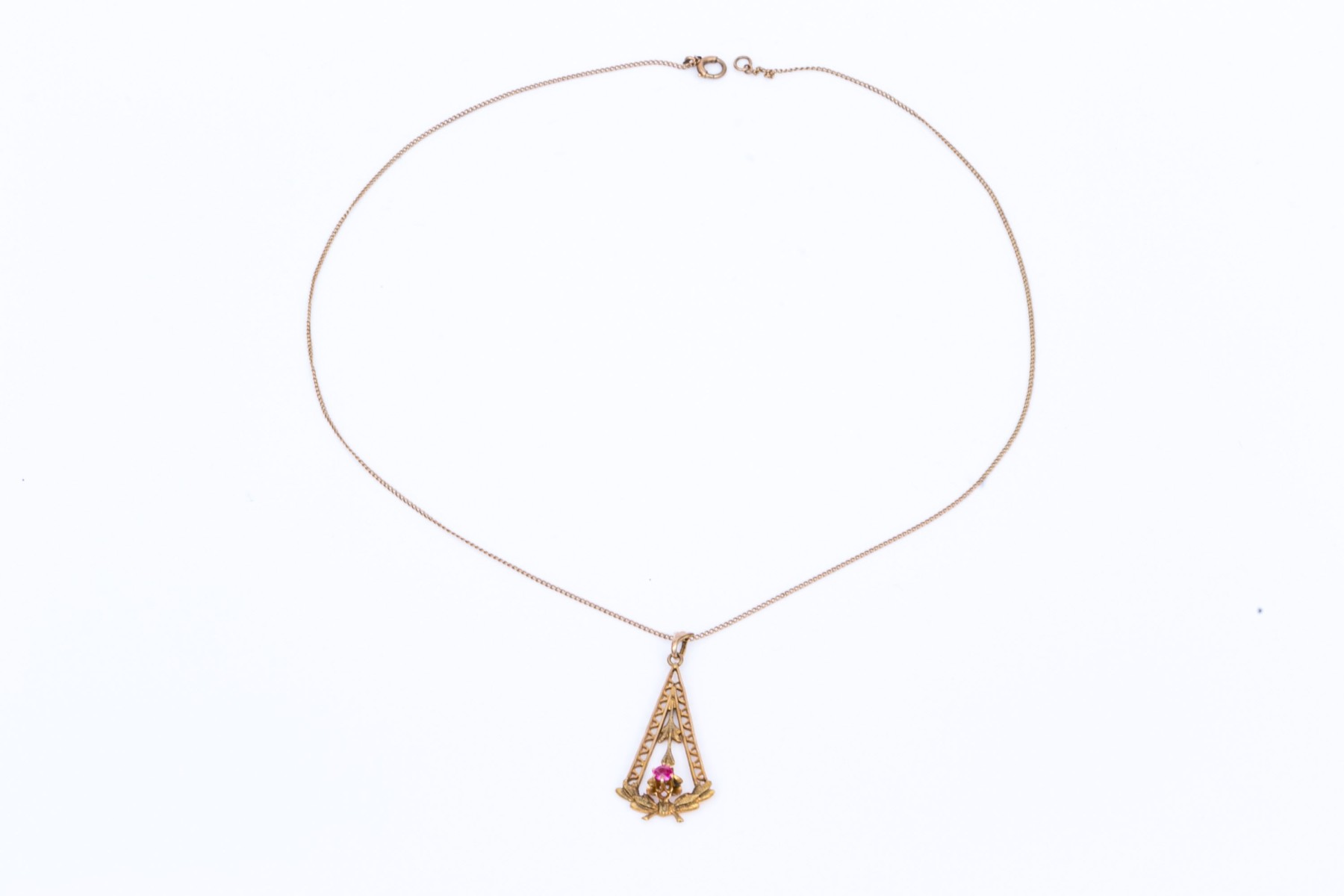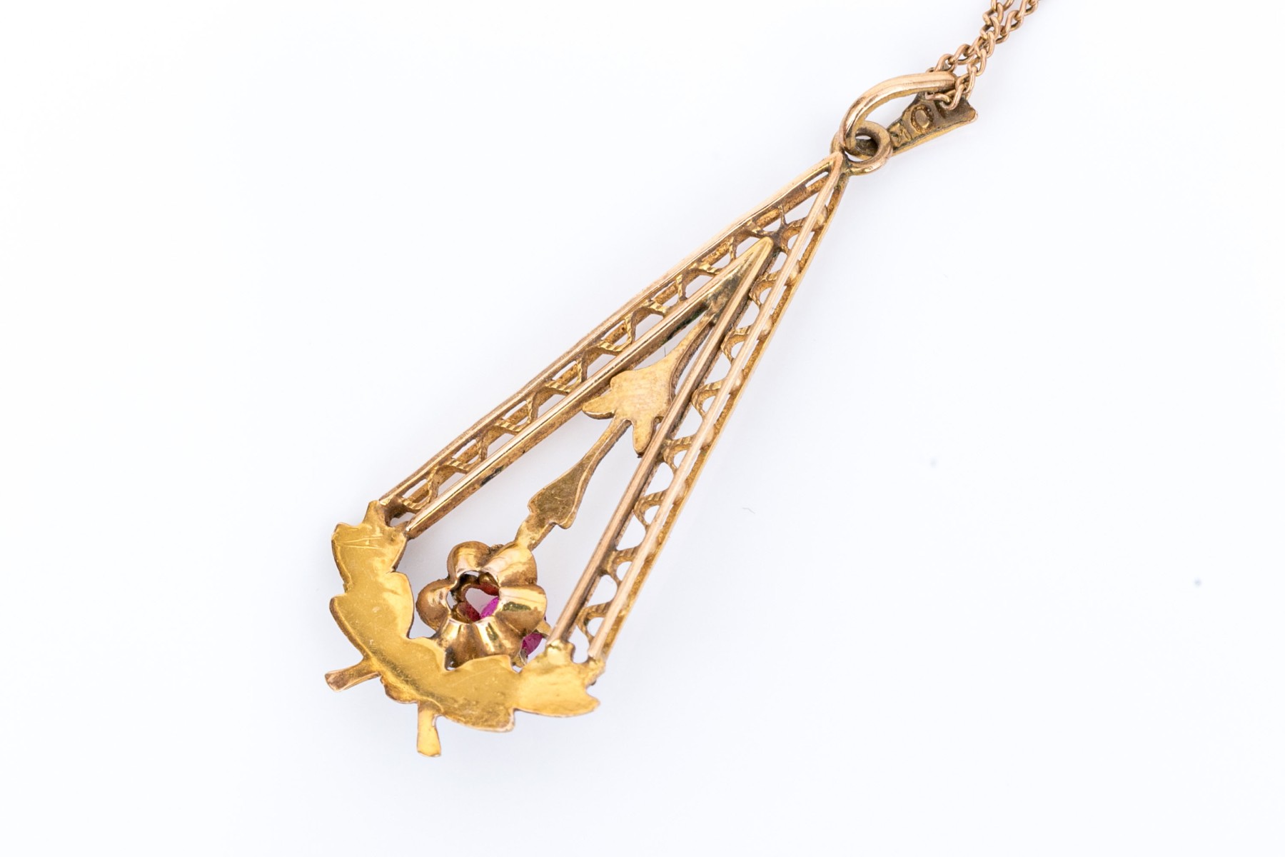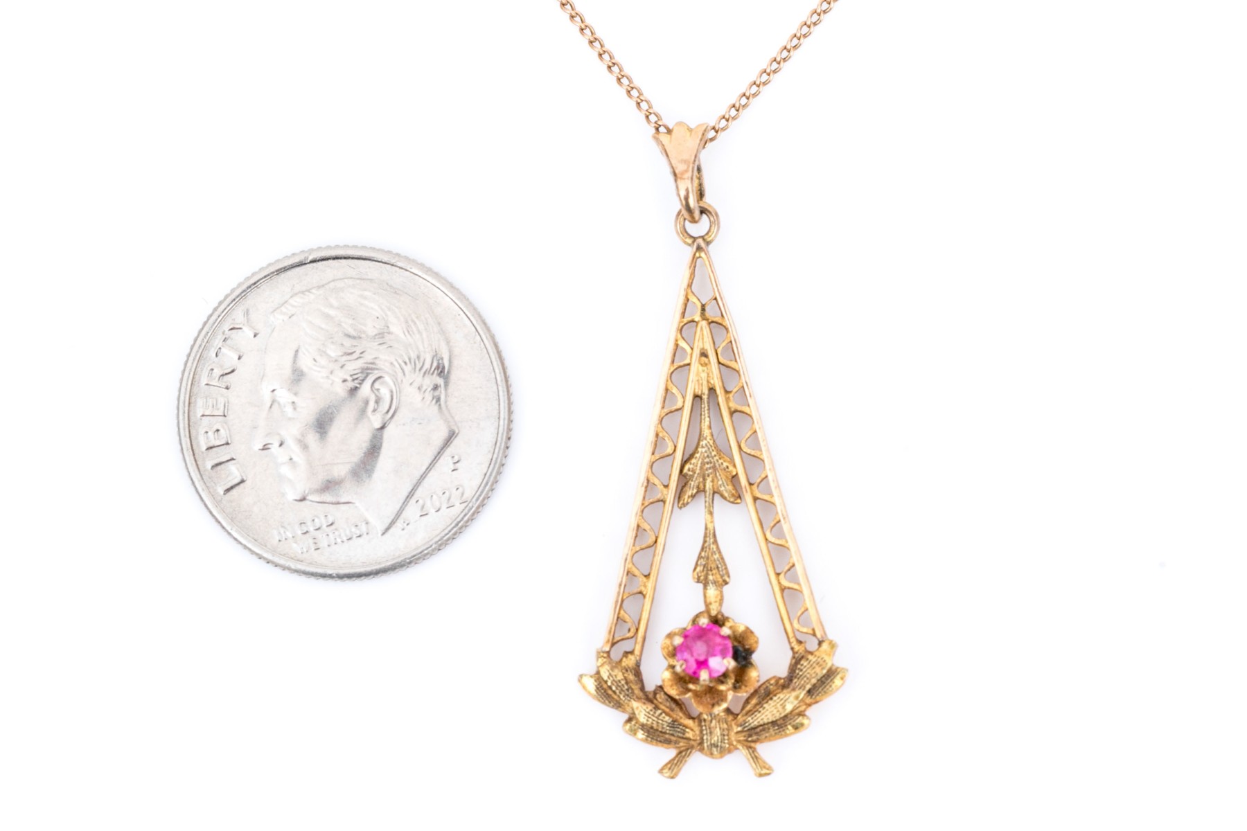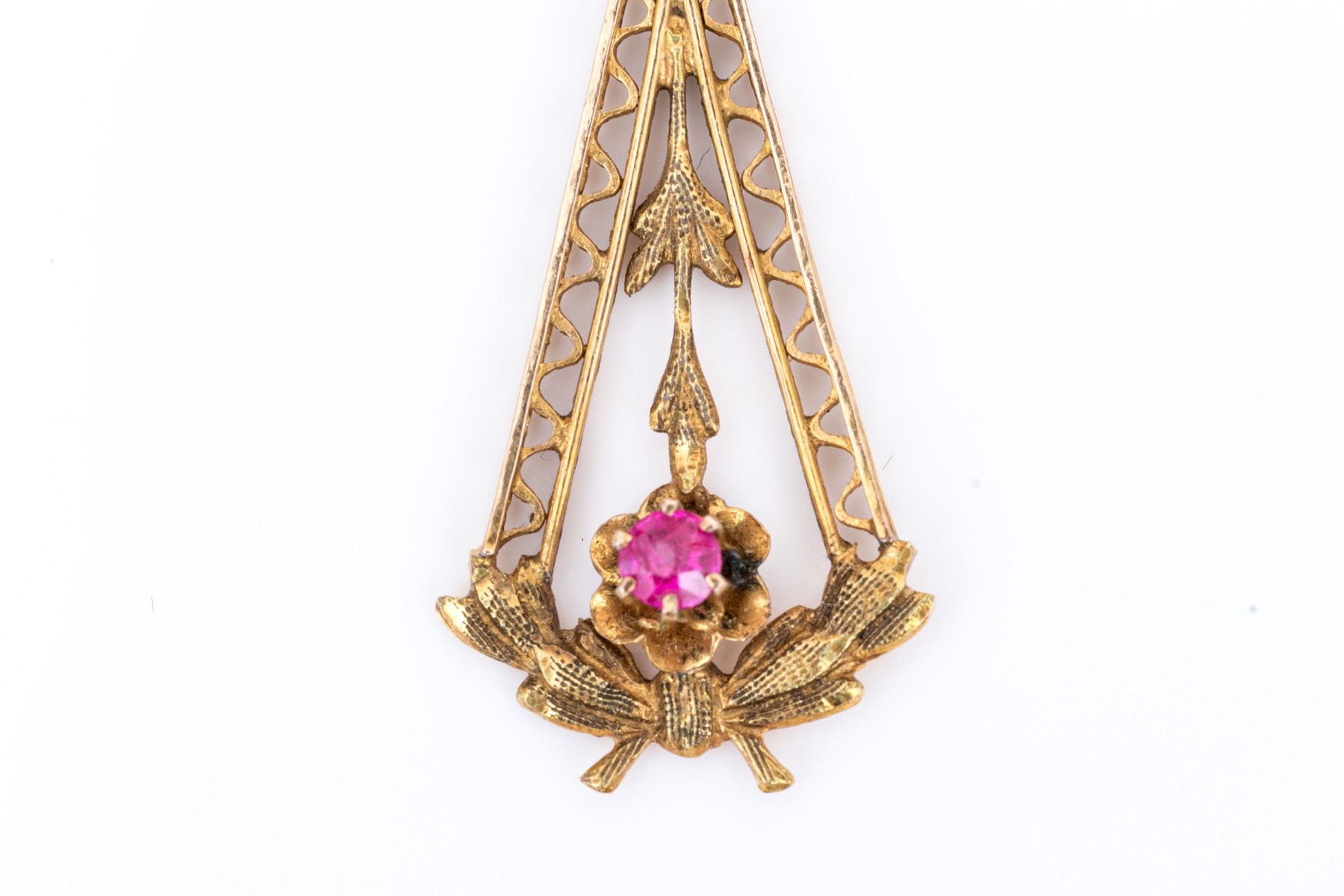 10k yellow gold pretty vintage ruby lavaliere pendant, 0.09 CTS, prong set, finished with a fine curb link style chain