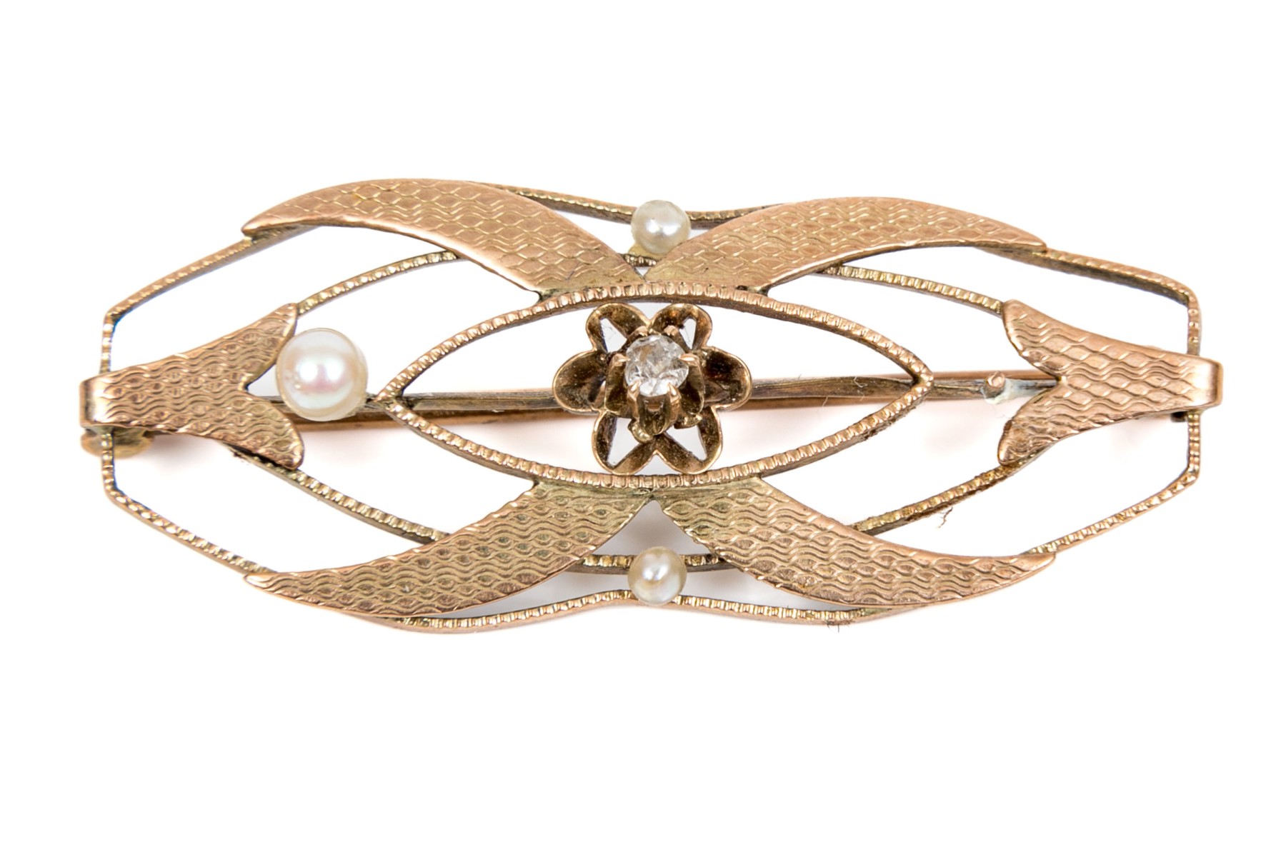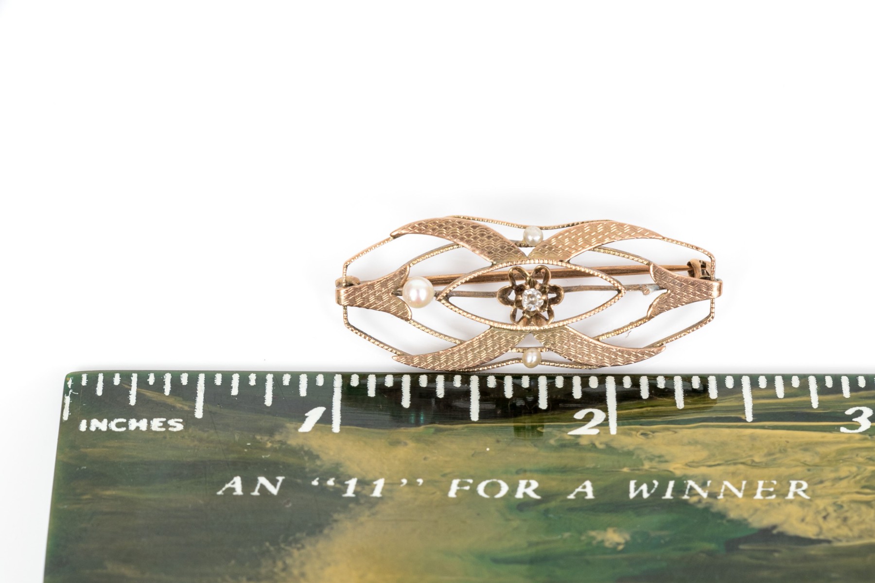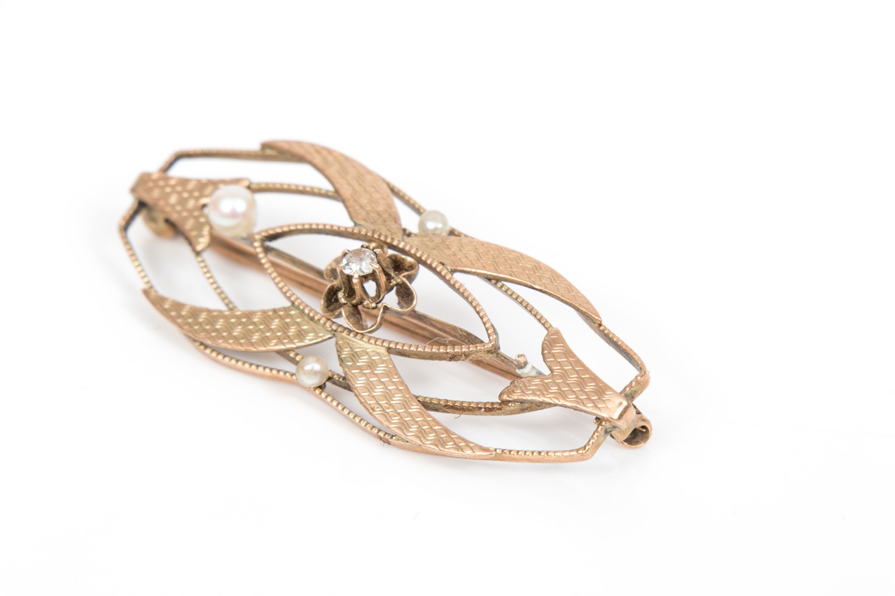 10k yellow gold pretty vintage seed pearl brooch, with a white sapphire center