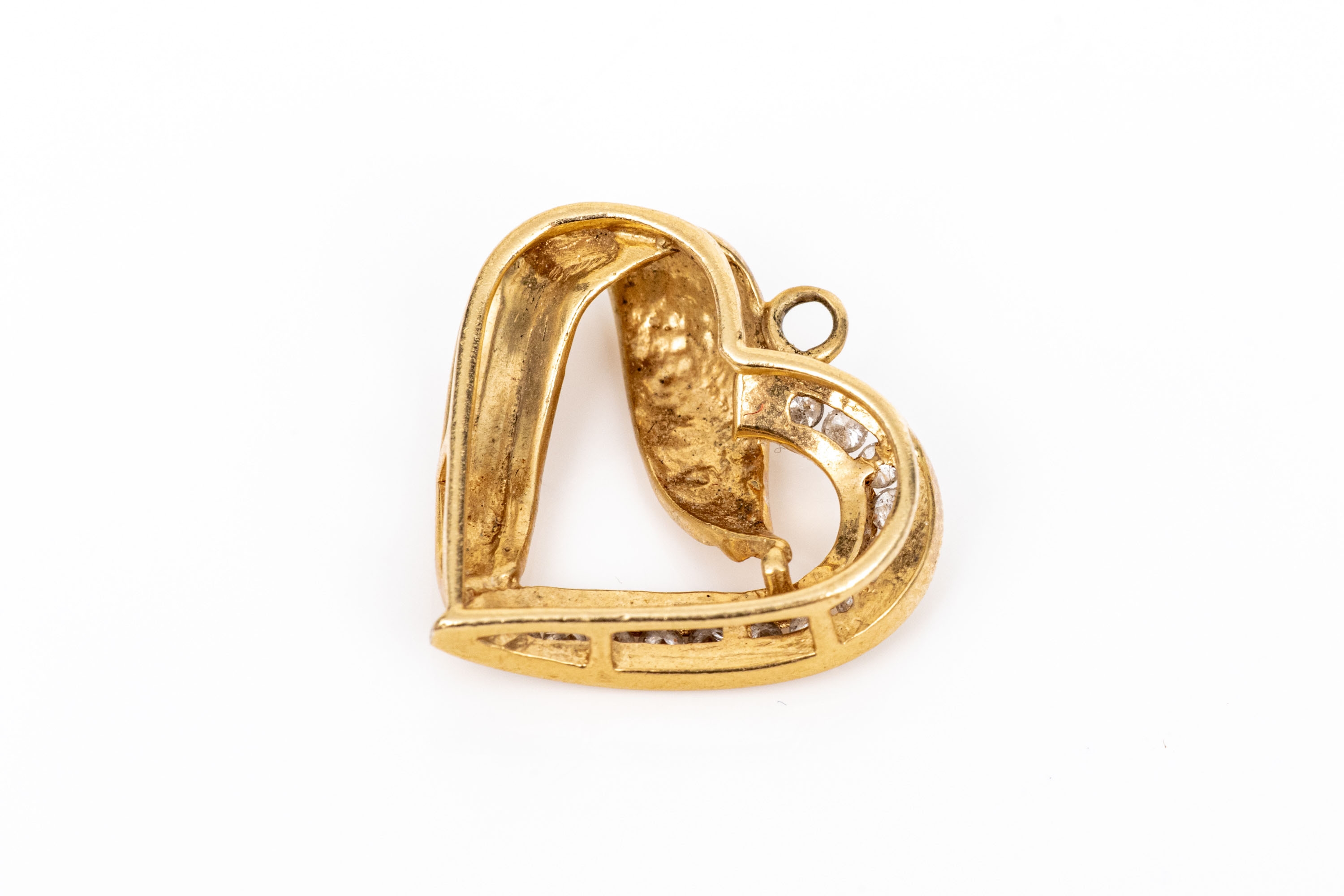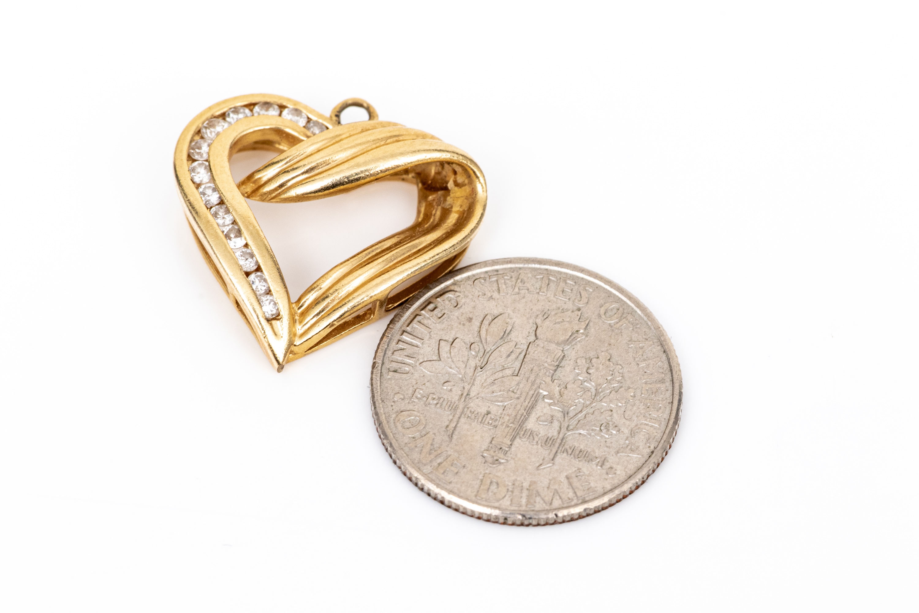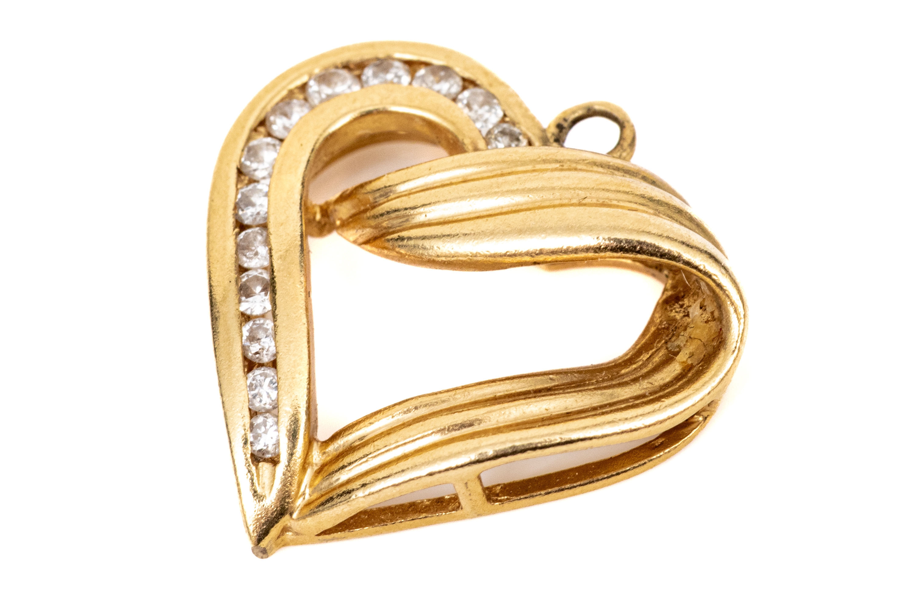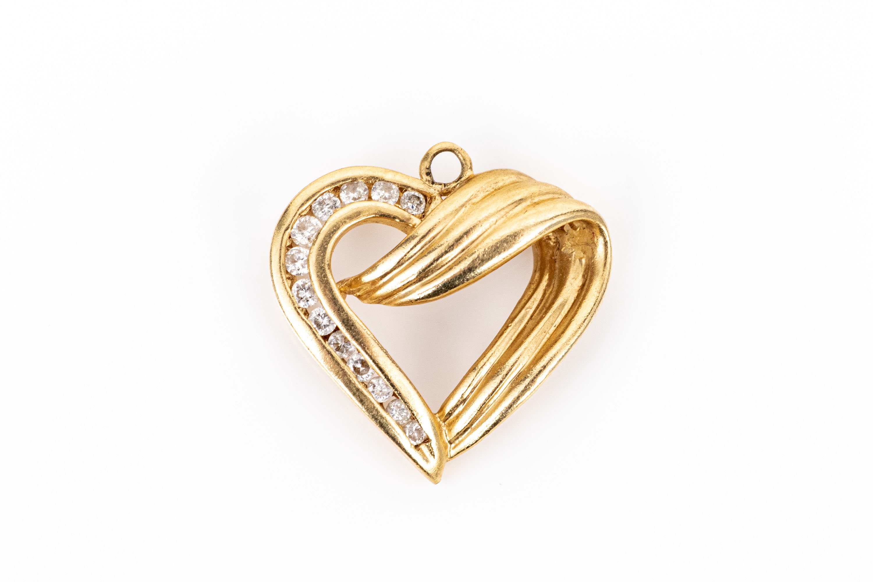 10k yellow gold retro channel diamond set ribbed open heart pendant, app. 0.07 TCW