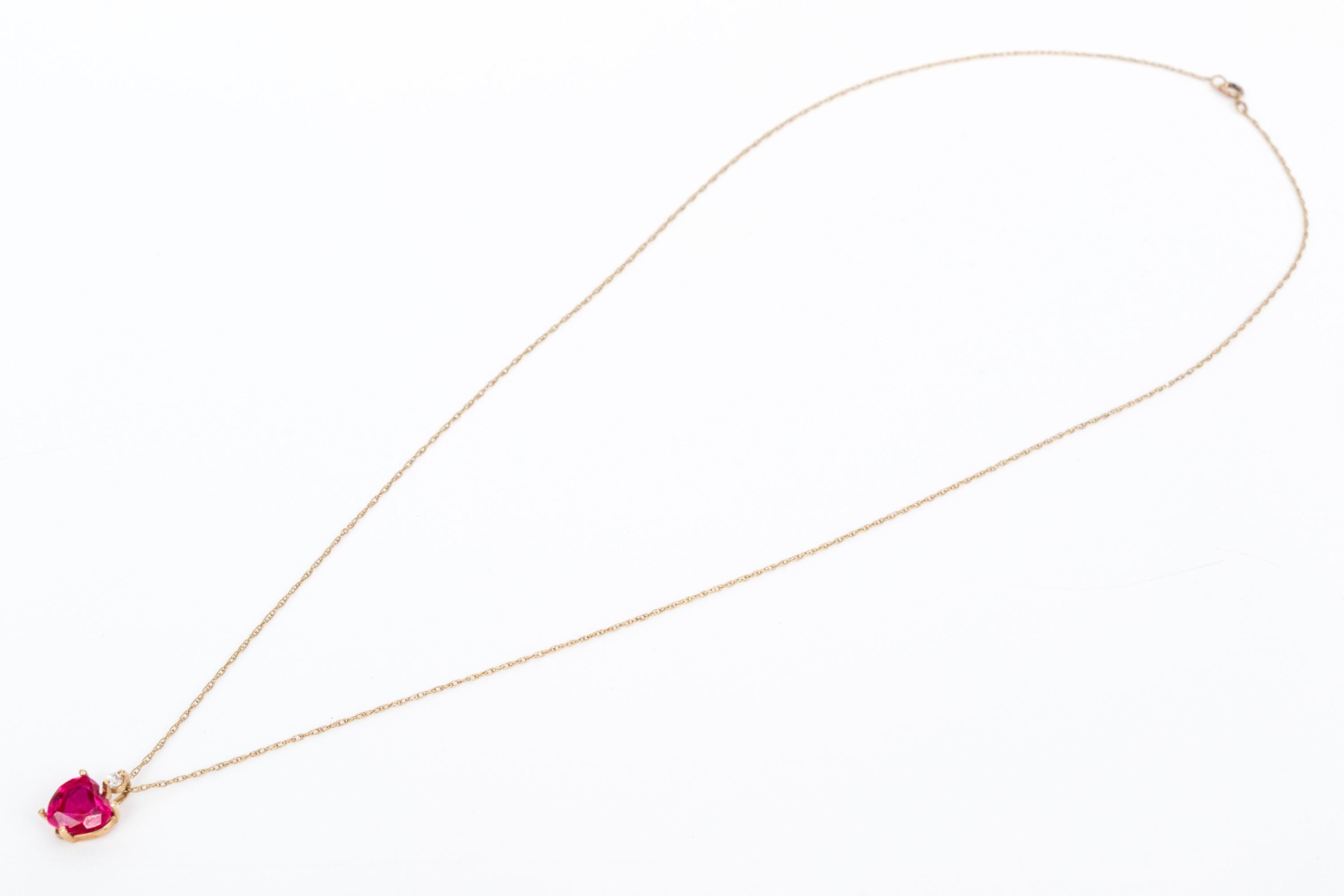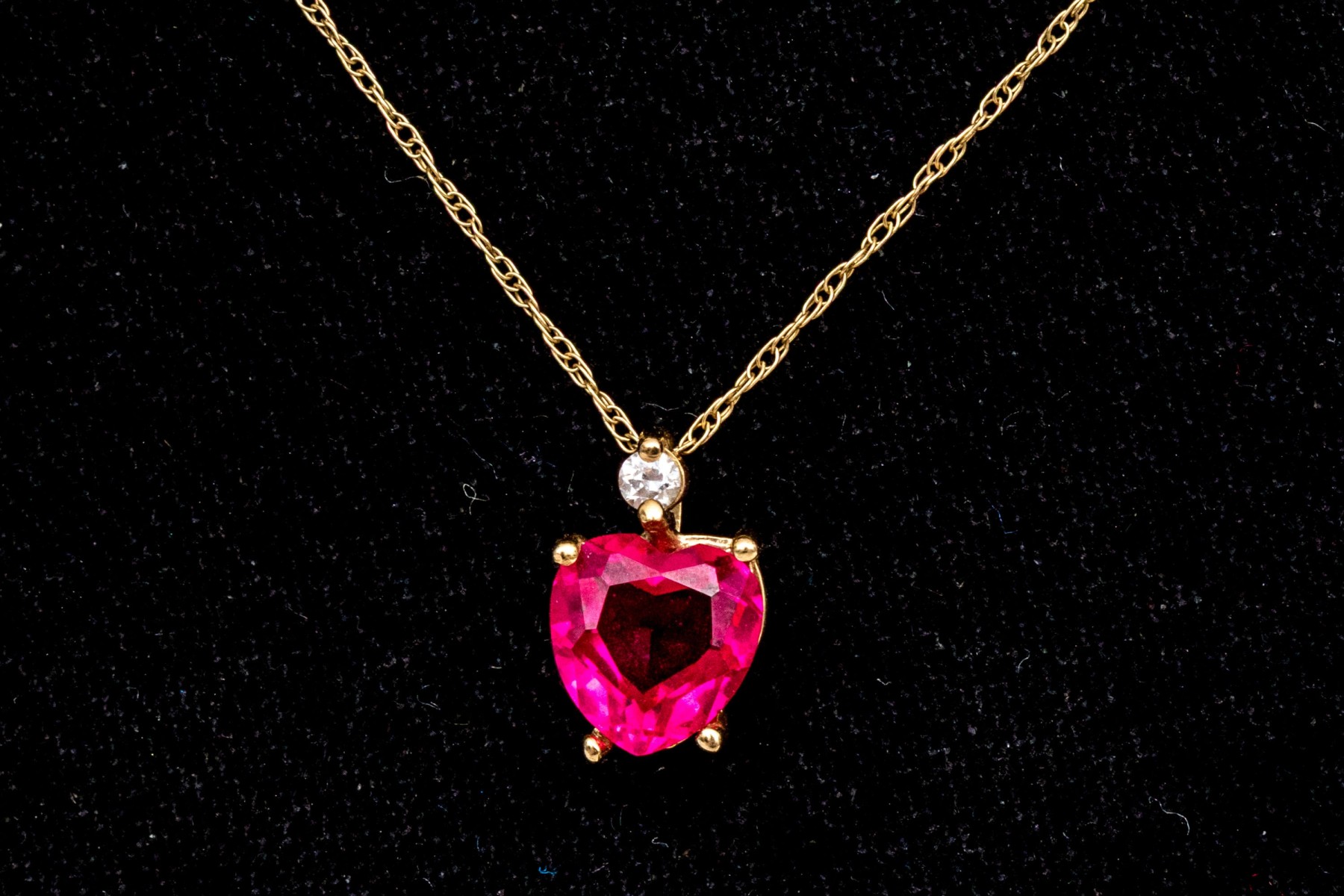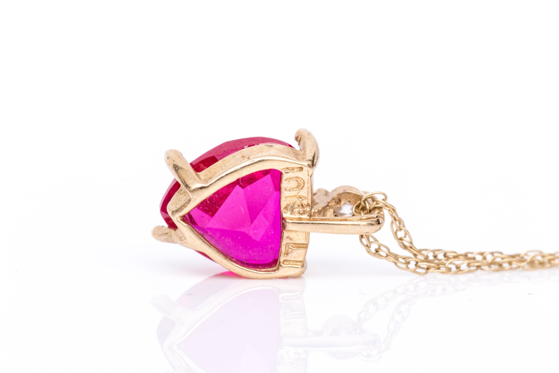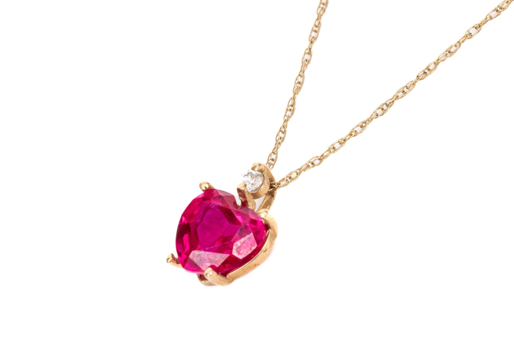 10k yellow gold synthetic ruby heart and cz pendant, on a gold filled chain