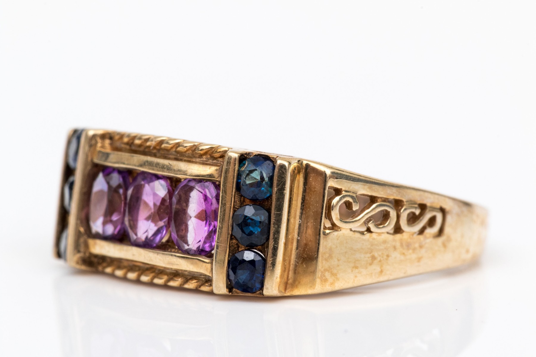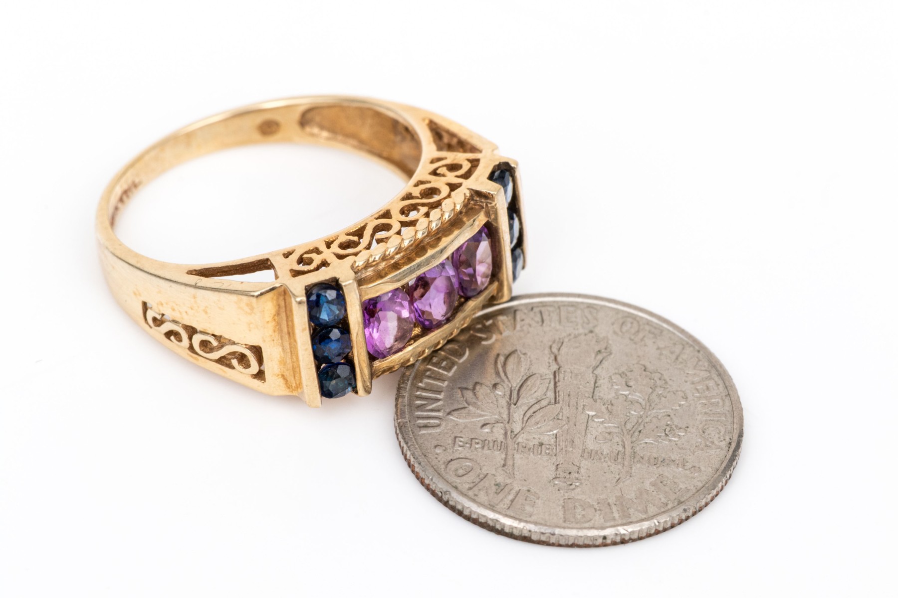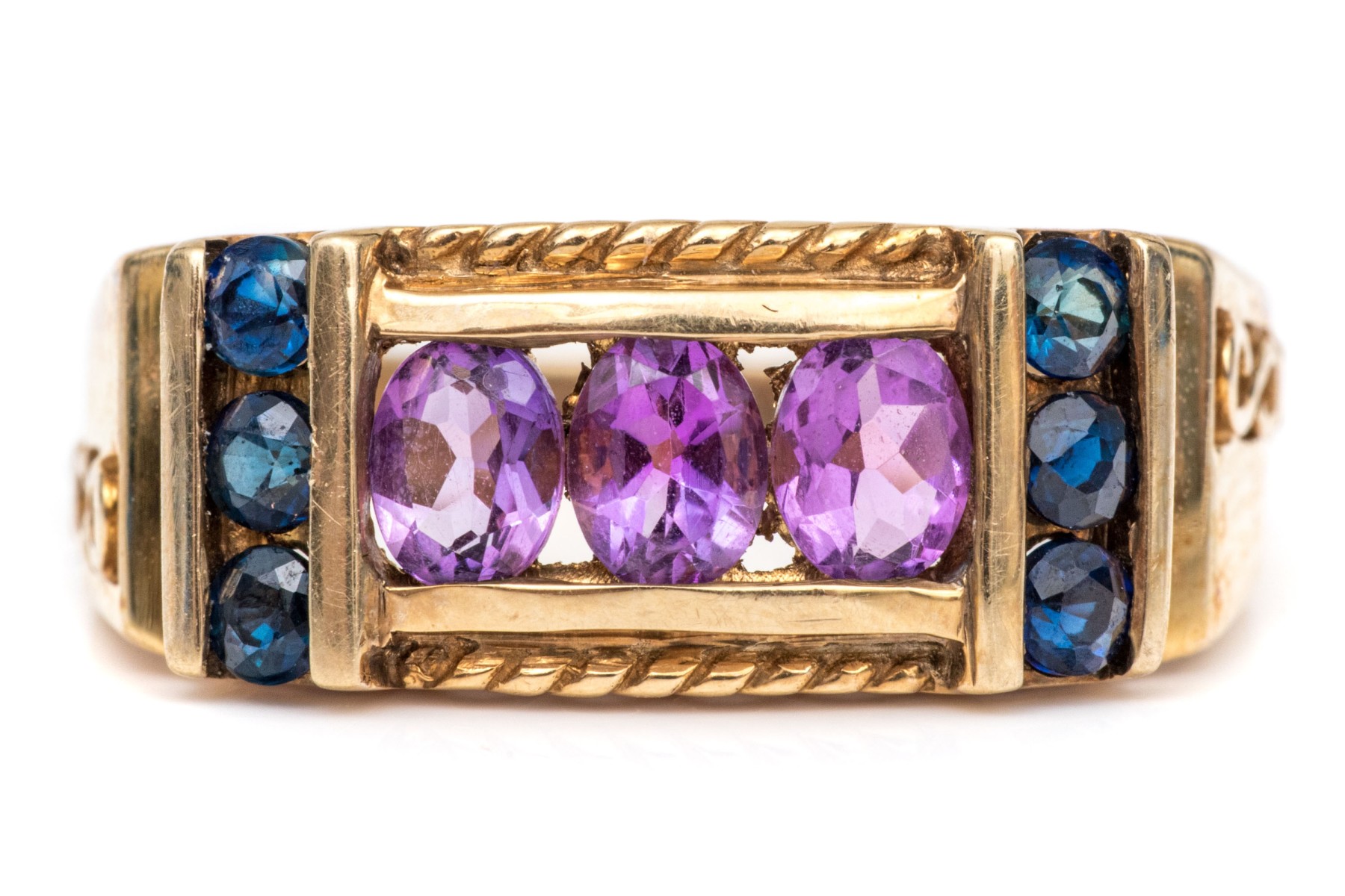 10k yellow gold unique amethyst and sapphire set retro style ring, app. 0.42 TCW in sapphires, size 5.75