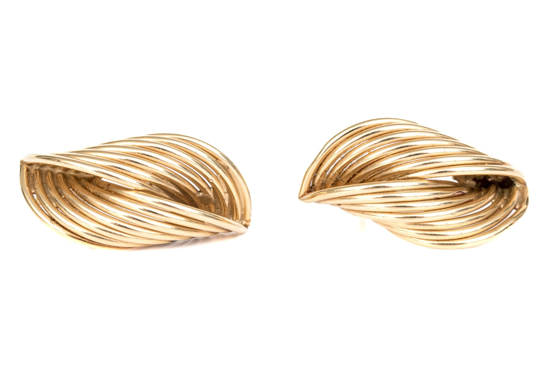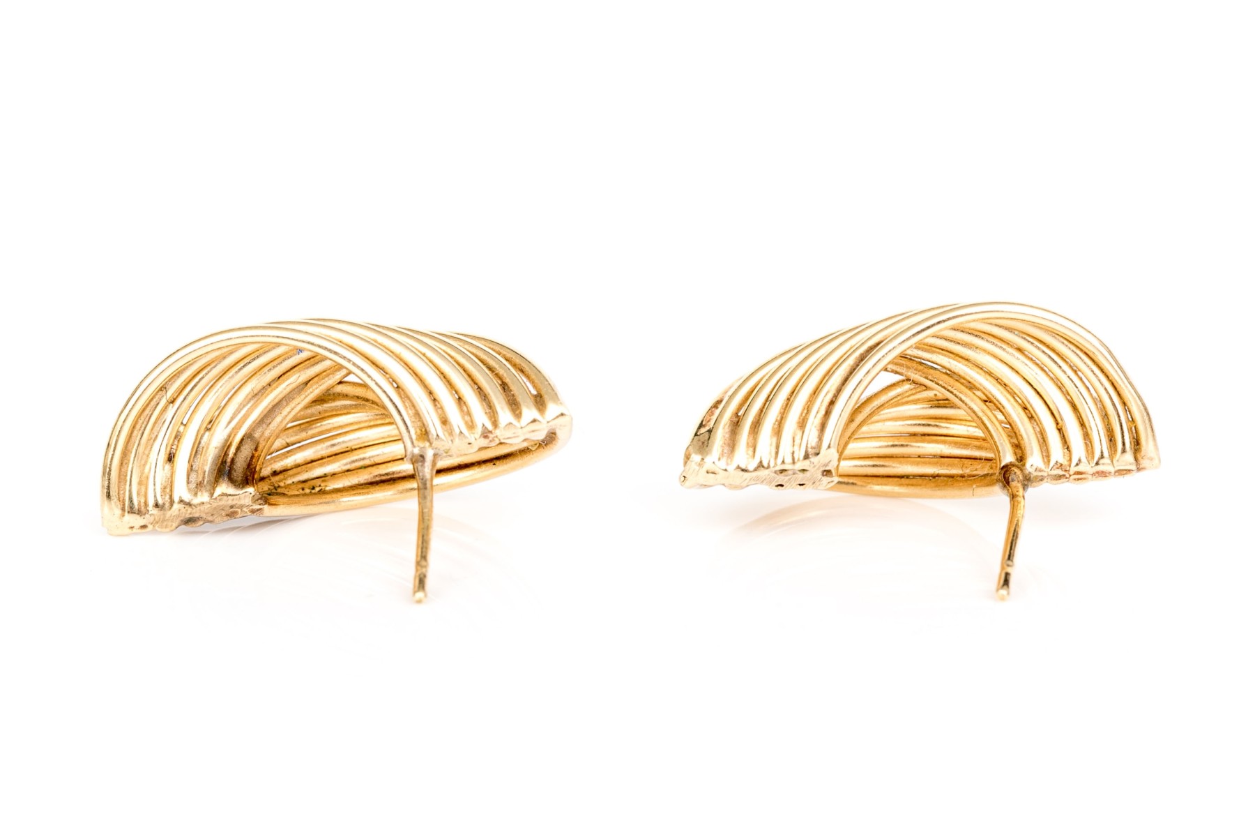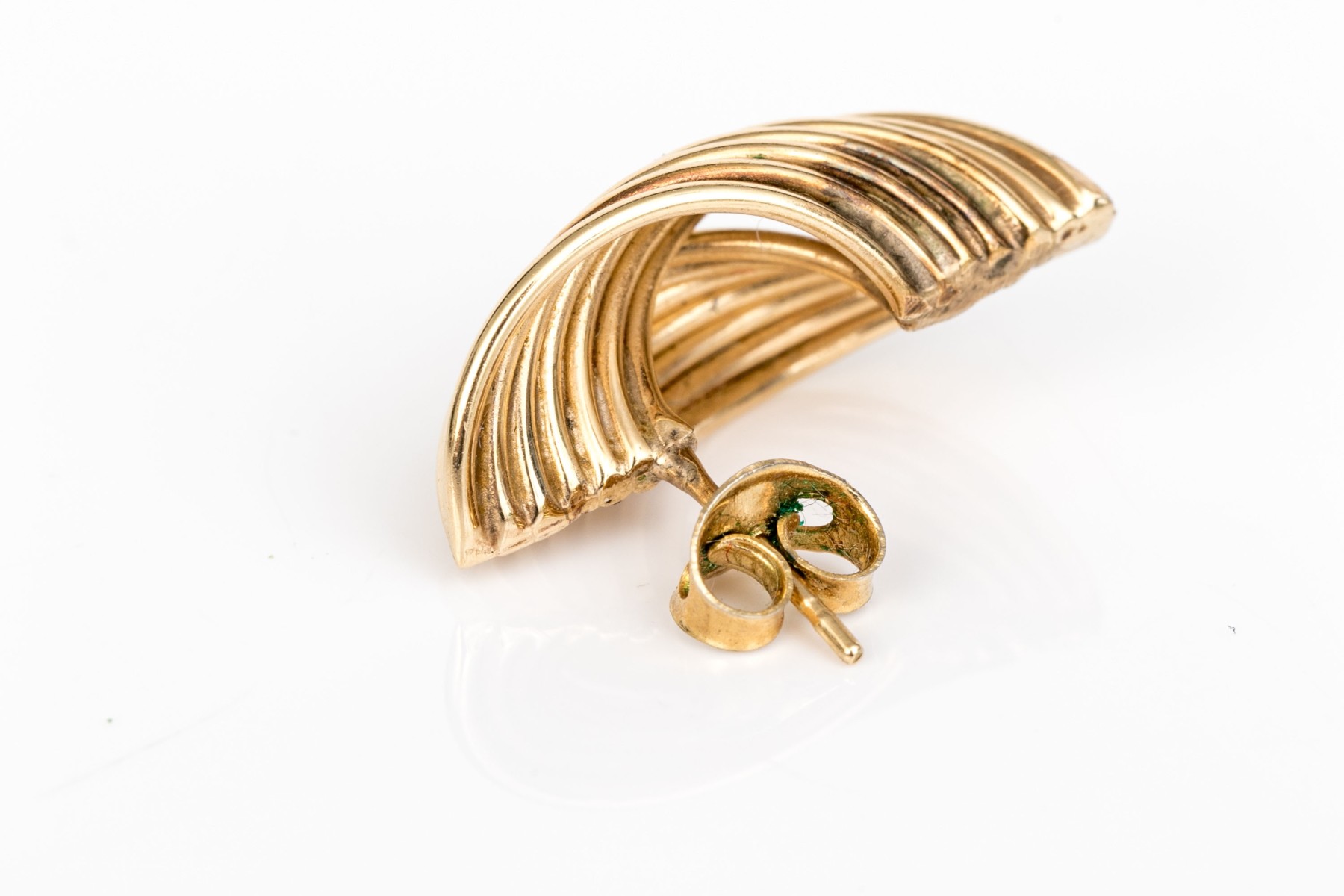 10k yellow gold vintage ribbed folded earrings. The earrings are finished with posts and stainless steel clutch style backs