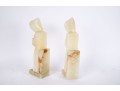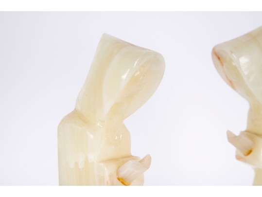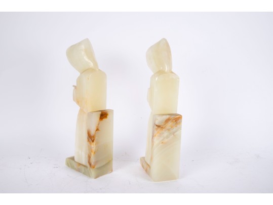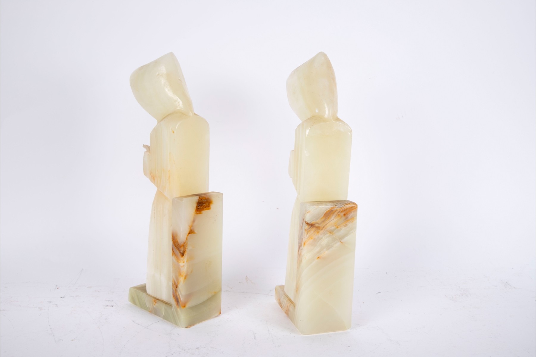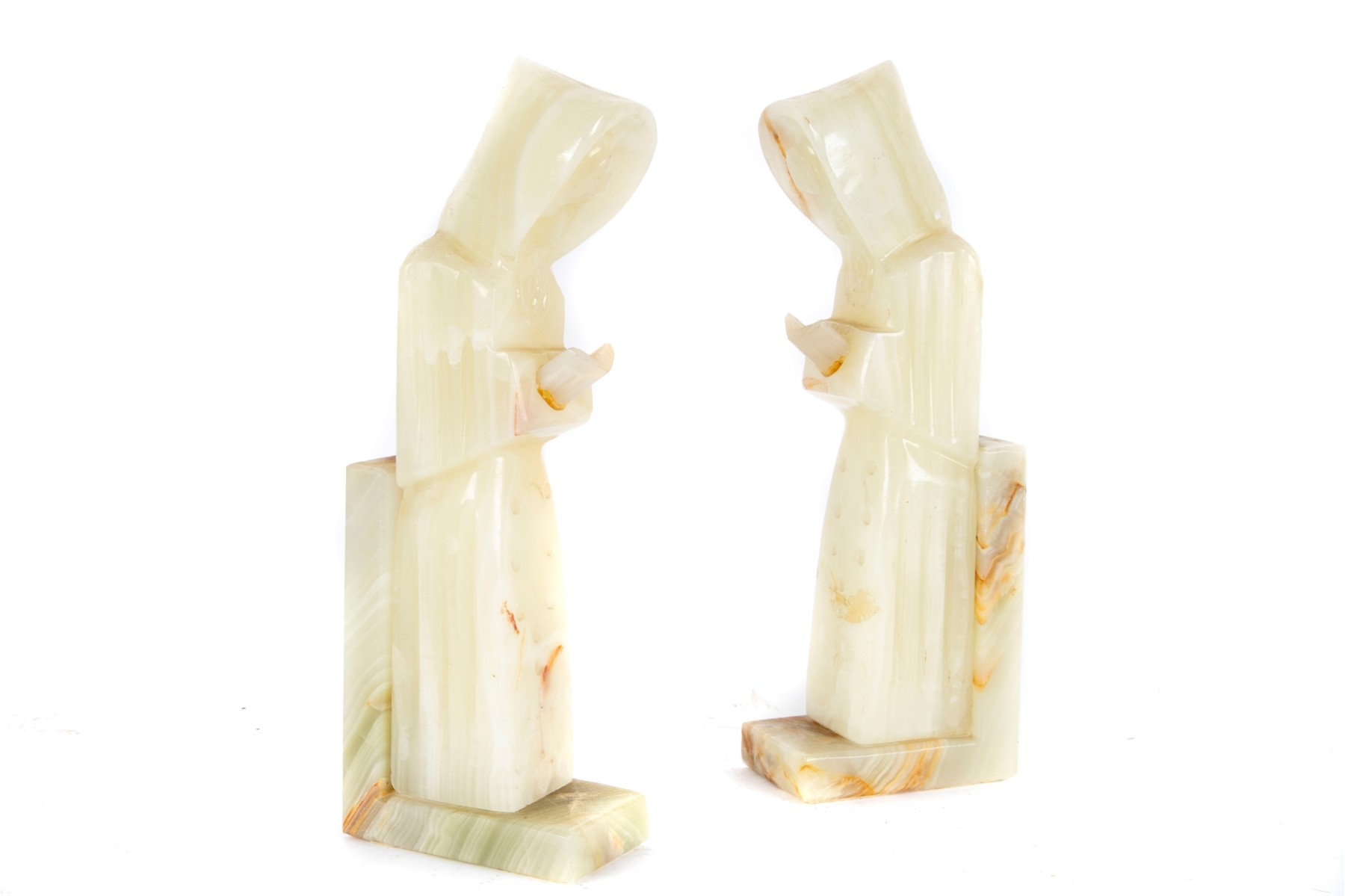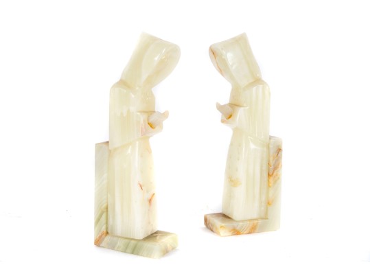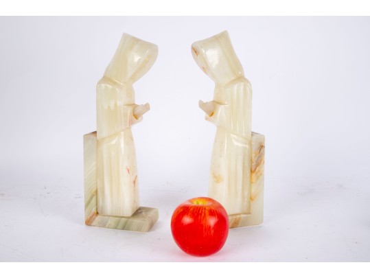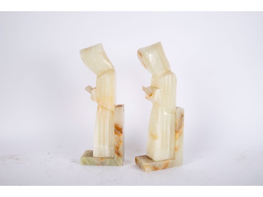A pair of 11.5" onyx stone cloaked monk bookends, featuring finely carved figures with flowing robes. The natural veining of the onyx enhances their sculptural forms.