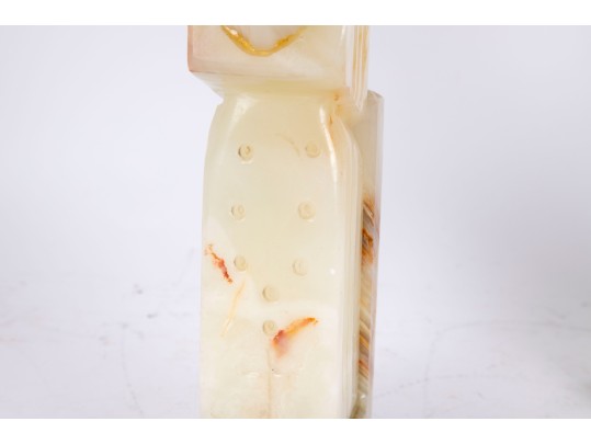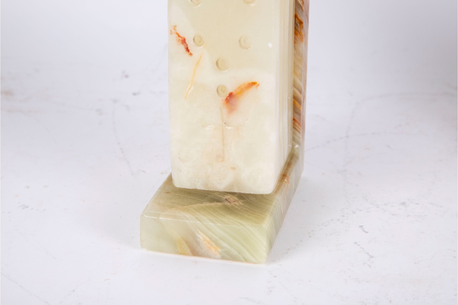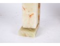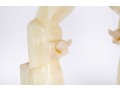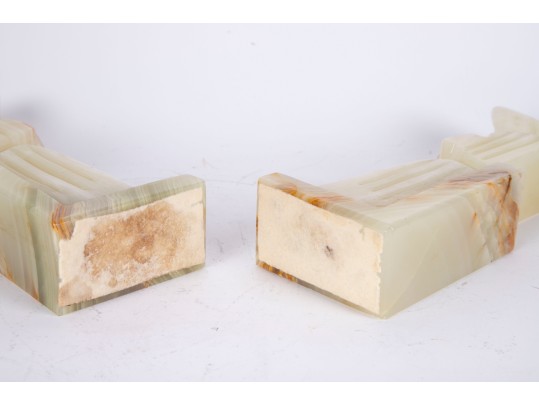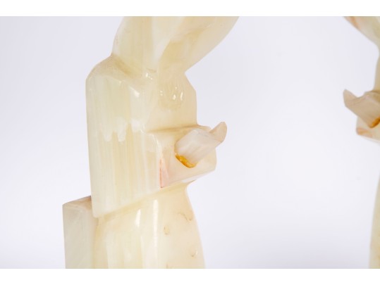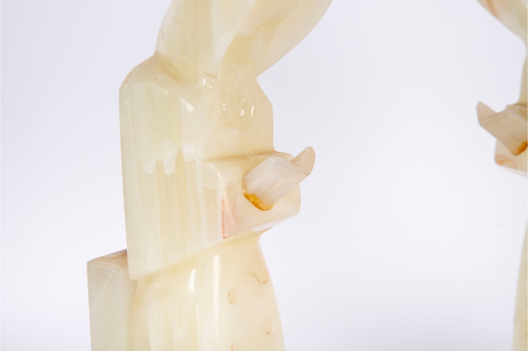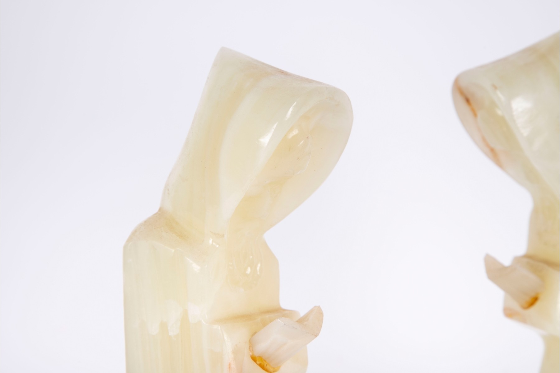 A pair of 11.5" onyx stone cloaked monk bookends, featuring finely carved figures with flowing robes. The natural veining of the onyx enhances their sculptural forms.