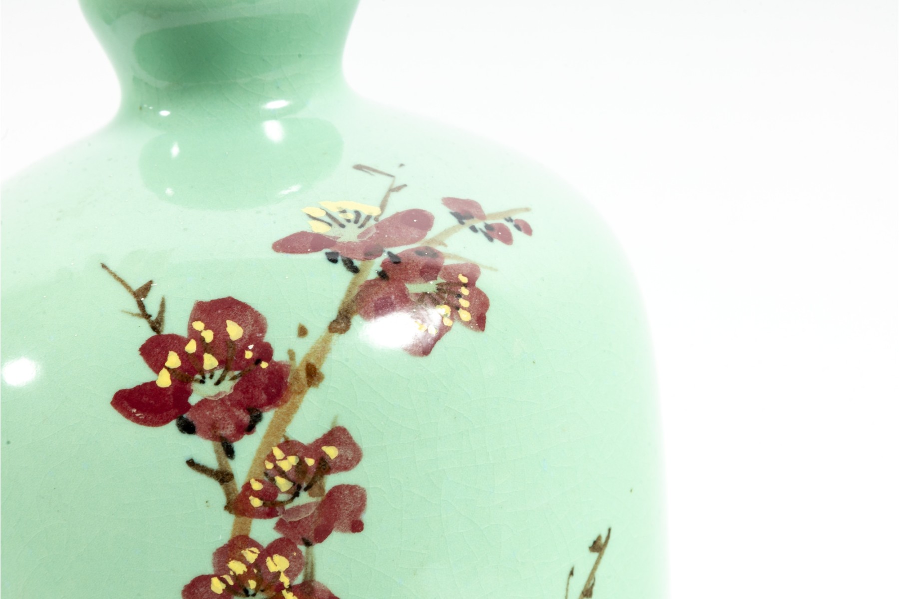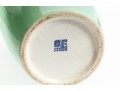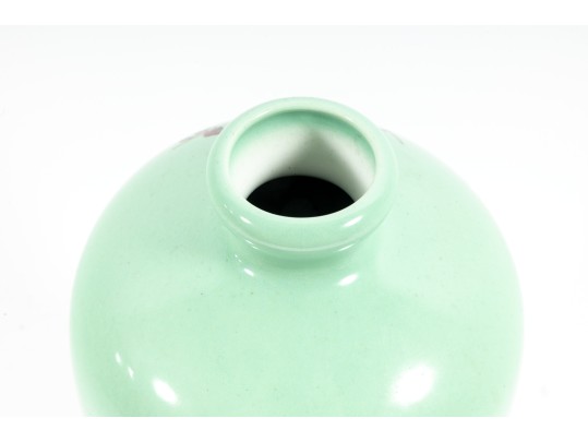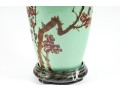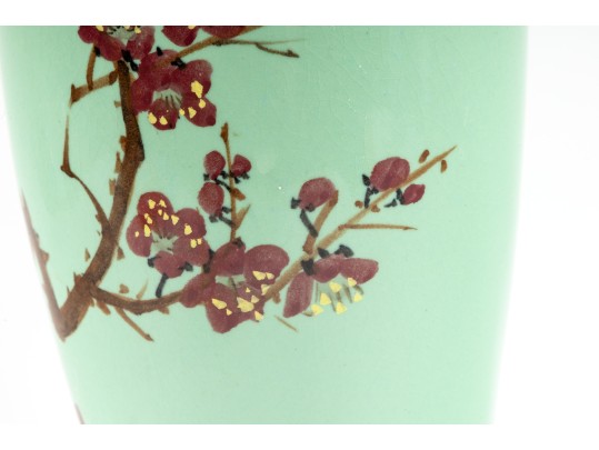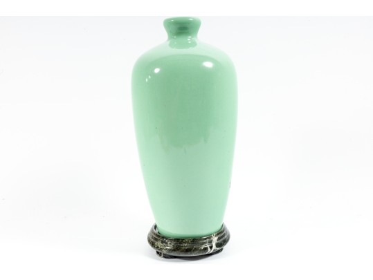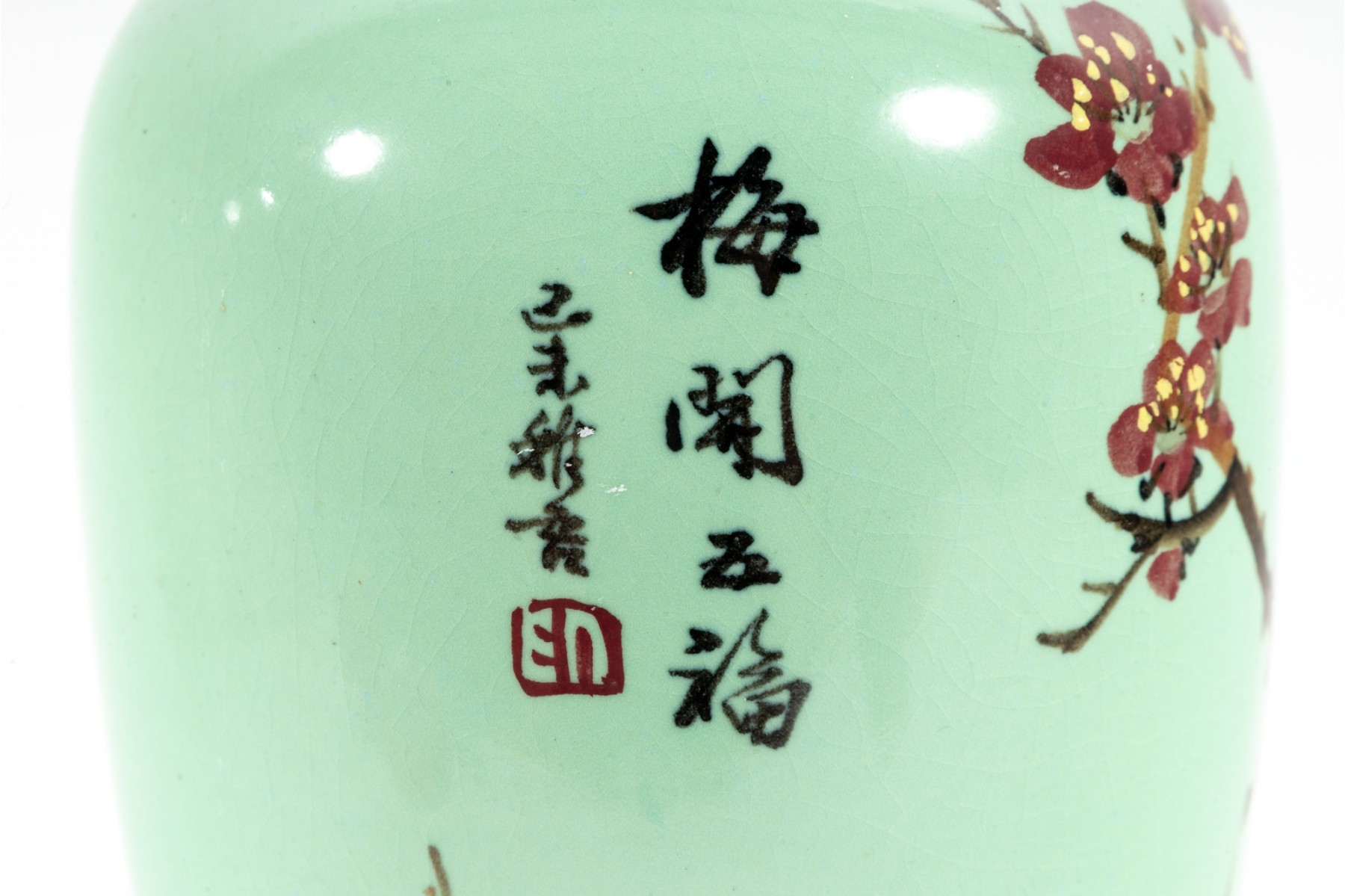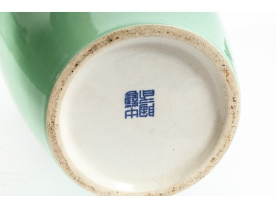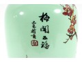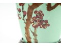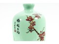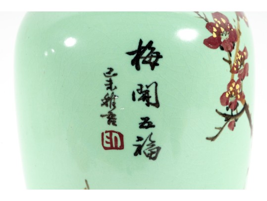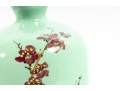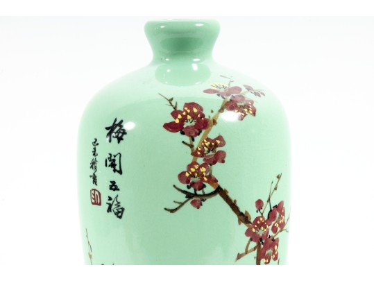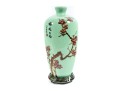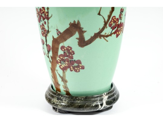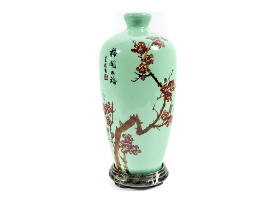 A 12" apple green Chinese porcelain vase with a classic plum blossom motif. The glossy apple green glaze serves as a vibrant backdrop for white or pale pink plum blossoms, delicately painted alongside traditional Chinese characters. Footed marble base included.