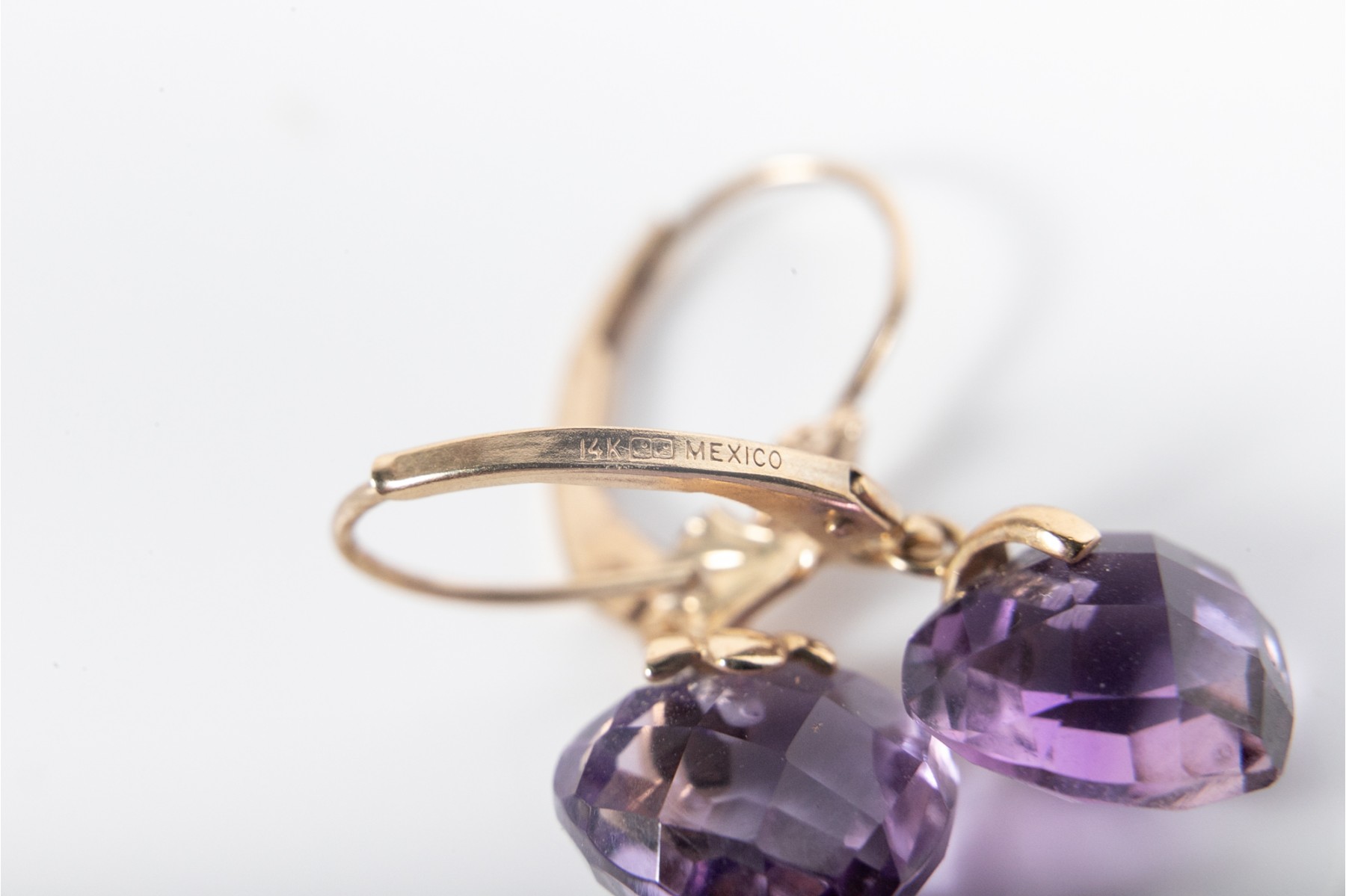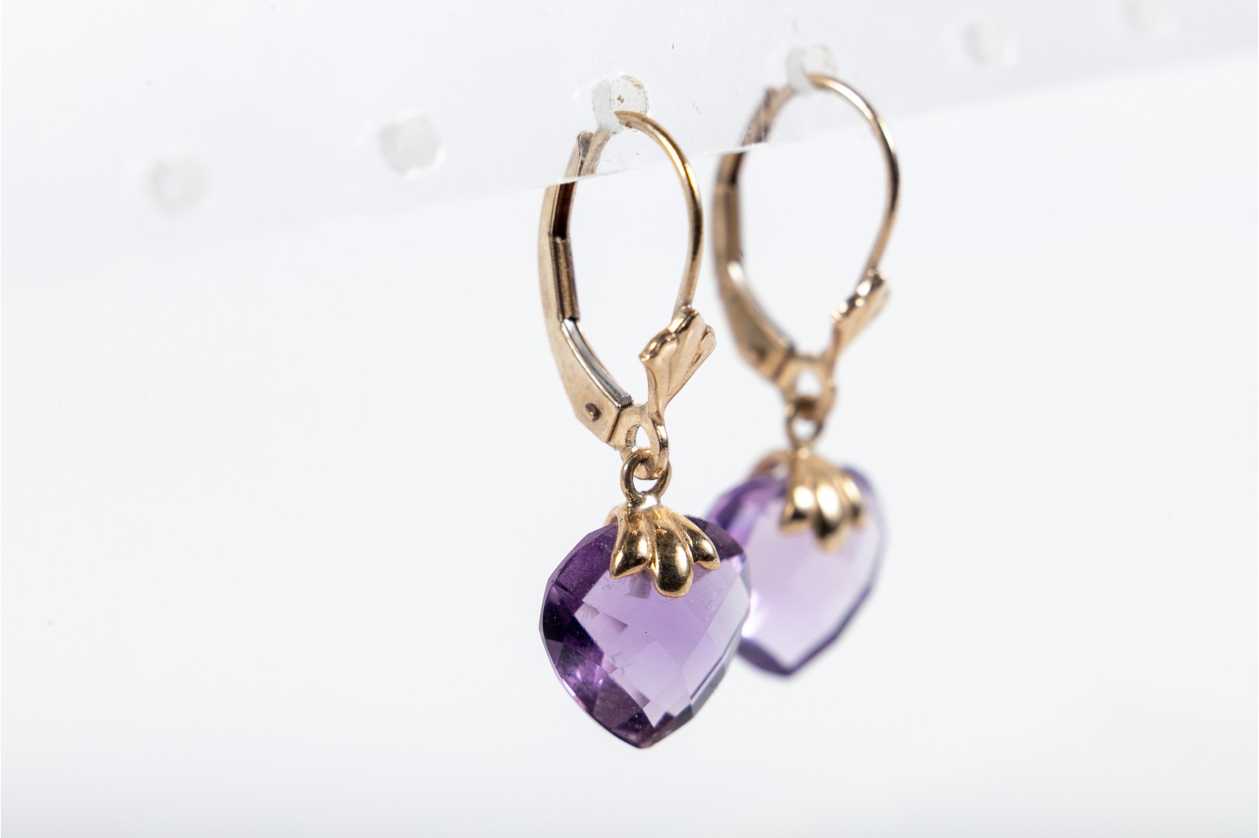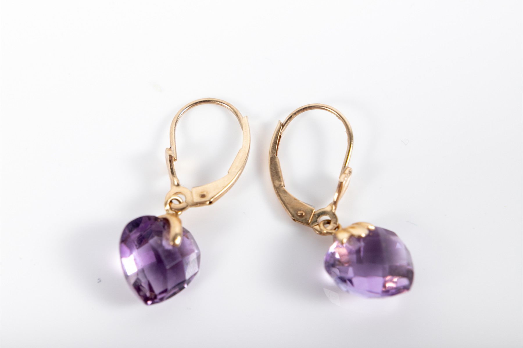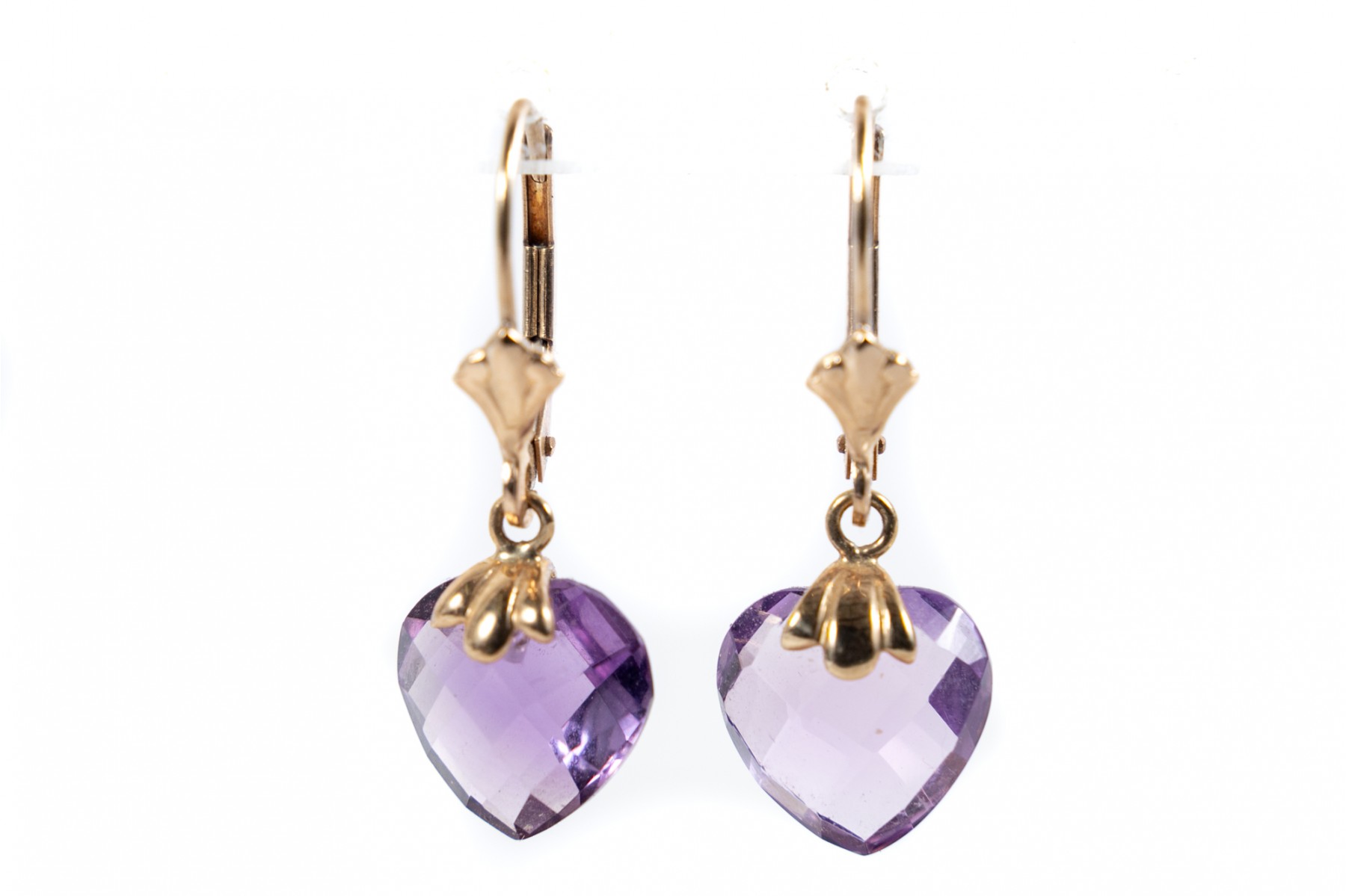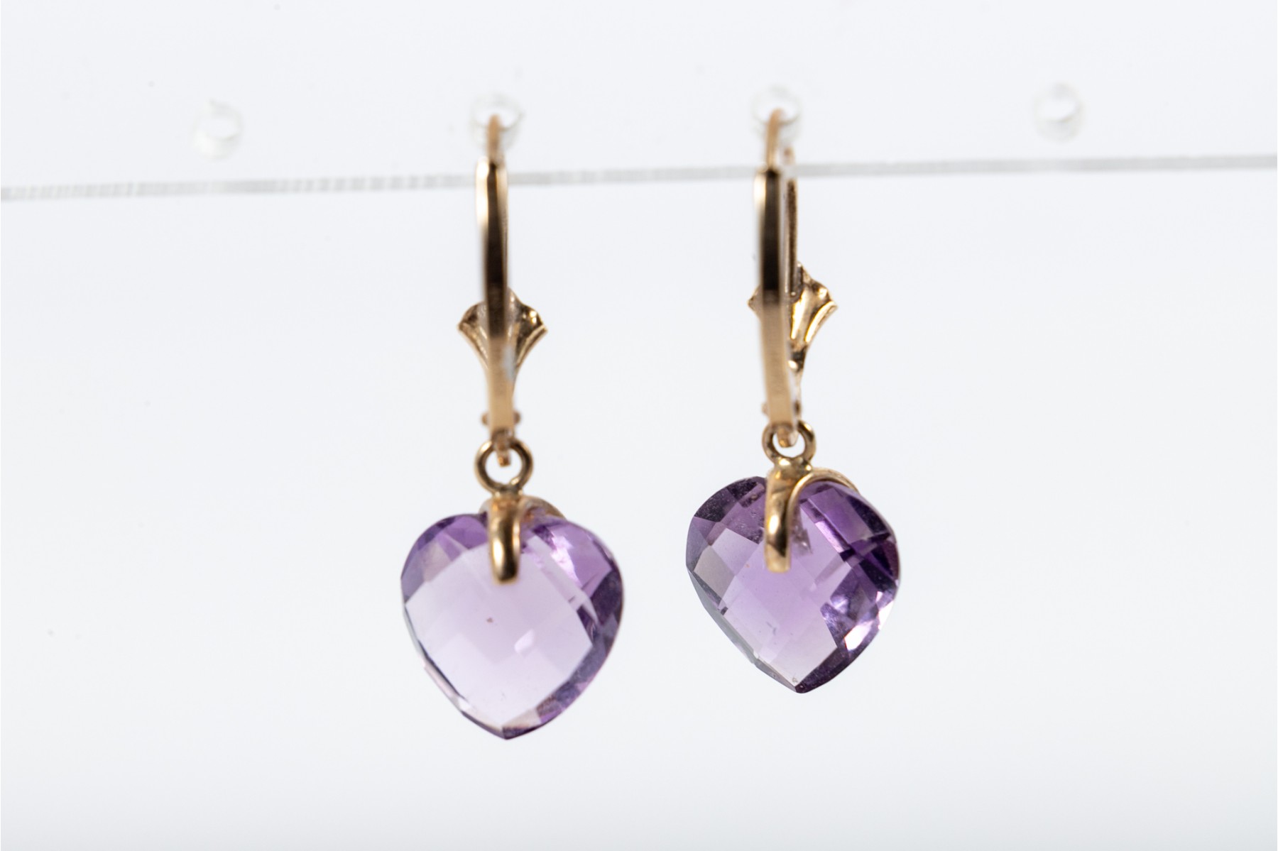 A lovely pair of yellow gold earrings displaying checkerboard-cut amethyst hearts on lever backs.