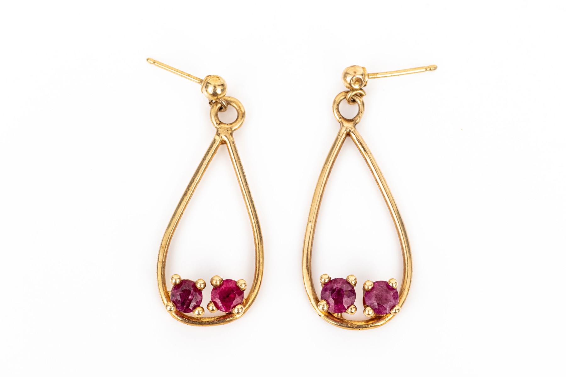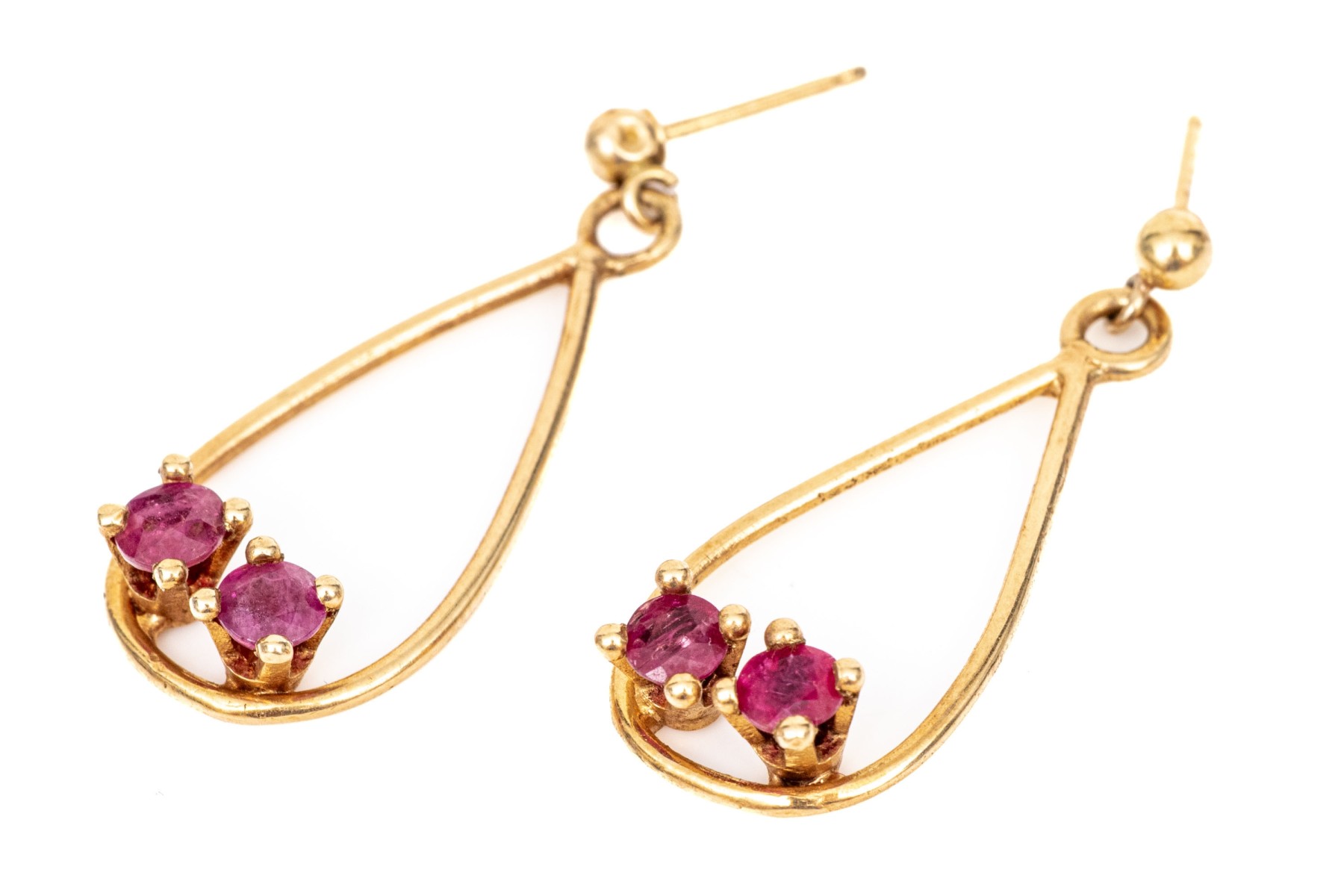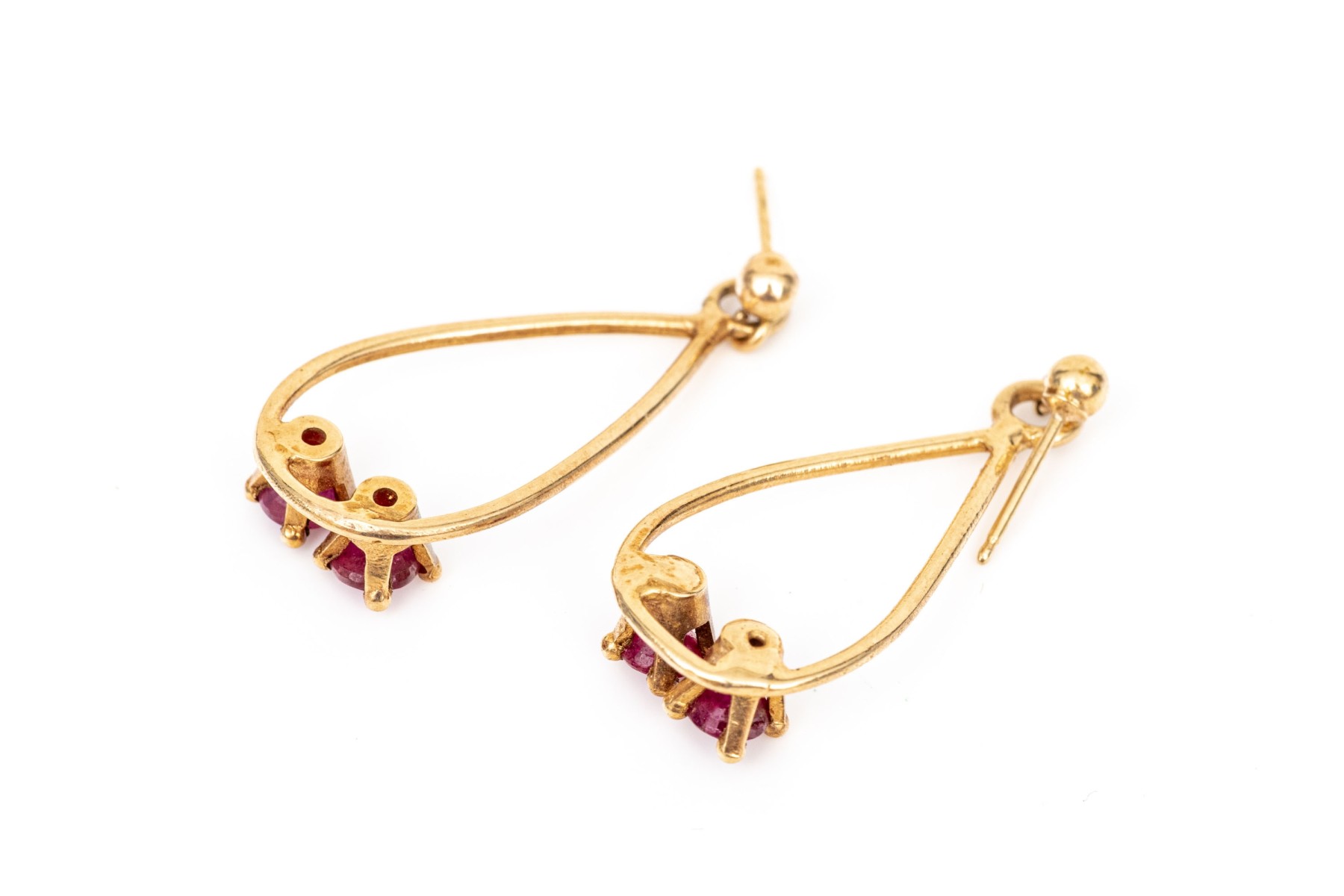 14k and 10k yellow gold ruby set drop pendant earrings, app. 1.20 TCW, finished with posts and missing clutches