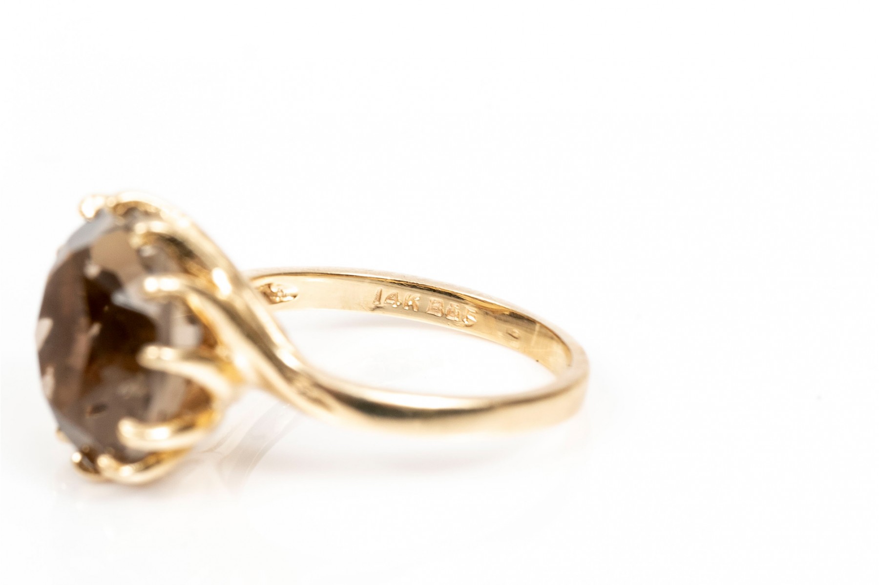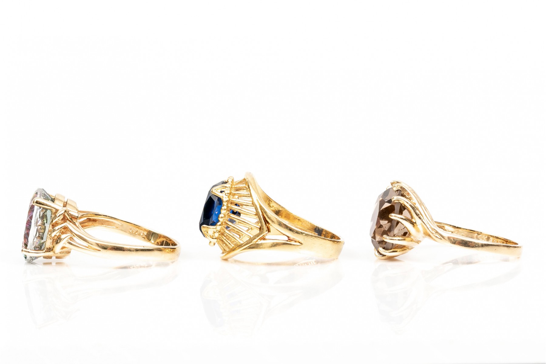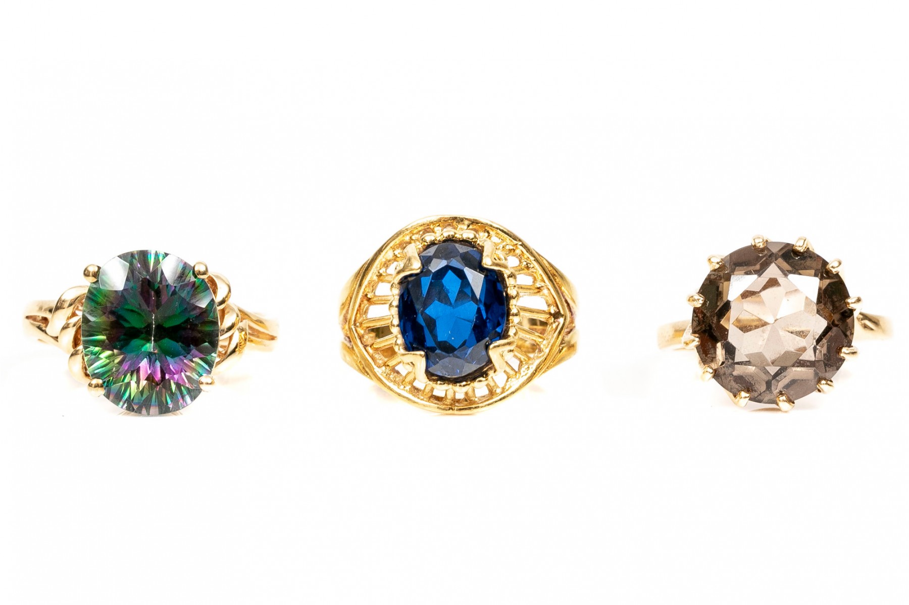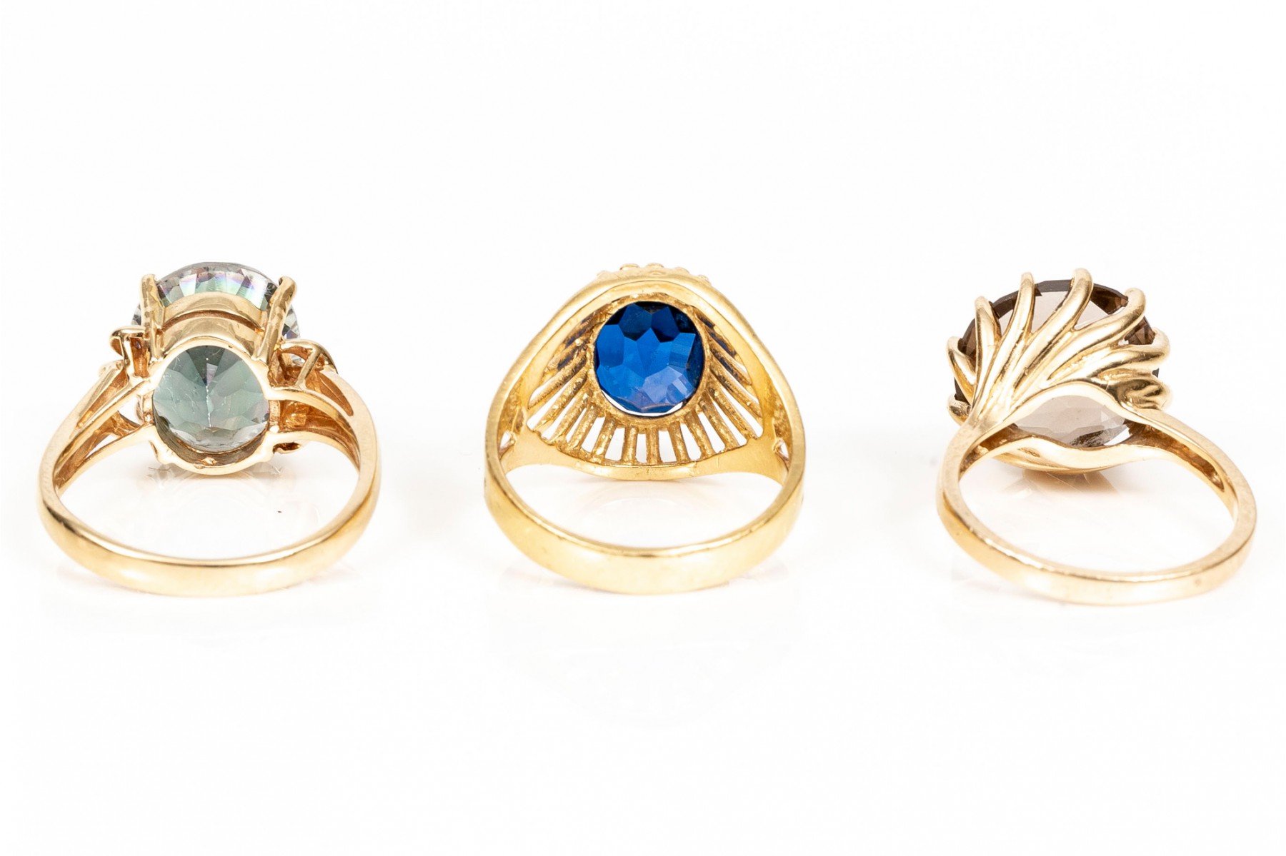 14K and 18K yellow gold rings. Two 14K rings one set with a round faceted smoky quartz stone, size 5, and the other with an oval cut mystic topaz stone, size 7. The third ring is 18K and set with an oval cut synthetic deep blue spinel stone, size 6.