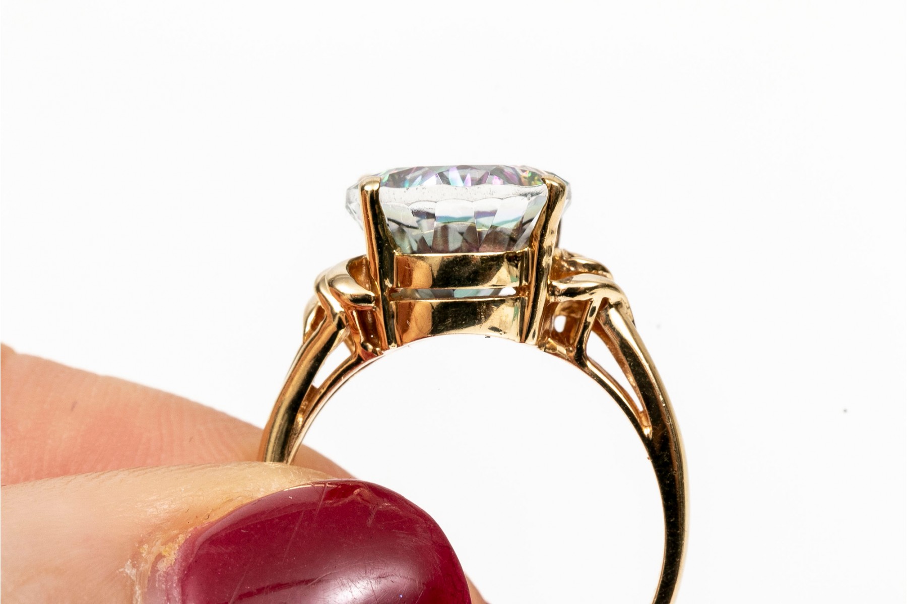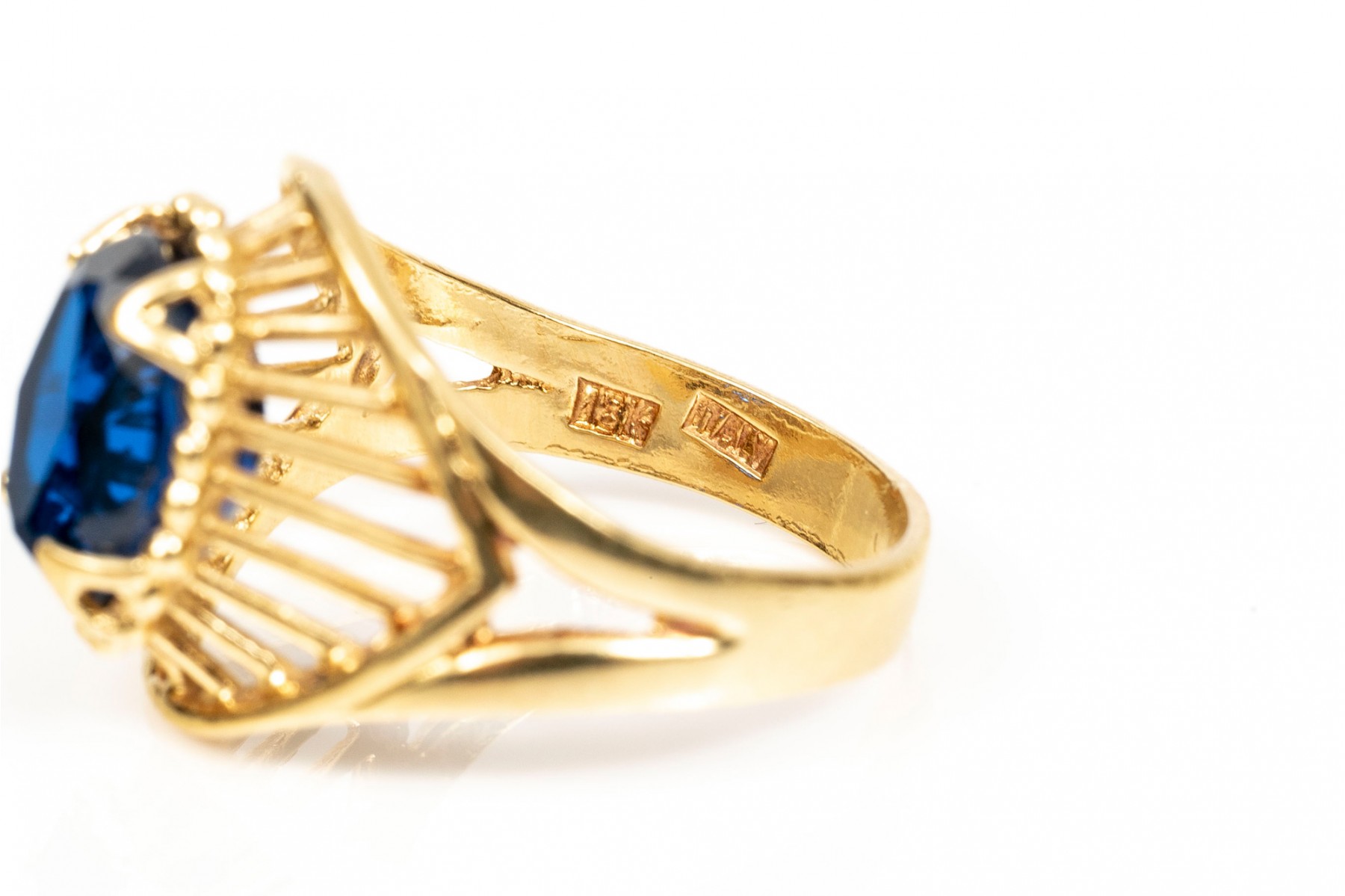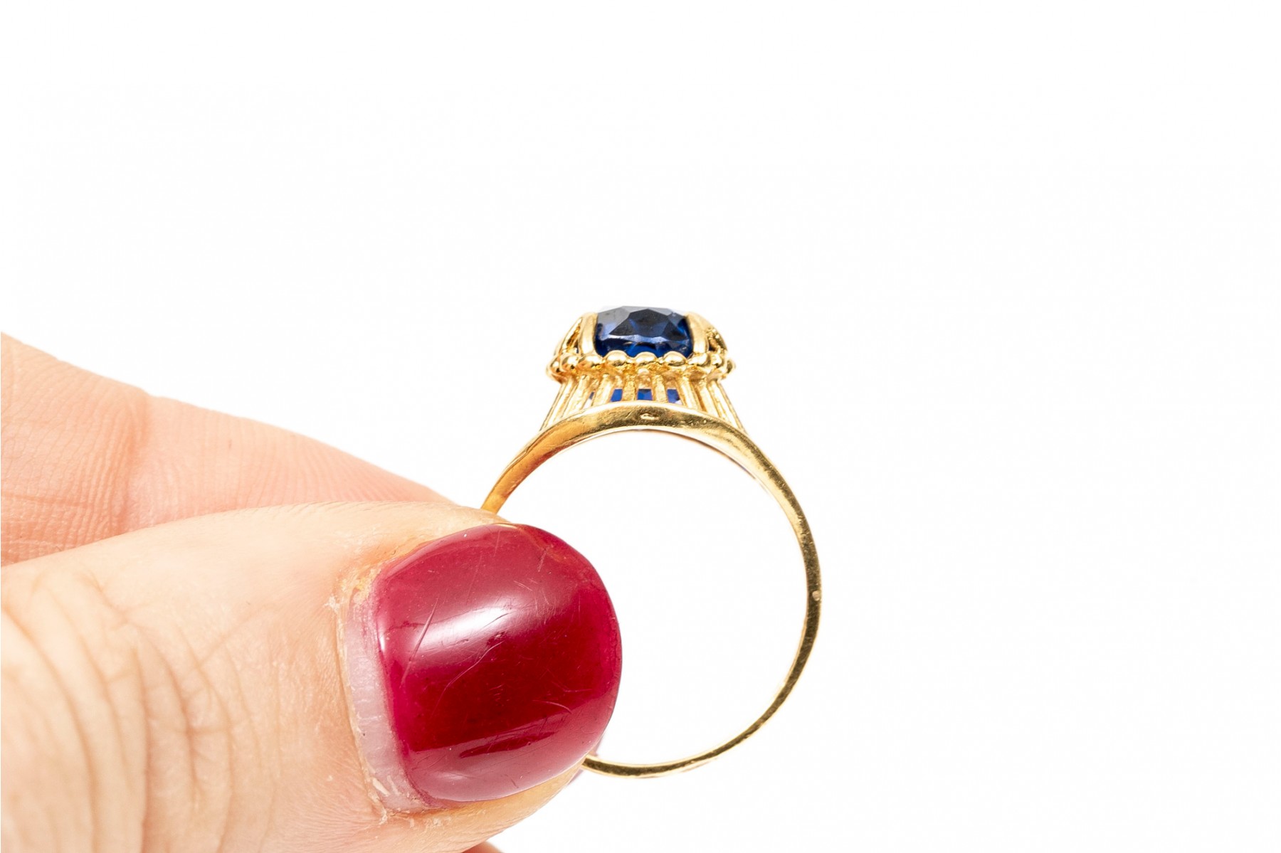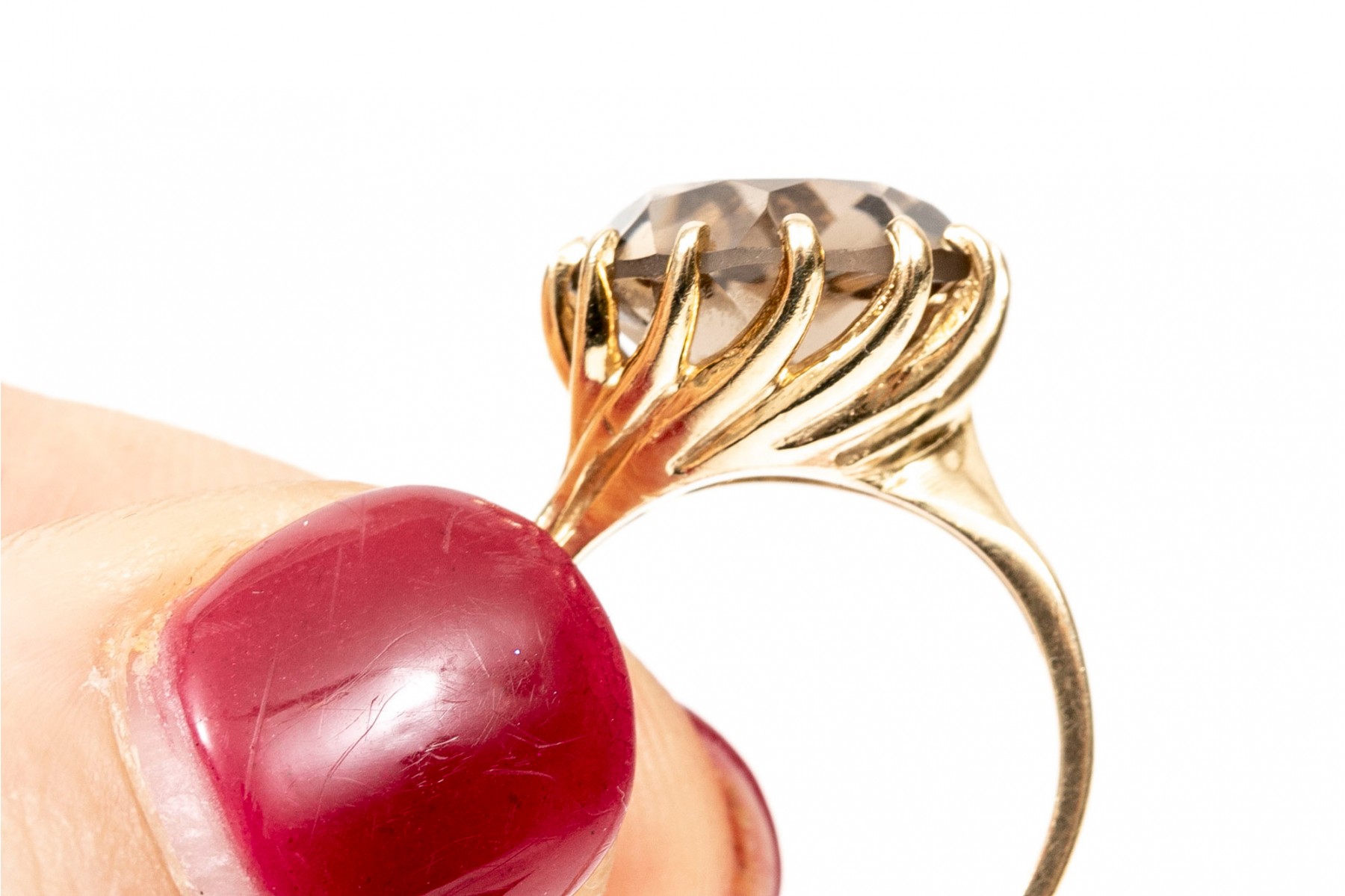 14K and 18K yellow gold rings. Two 14K rings one set with a round faceted smoky quartz stone, size 5, and the other with an oval cut mystic topaz stone, size 7. The third ring is 18K and set with an oval cut synthetic deep blue spinel stone, size 6.