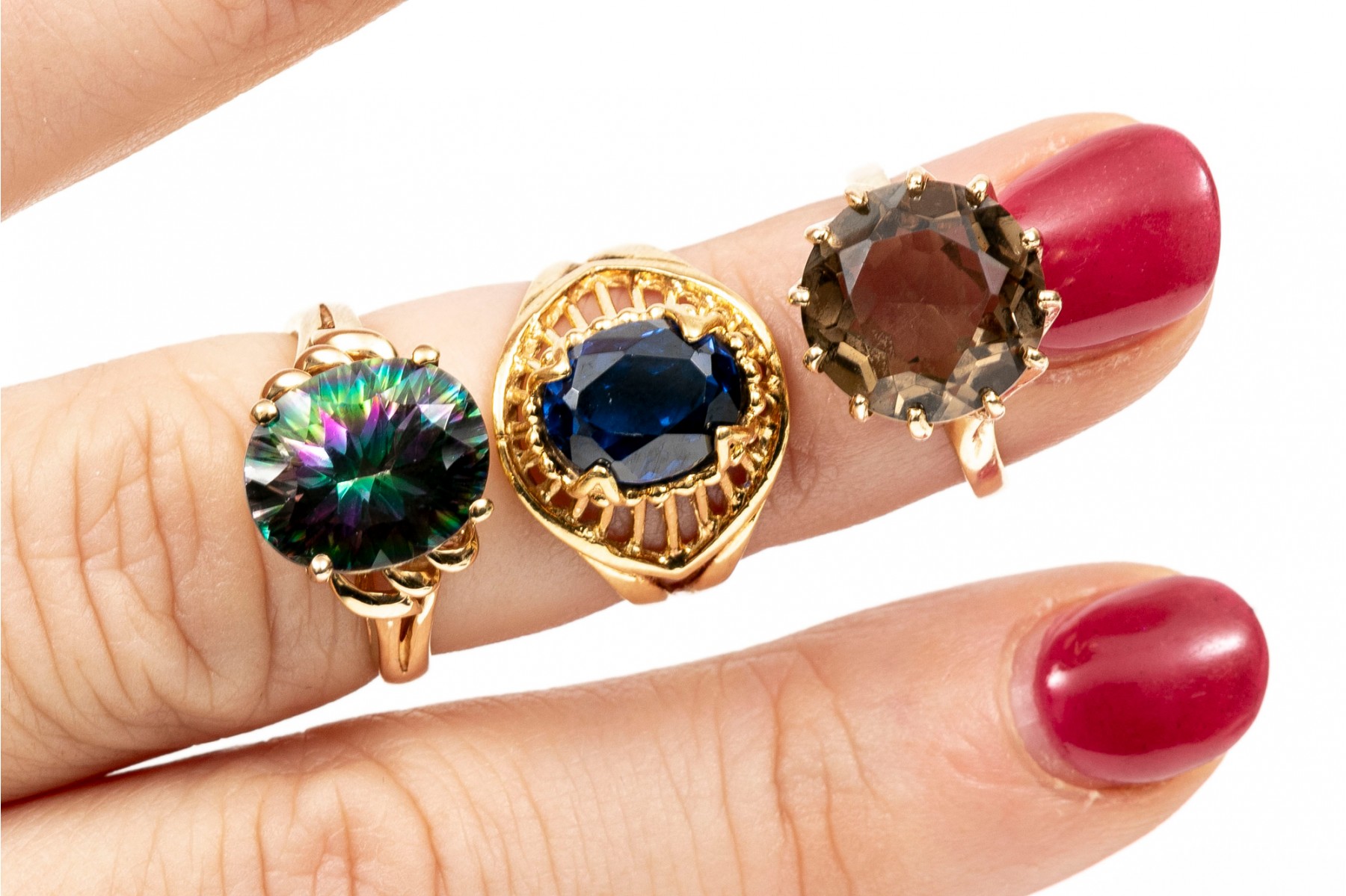 Dimensions: 9/16" Across Top-Synthetic Blue Spinel Ring, 1/2" Across Top-Mystic Topaz Ring, 1/2" Across Top-Smoky Quartz Ring