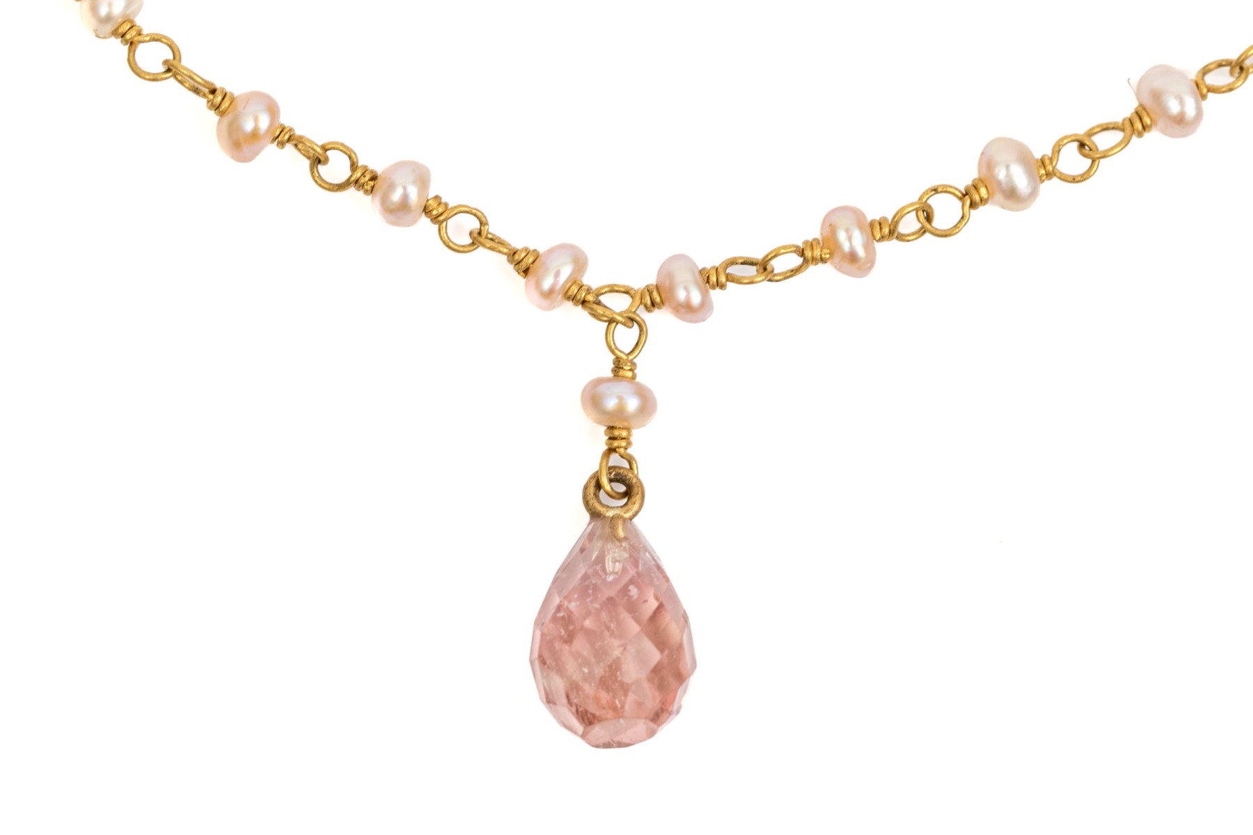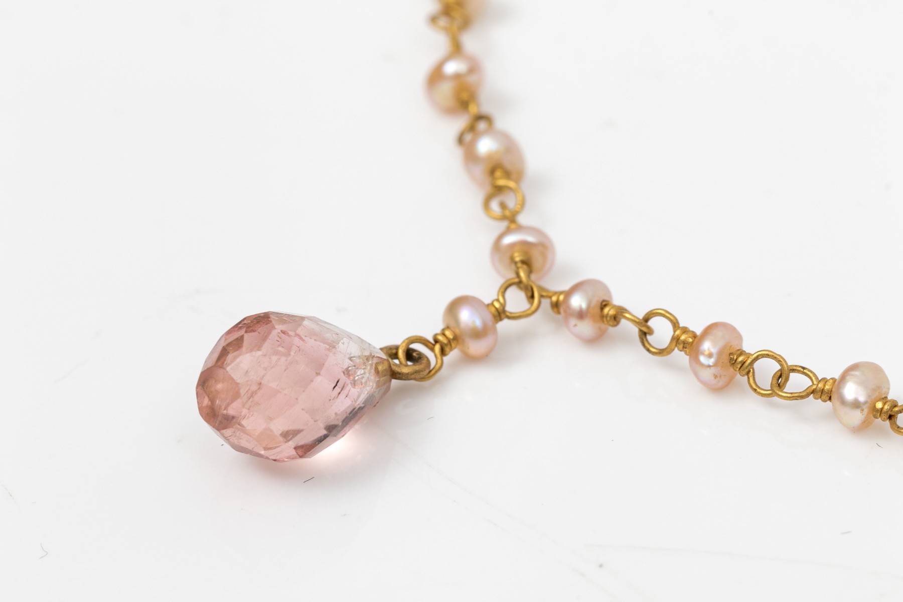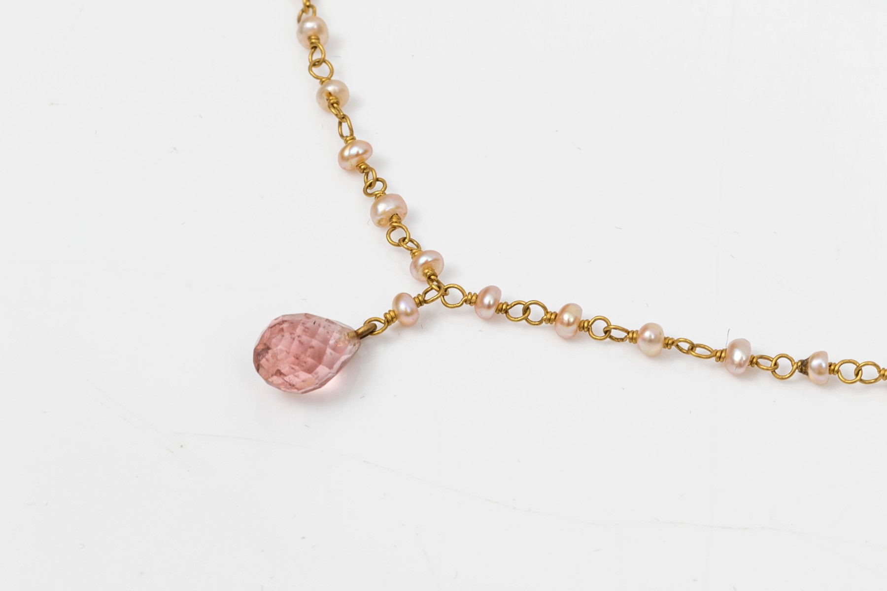 14k and 22k yellow gold beautiful tourmaline briolette necklace with cultured freshwater pearls, finished with an ez lock clasp