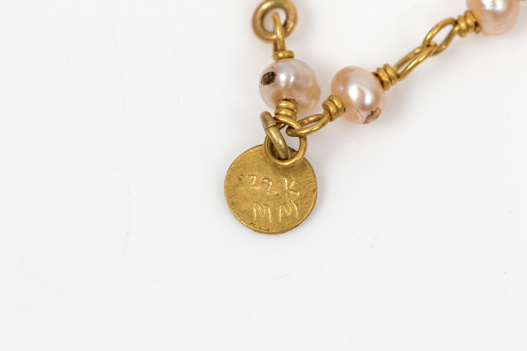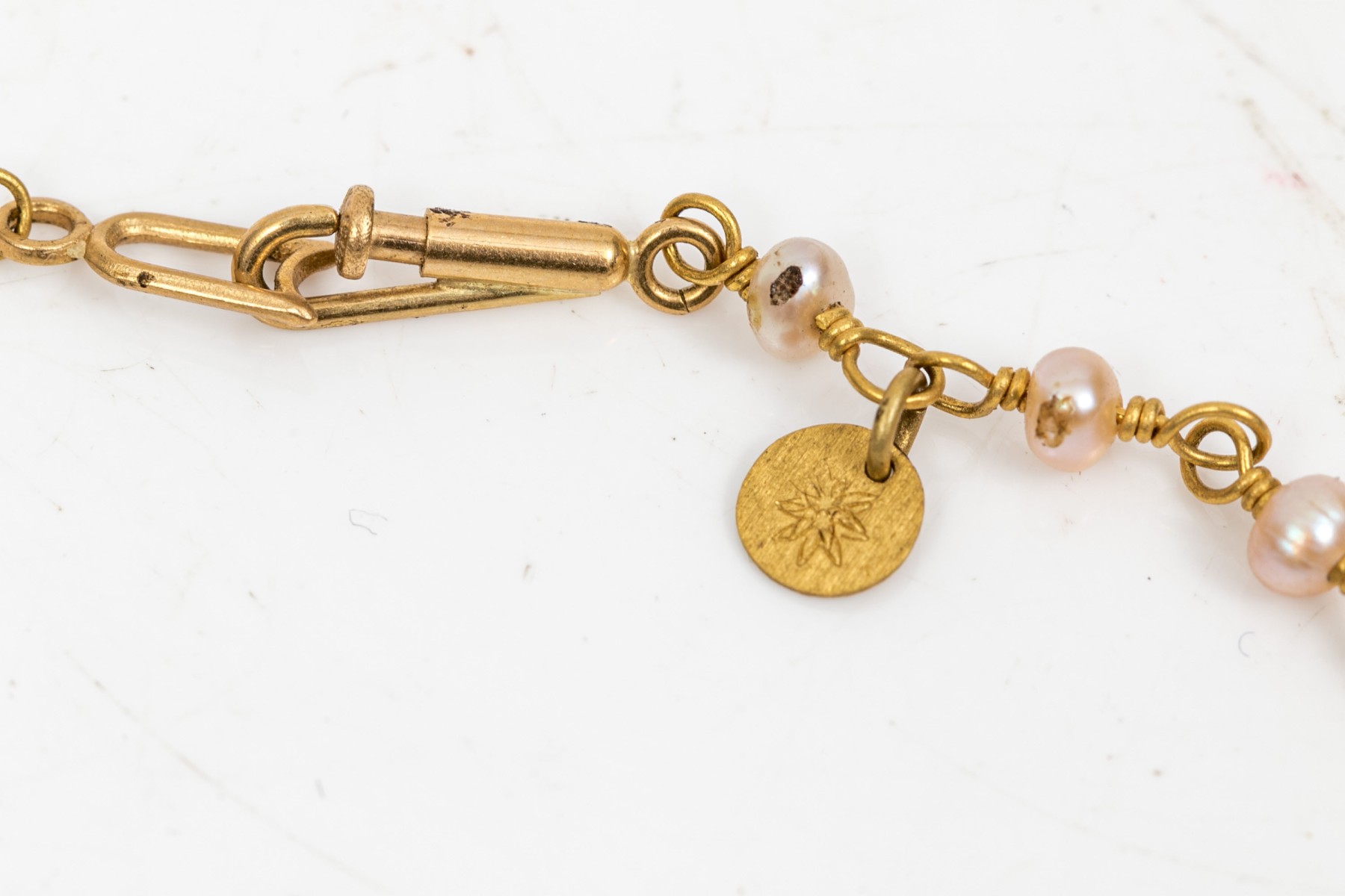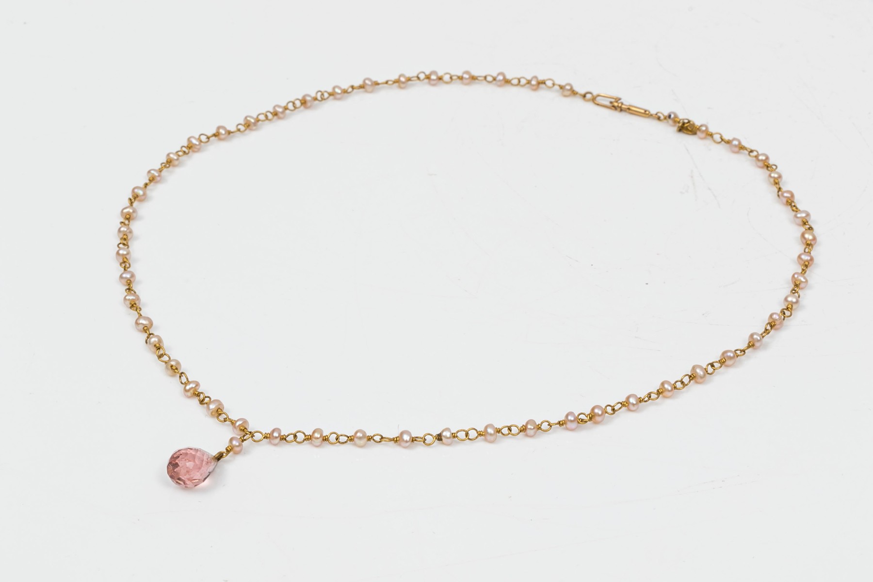 14k and 22k yellow gold beautiful tourmaline briolette necklace with cultured freshwater pearls, finished with an ez lock clasp