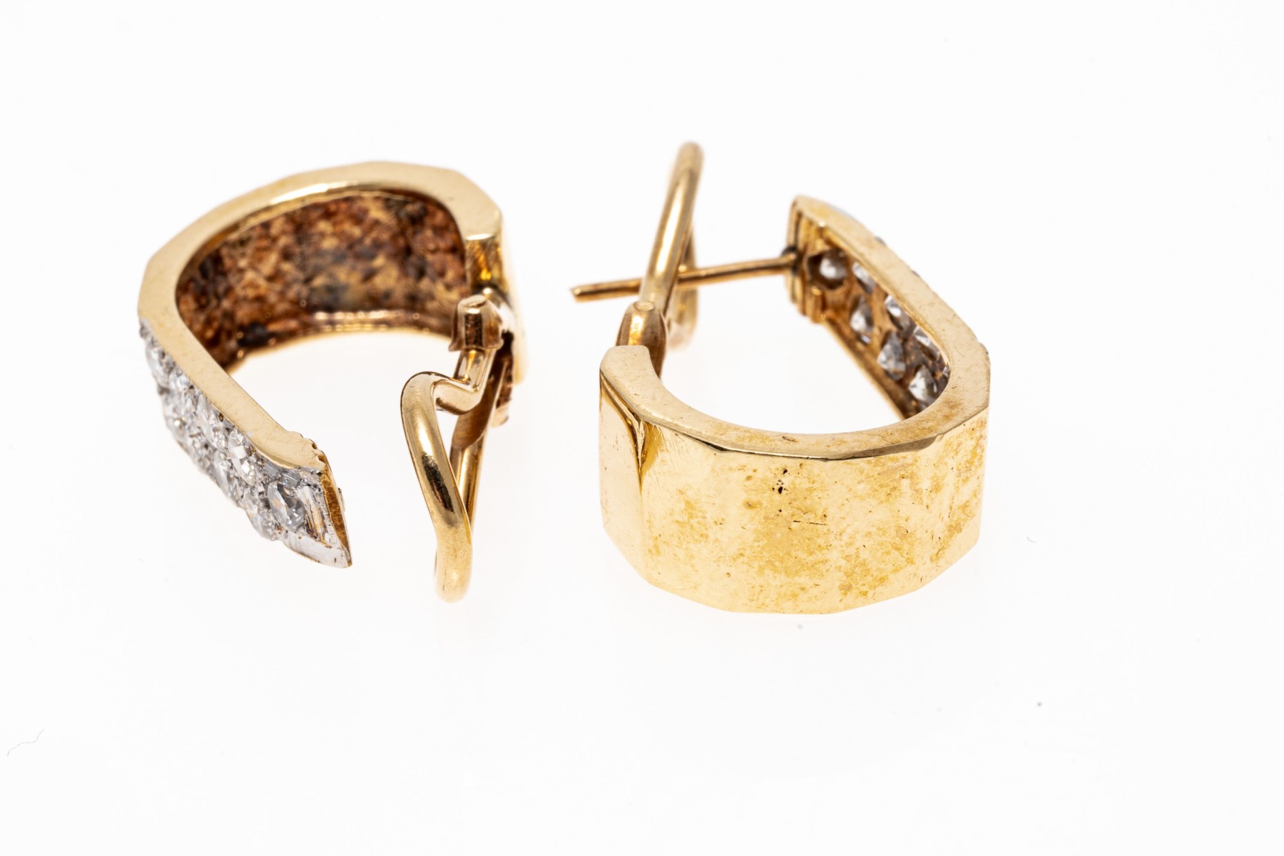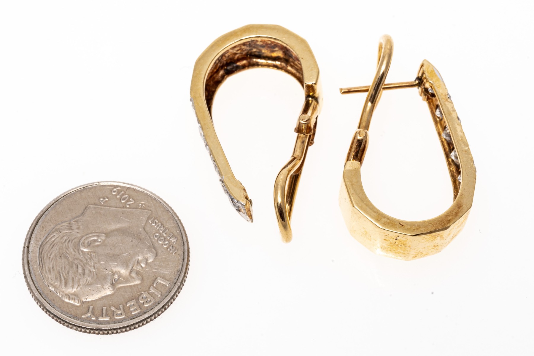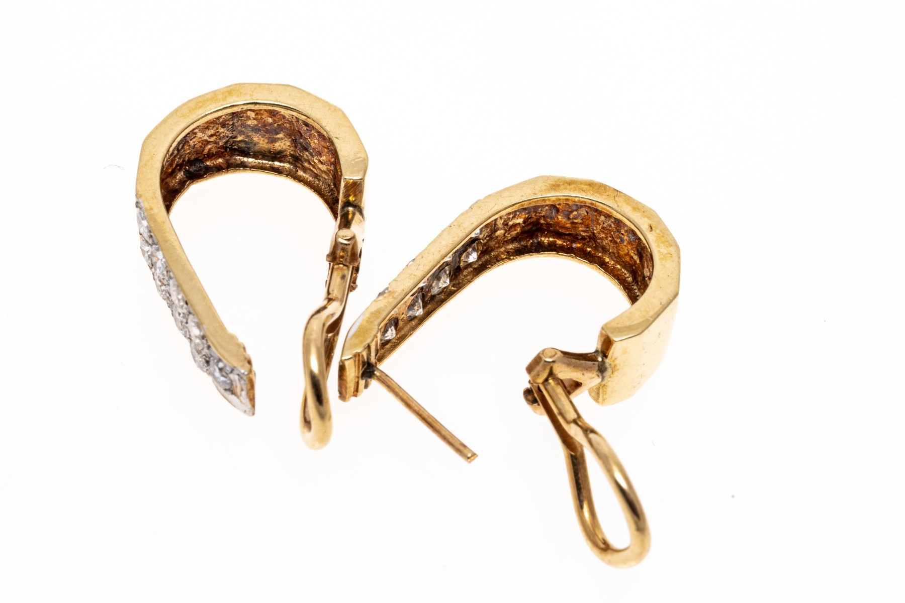 Dazzling pair of 14K yellow gold elongated hoop earrings pave set with round brilliant cut diamonds, approximately 0.92 TCW. Post and omega backings.