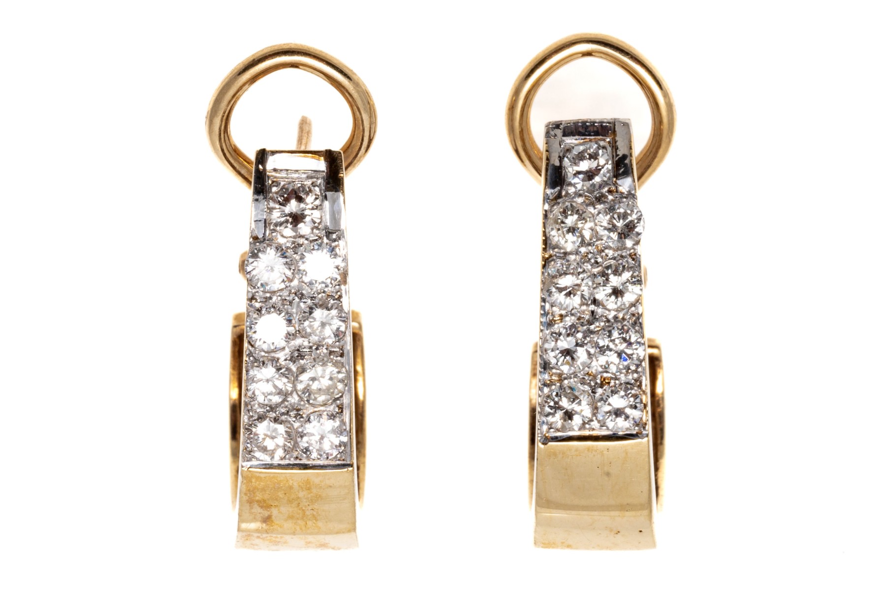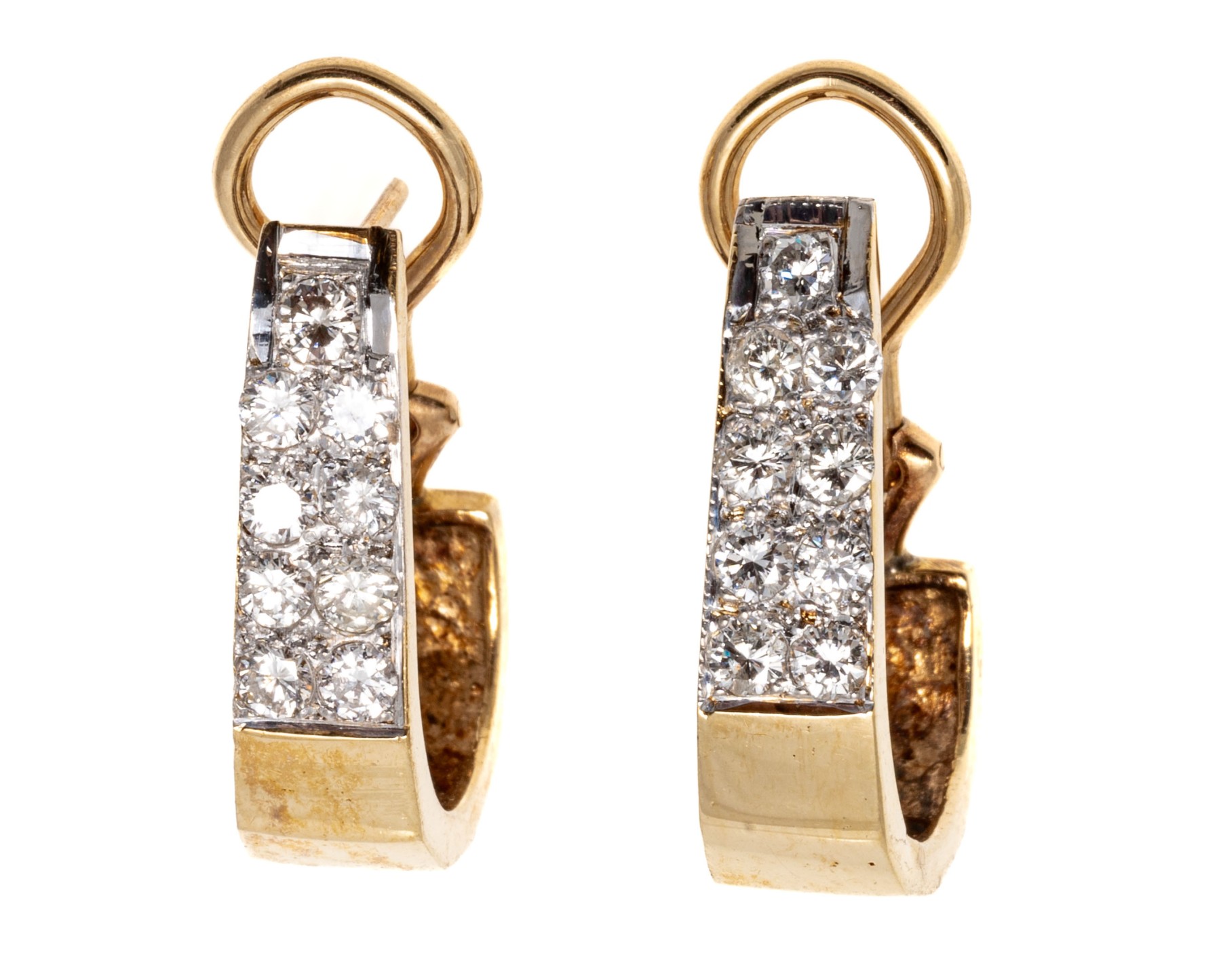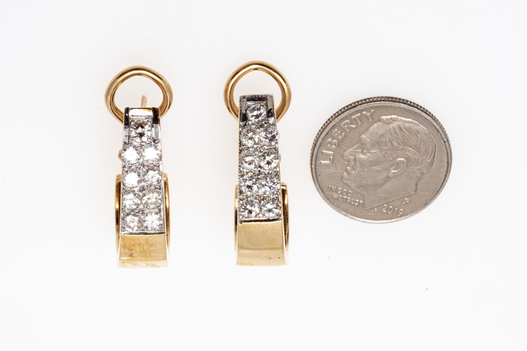 Dazzling pair of 14K yellow gold elongated hoop earrings pave set with round brilliant cut diamonds, approximately 0.92 TCW. Post and omega backings.