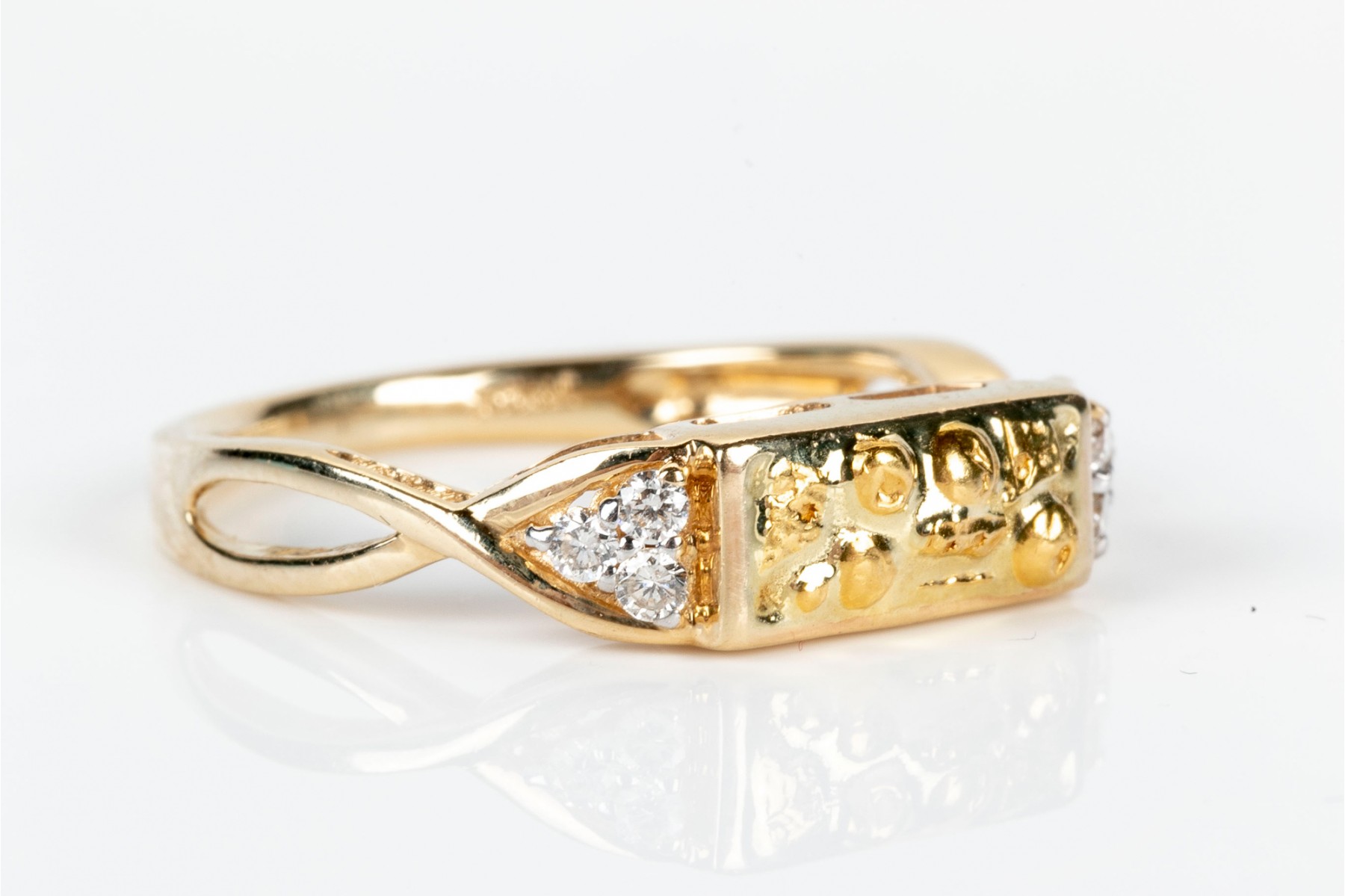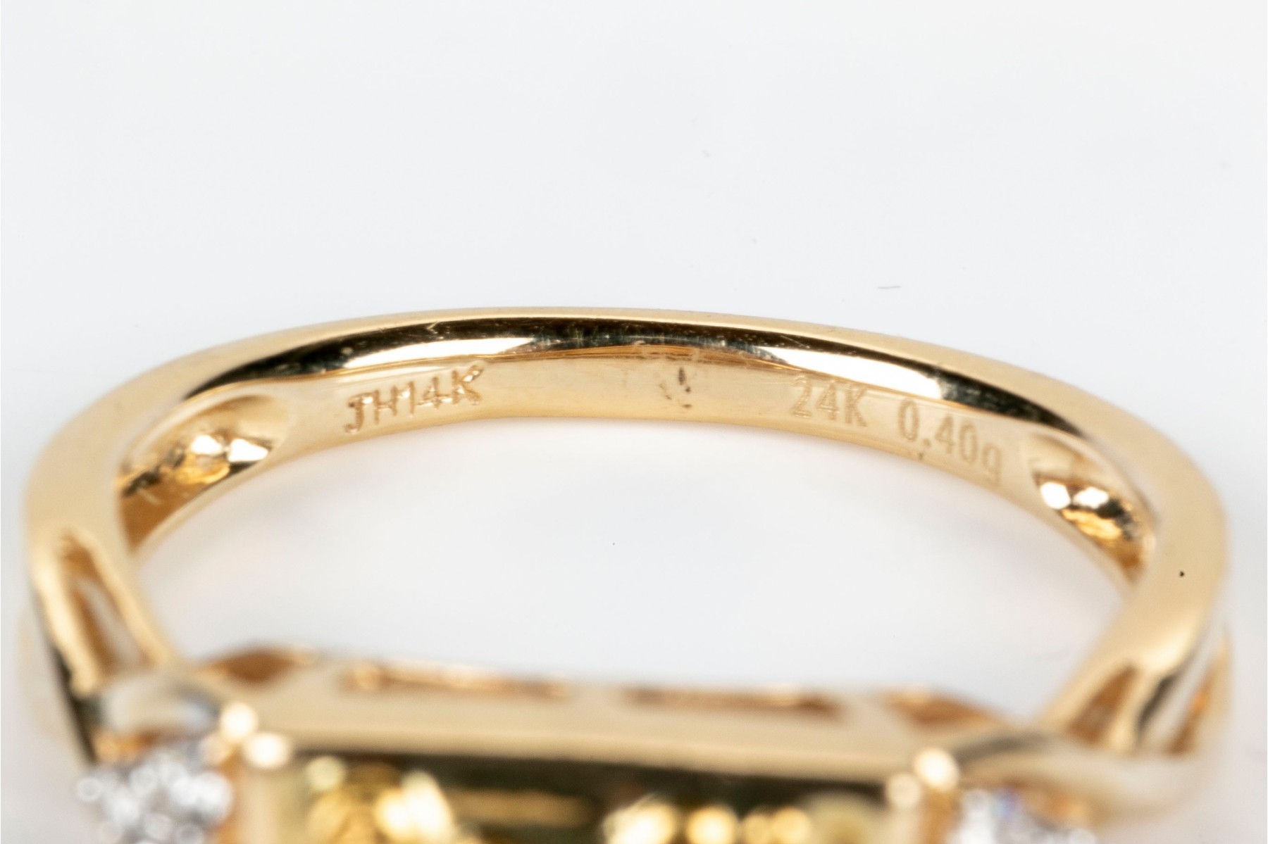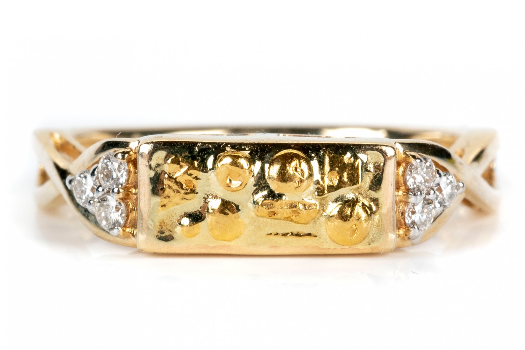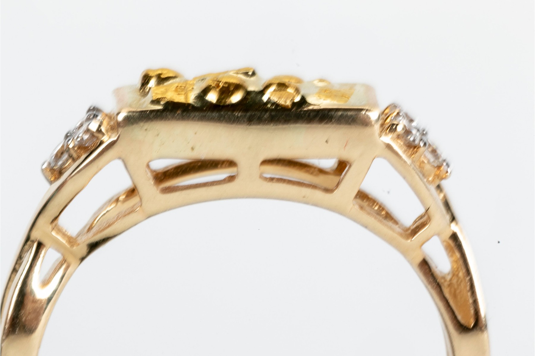 14K yellow gold ring. At the face of this 14K ring is a 24K yellow gold textured image with a bright polished finish. Flanking the image are three round brilliant cut diamonds on each side with open breaded shanks. The diamonds are approximately 0.4 TCW. Ring size 7.