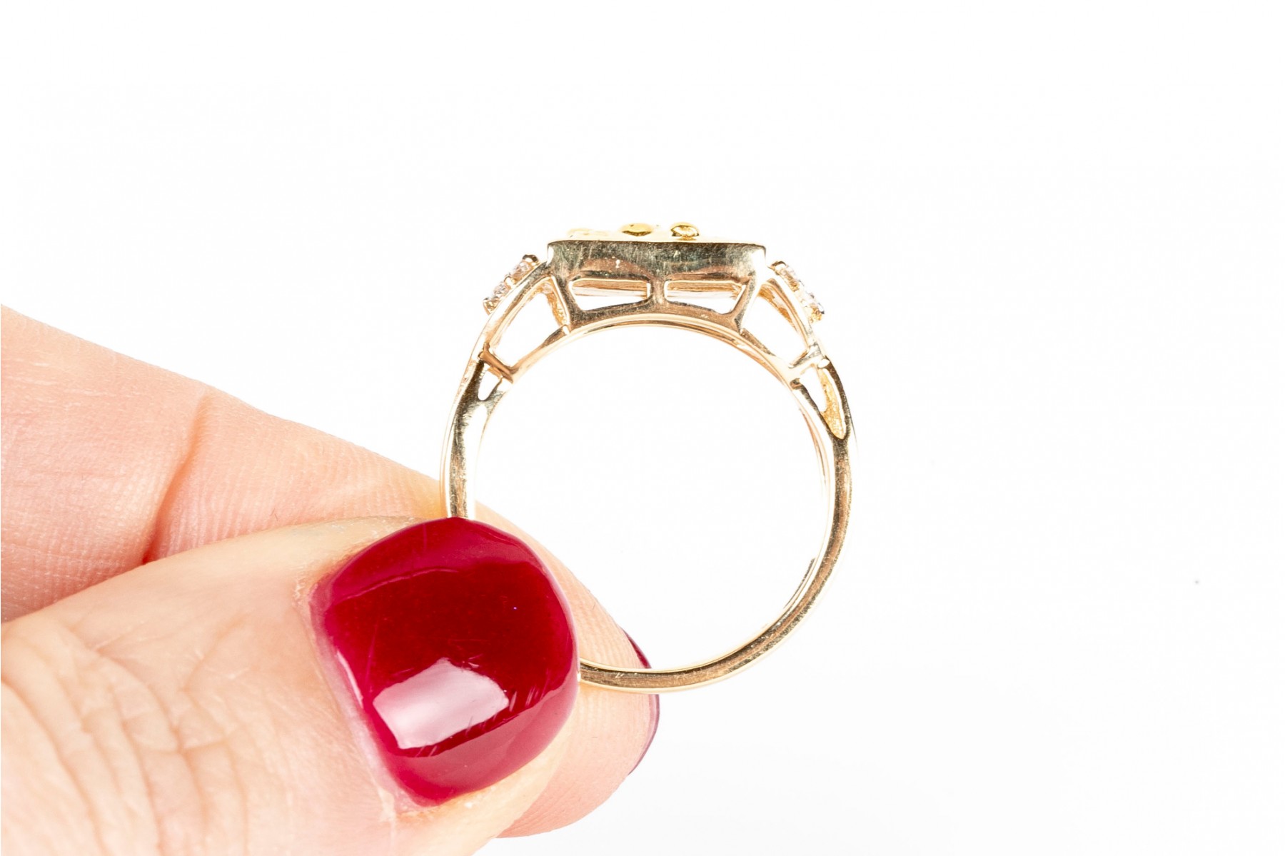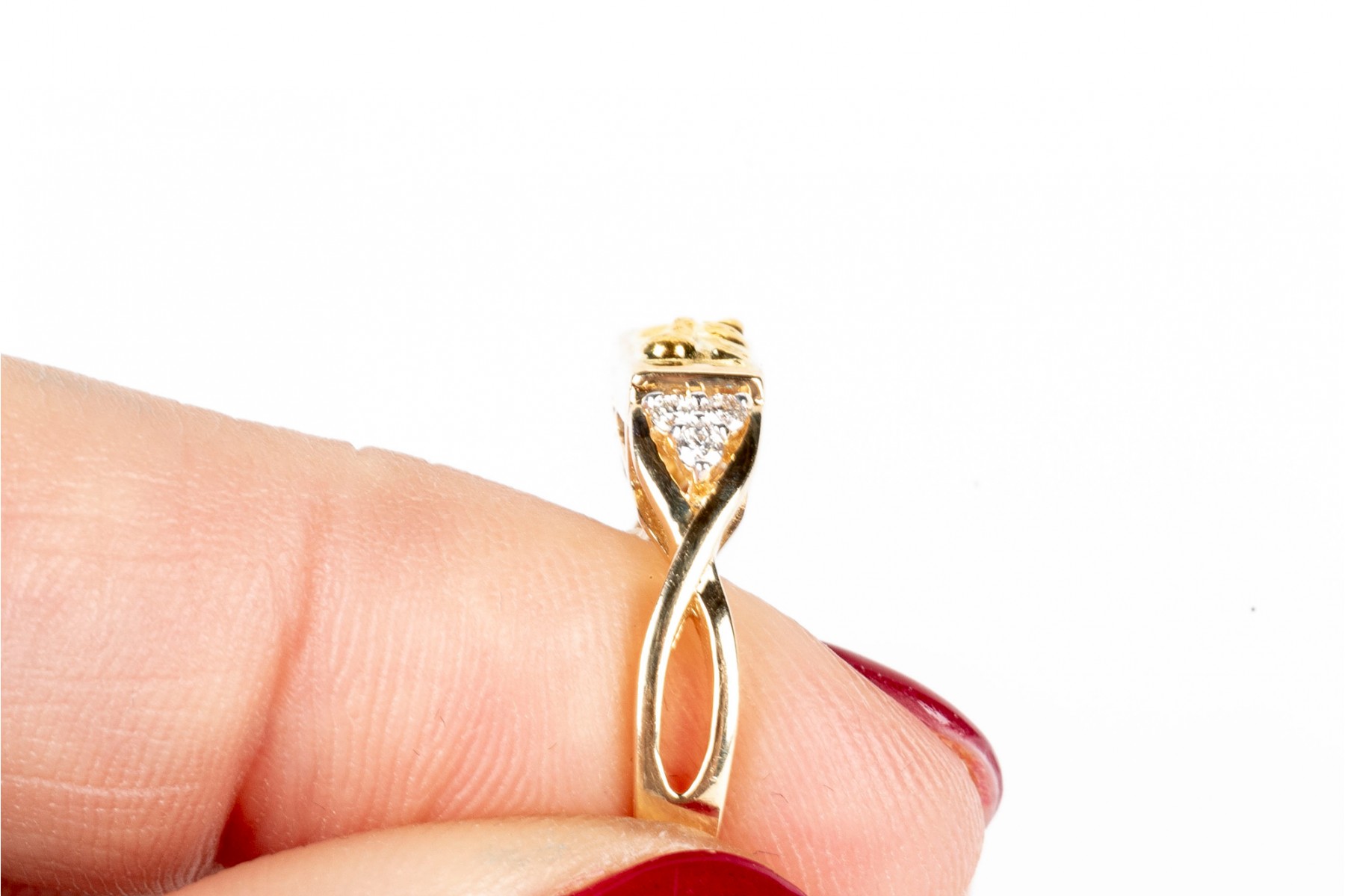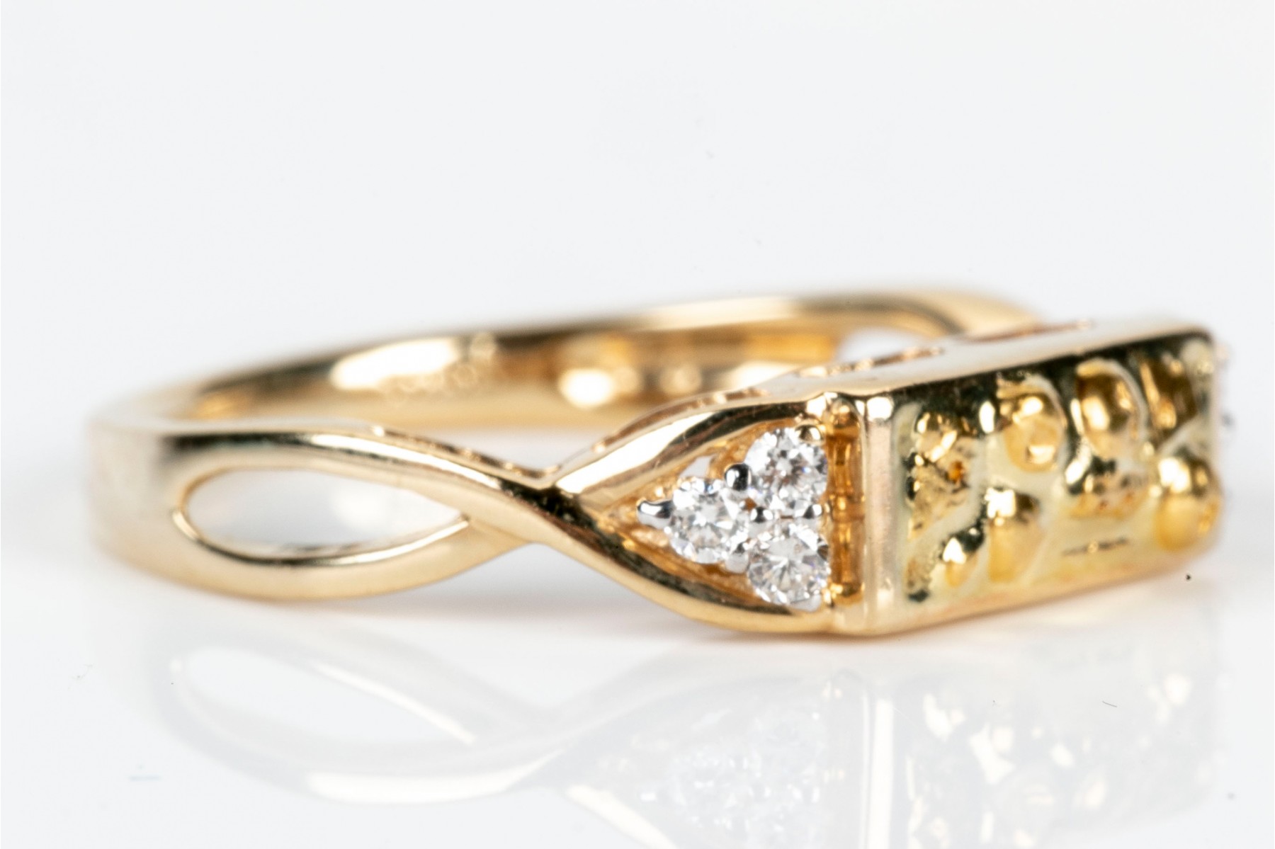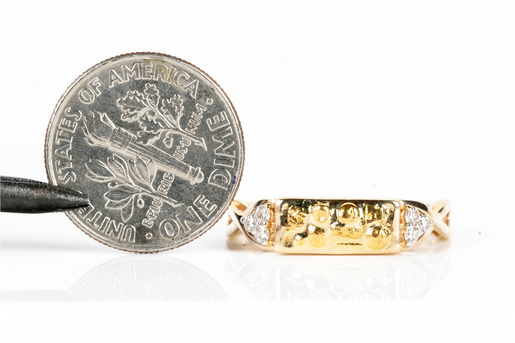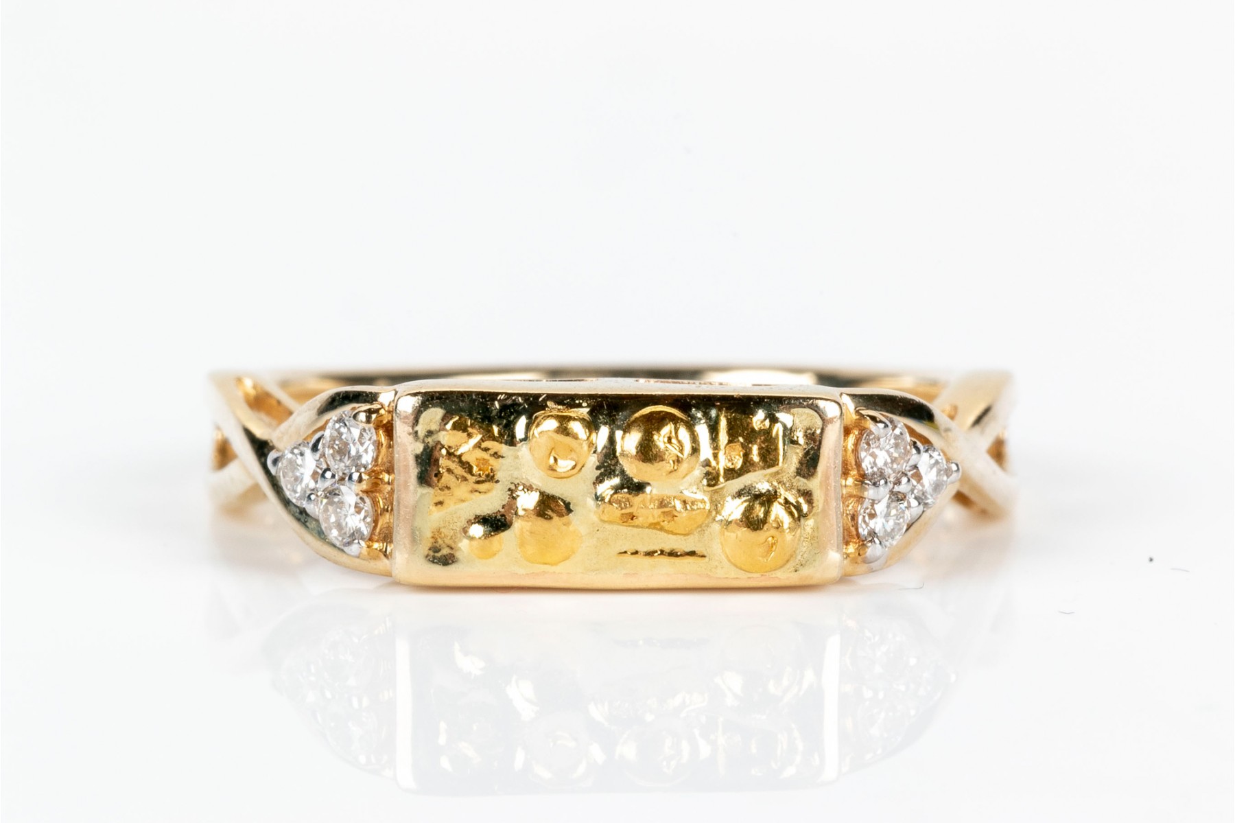 14K yellow gold ring. At the face of this 14K ring is a 24K yellow gold textured image with a bright polished finish. Flanking the image are three round brilliant cut diamonds on each side with open breaded shanks. The diamonds are approximately 0.4 TCW. Ring size 7.